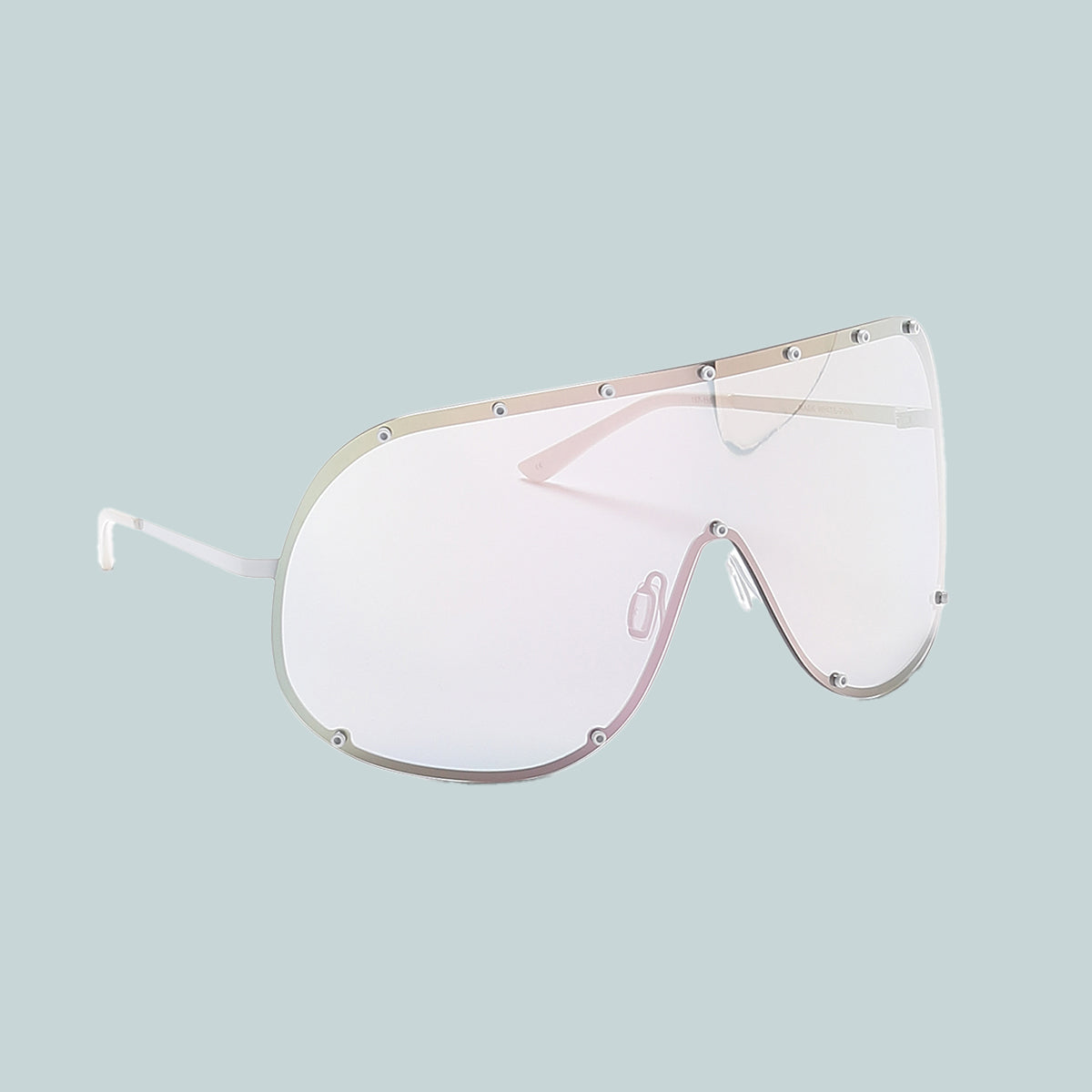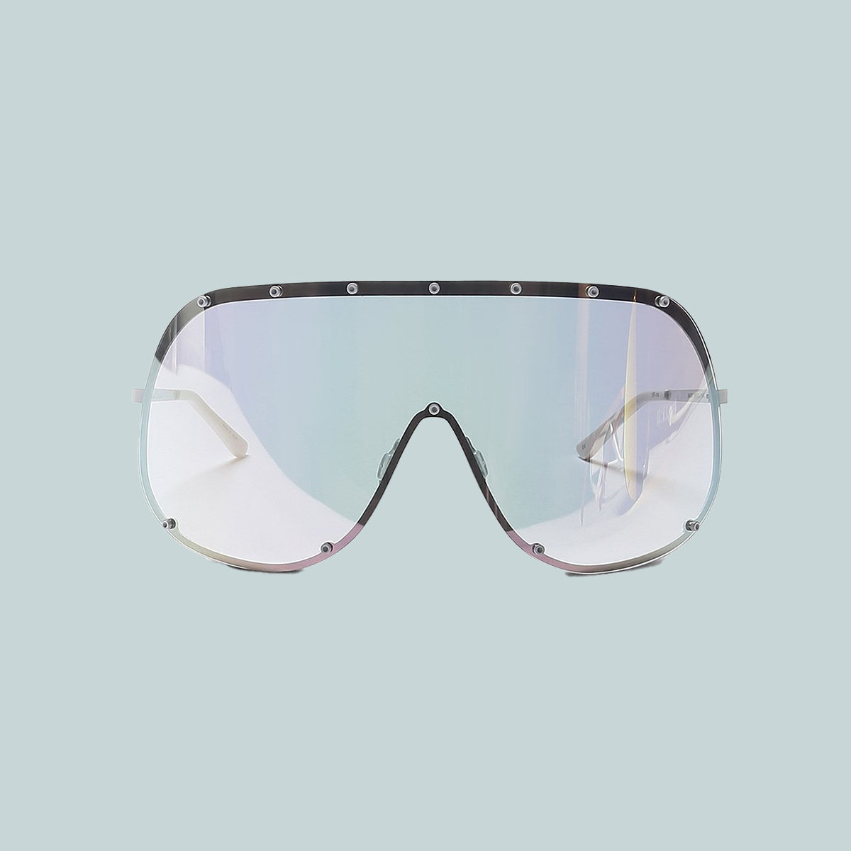 The oversized, mask sunglass infused with the allure of science fiction summons the sleek minimalism of the future with a cinematic elegance.