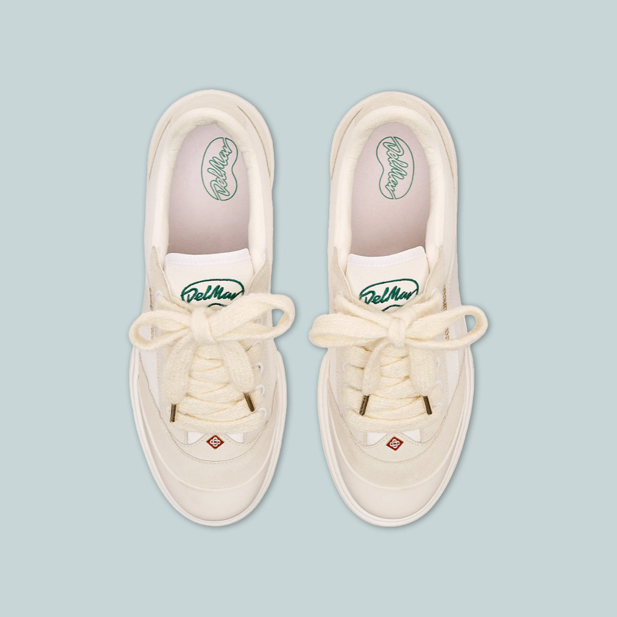 The Men's Del Mar white sneaker takes its name from the famous 1980s skatepark in California. The Del Mar sneakers are themed around classic late 70s to early 80s skate shoes. They feature a lot of the codes of the early skate shoes with canvas panelled uppers, rubber toe caps, flat sole and chunky laces, contrast eyelets and subtle branding.