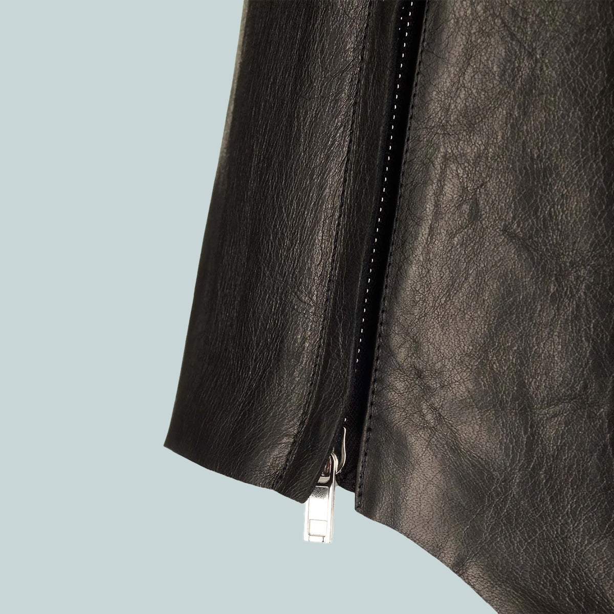 This leather tank is hip length with a rounded, raw cut, hem that dips in front and back. it has a round neckline and shoulder straps that flow into a slight racer back. it has a concealed zipper opening in the left side.