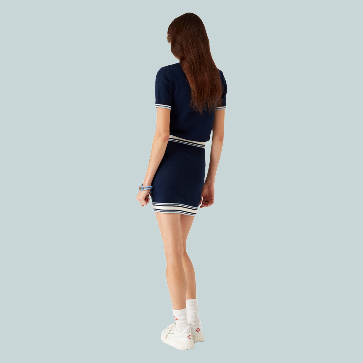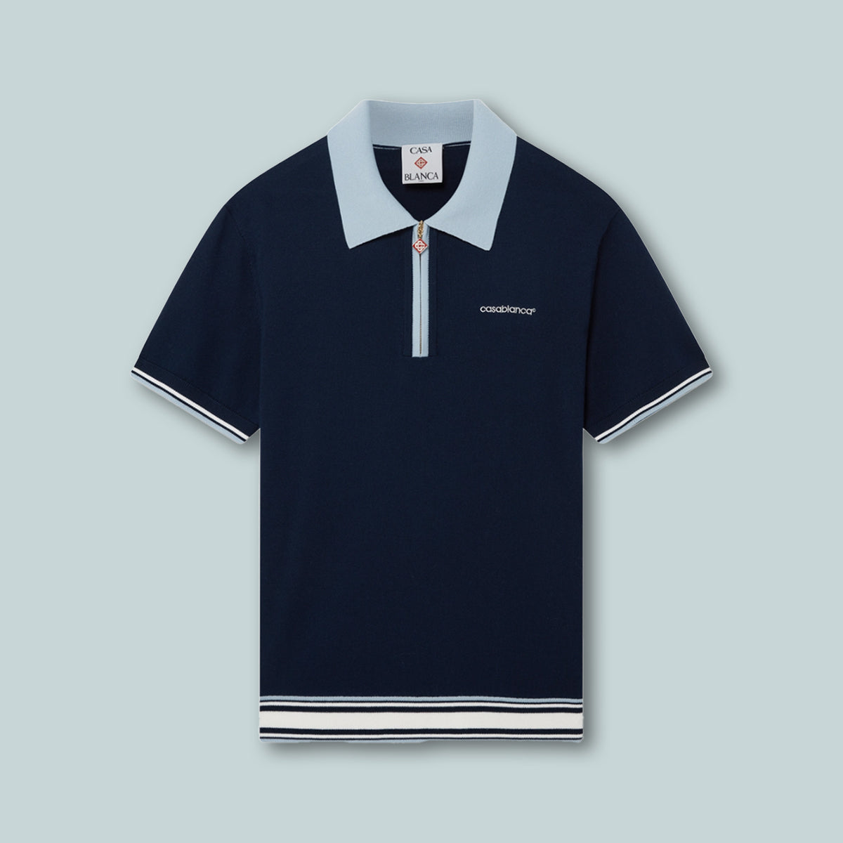 The merino knit tennis polo shirt is a short-sleeve design crafted from merino wool fabric. Completed with a zip closure, signature diamond logo zipper tab, stripe hem and cuffs details, a contrast rib collar and placket, and the house's Casablanca logo.