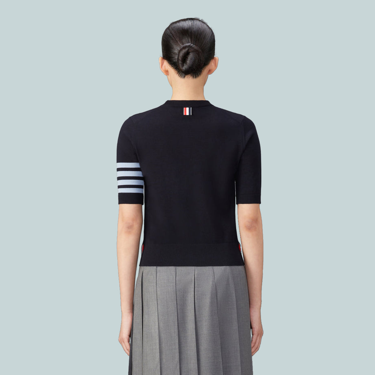 Enduring through the ages, the silhouette of this timeless tee has weathered the test of time. Adorned with Thom Browne's signature emblems throughout, this classic jersey stitch garment is meticulously tailored to perfection.