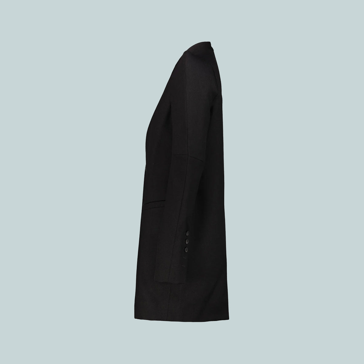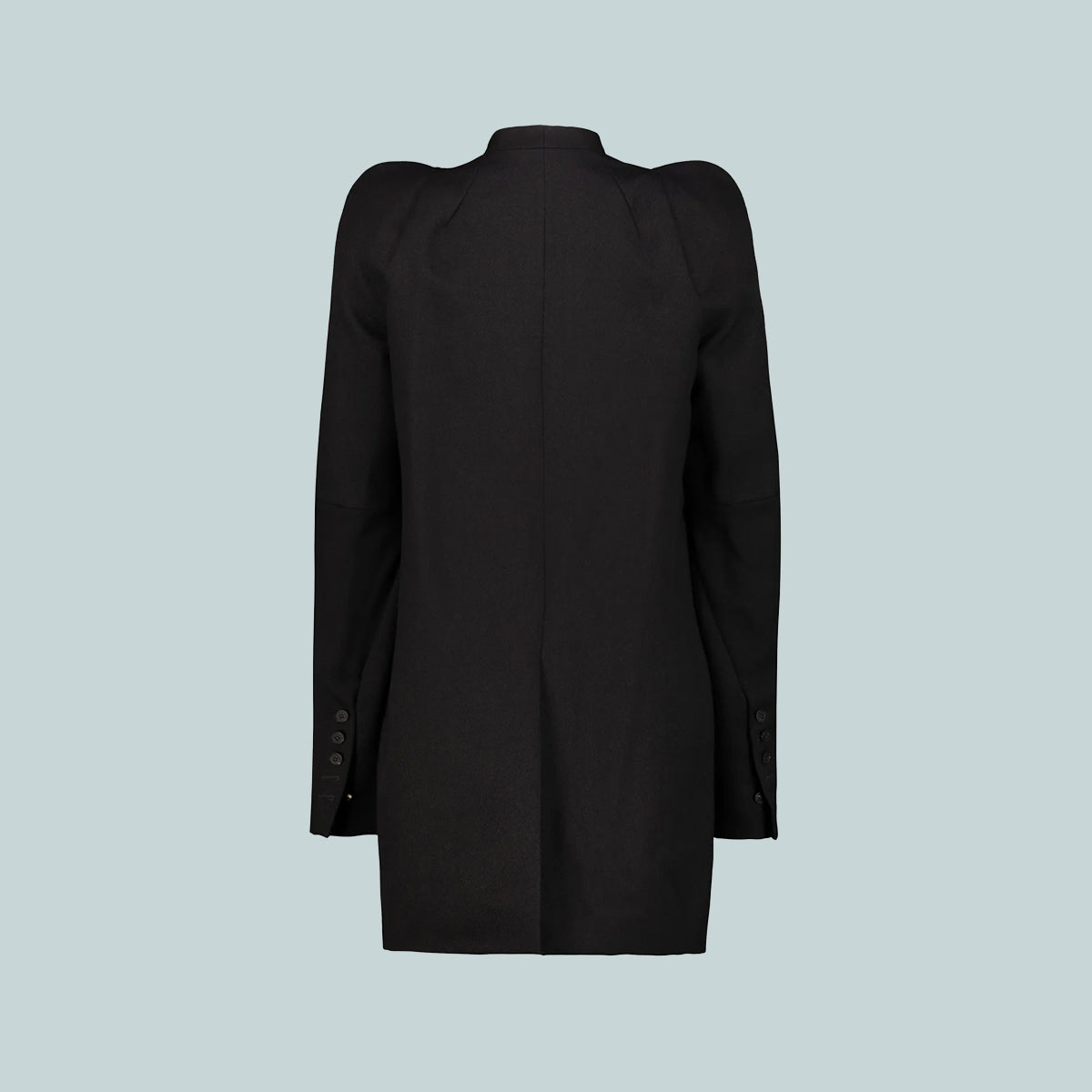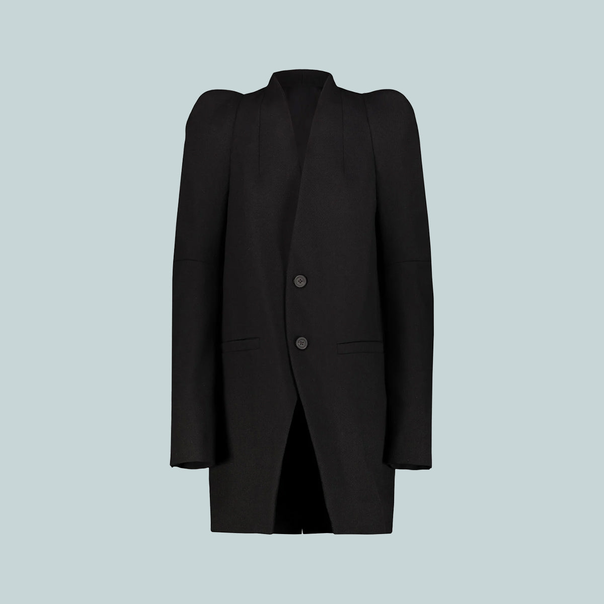 Rick Owens FW24 Porterville metro blazer in black melton. This metro blazer is mid-thigh length. It has a slight shawl collar and v neck with two button wrap. It features rounded metro shoulders, traced with ridged seams, and has long slim sleeves with 5 button cuffs. It has side front welt pockets, a back yoke and centre back vent. It is fully lined and has two internal buttoned pockets. This mediumweight and compact wool melton has a flat, matte finish and a soft handfeel.
