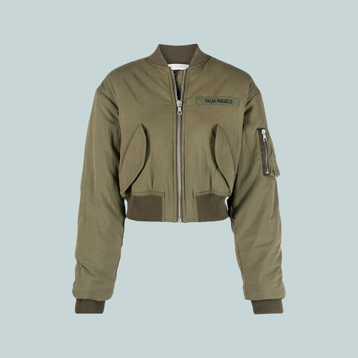 Cropped bomber jacket with a multi-pocket design from Palm Angels. Silver-tone metal hardware. Logo patch at the chest. Stretch rib cotton cuffs, hem and collar.