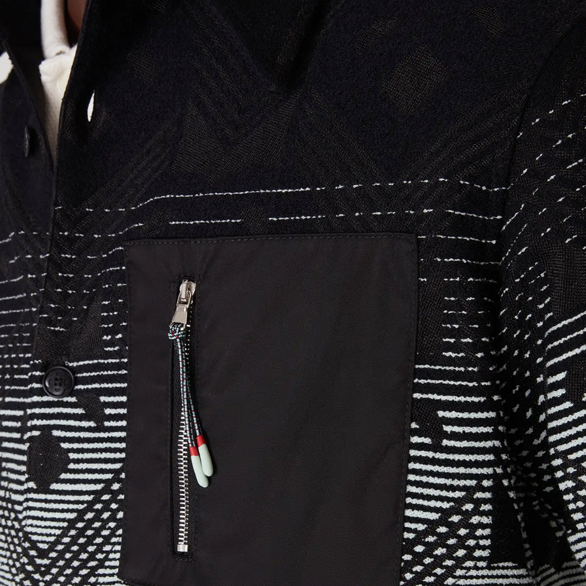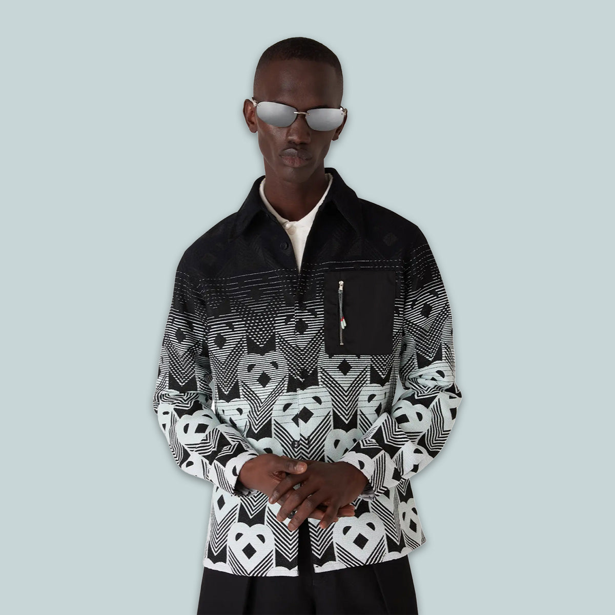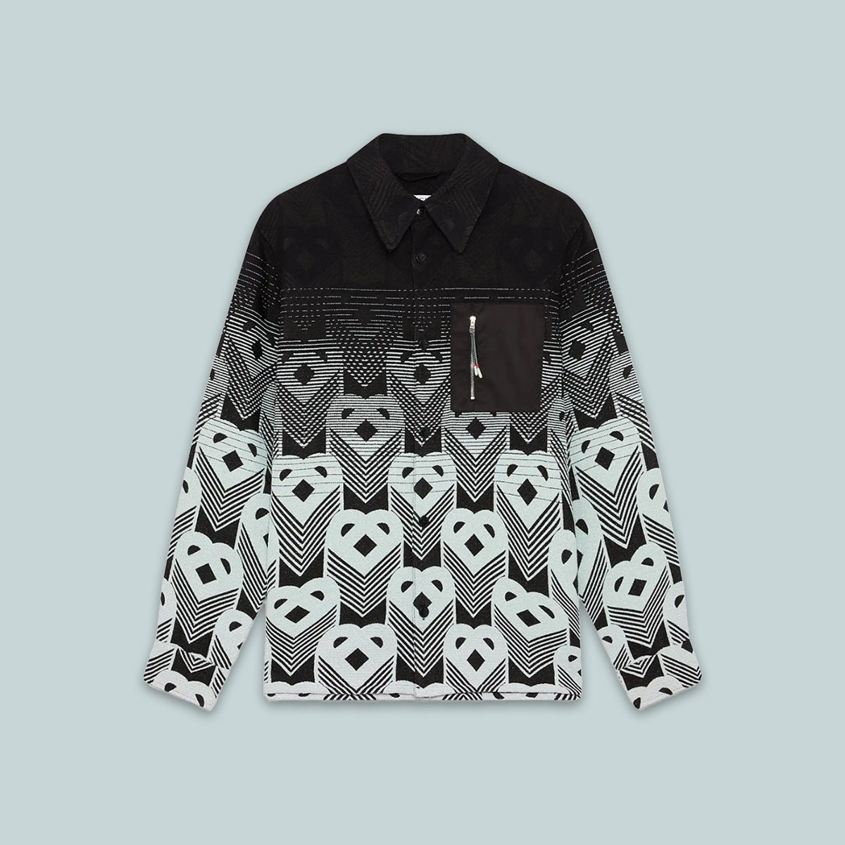 The Monogram gradient shacket is a long-sleeve design crafted from a jacquard boucle fabric. Completed with a collar, a breast pocket, button closure, and branded gold-plated buttons.