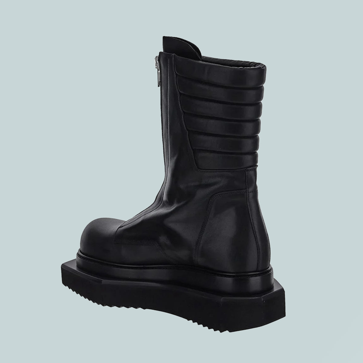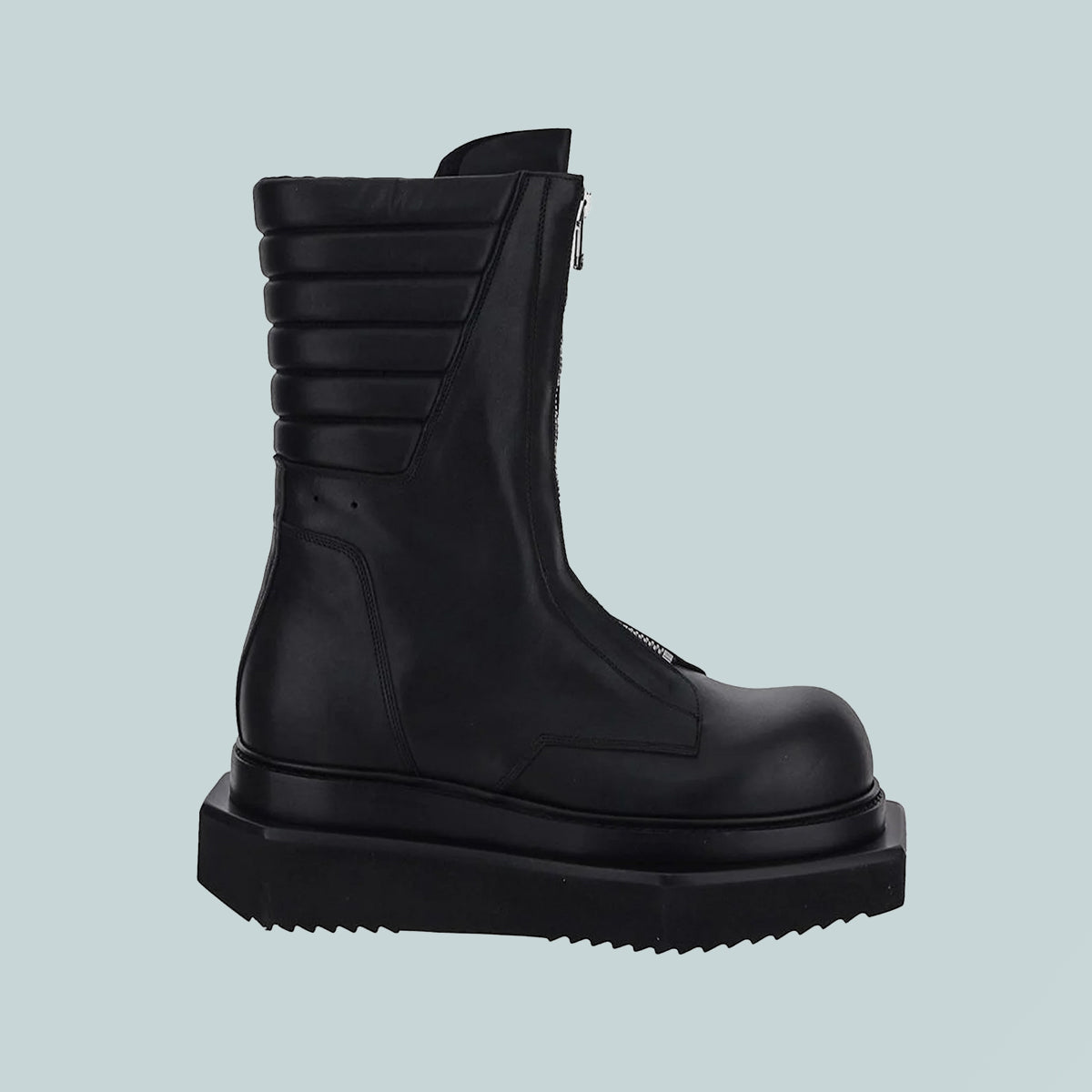 These moto cyclops are mid-calf height. their upper has geometric panels, a padded upper back with lines of topstitching. it also features a zipper running down the centre front, allowing them to be worn zipped closed, or open to expose a large inner tongue panel with a beveled top. they have a rubber cyclops mega creeper sole.