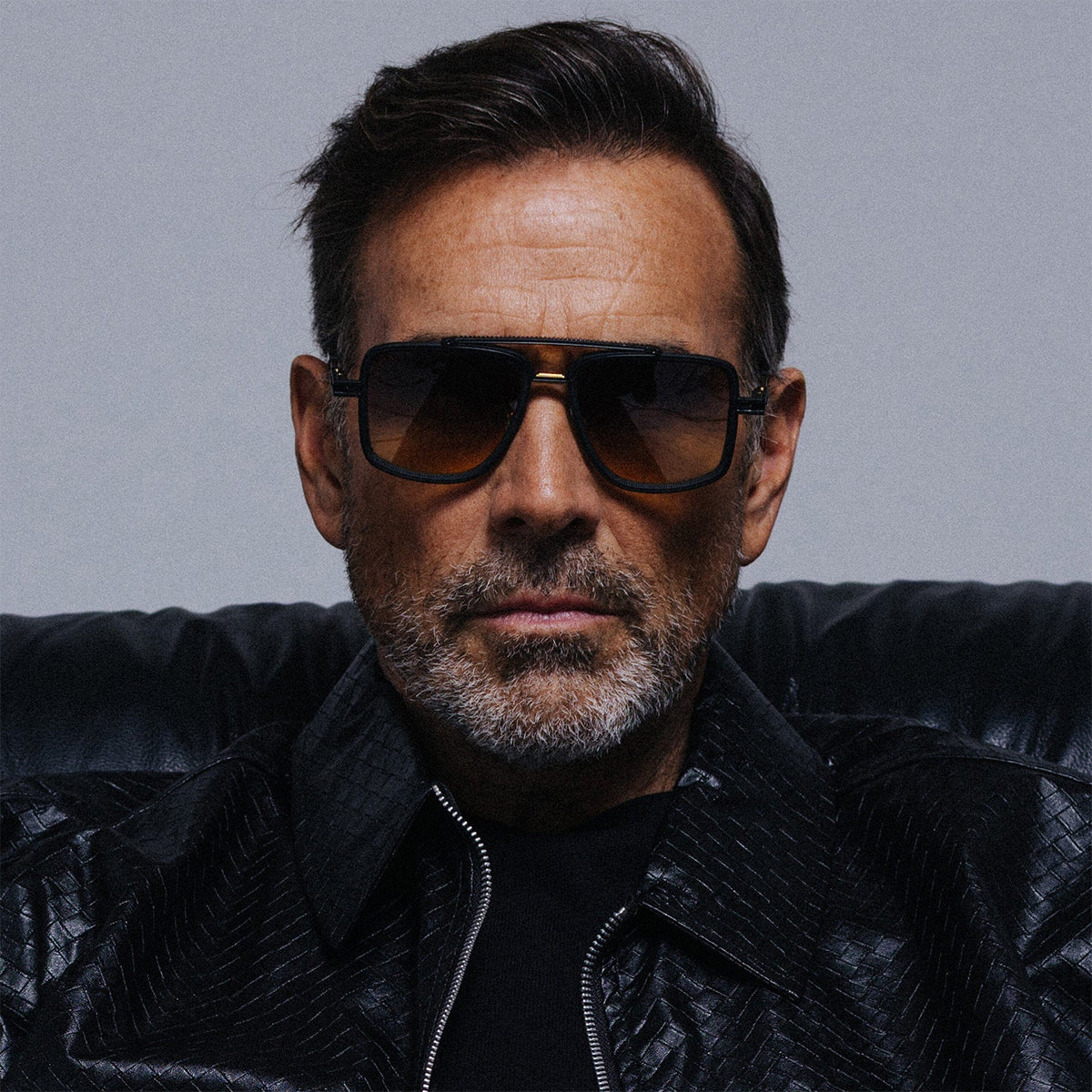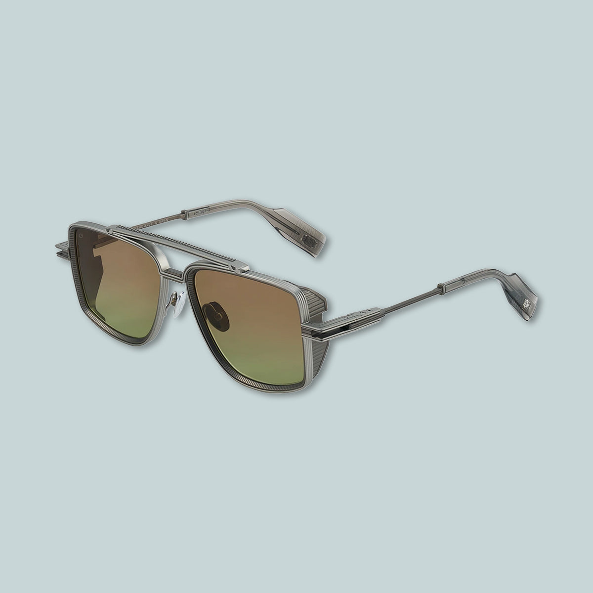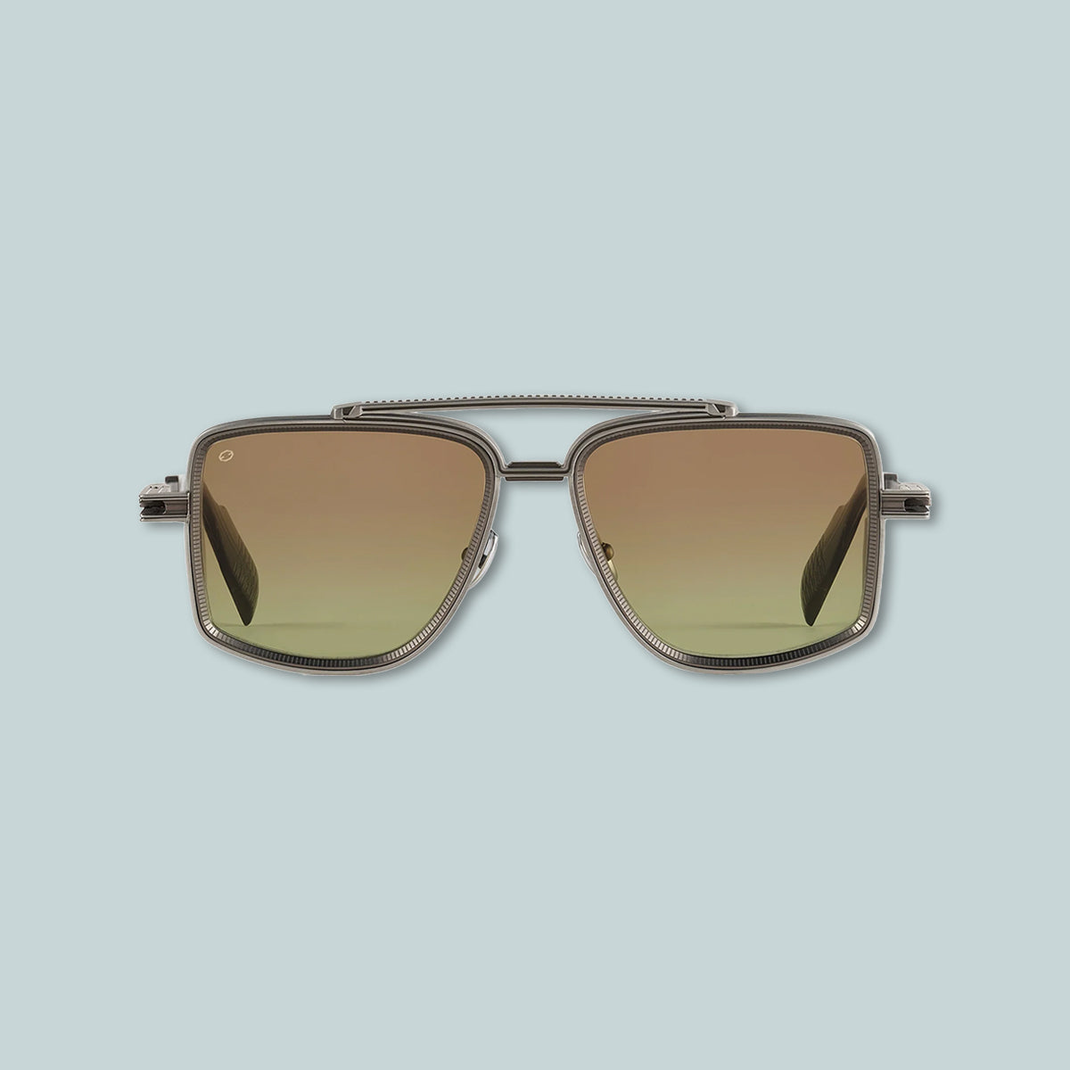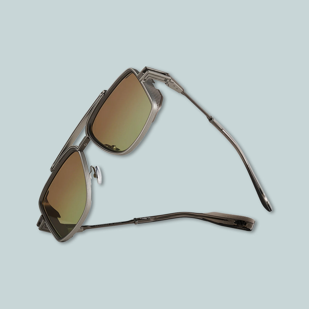 Combination temple arm construction with two-tone components, including an acetate temple tip with embedded Art Deco-style décor. Signature Outfitted with adjustable titanium nose pads.