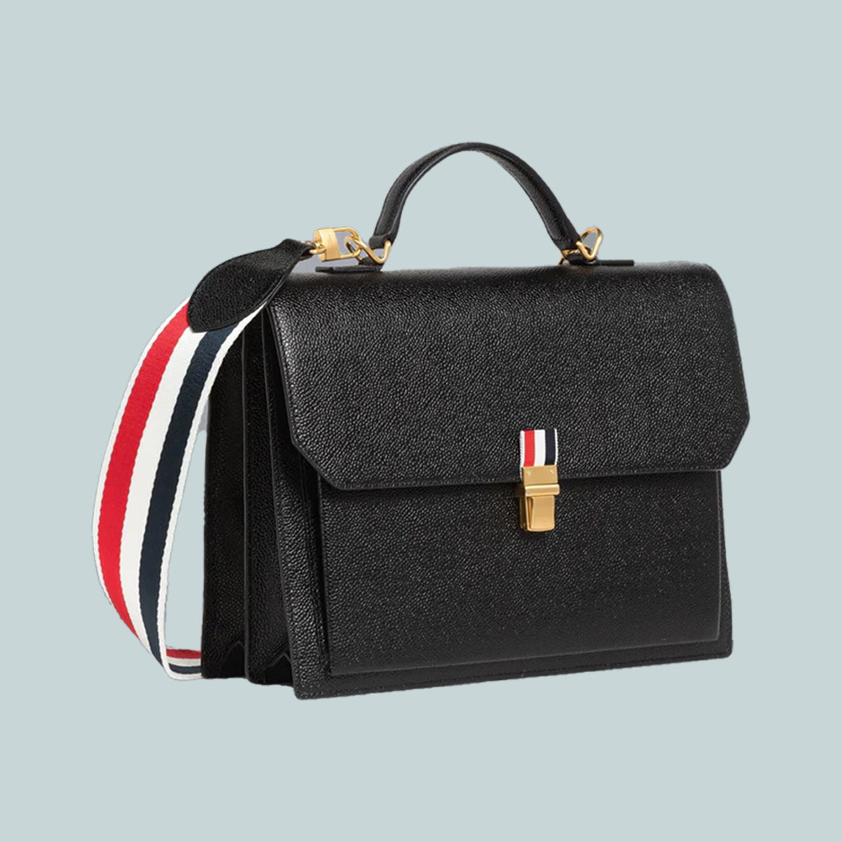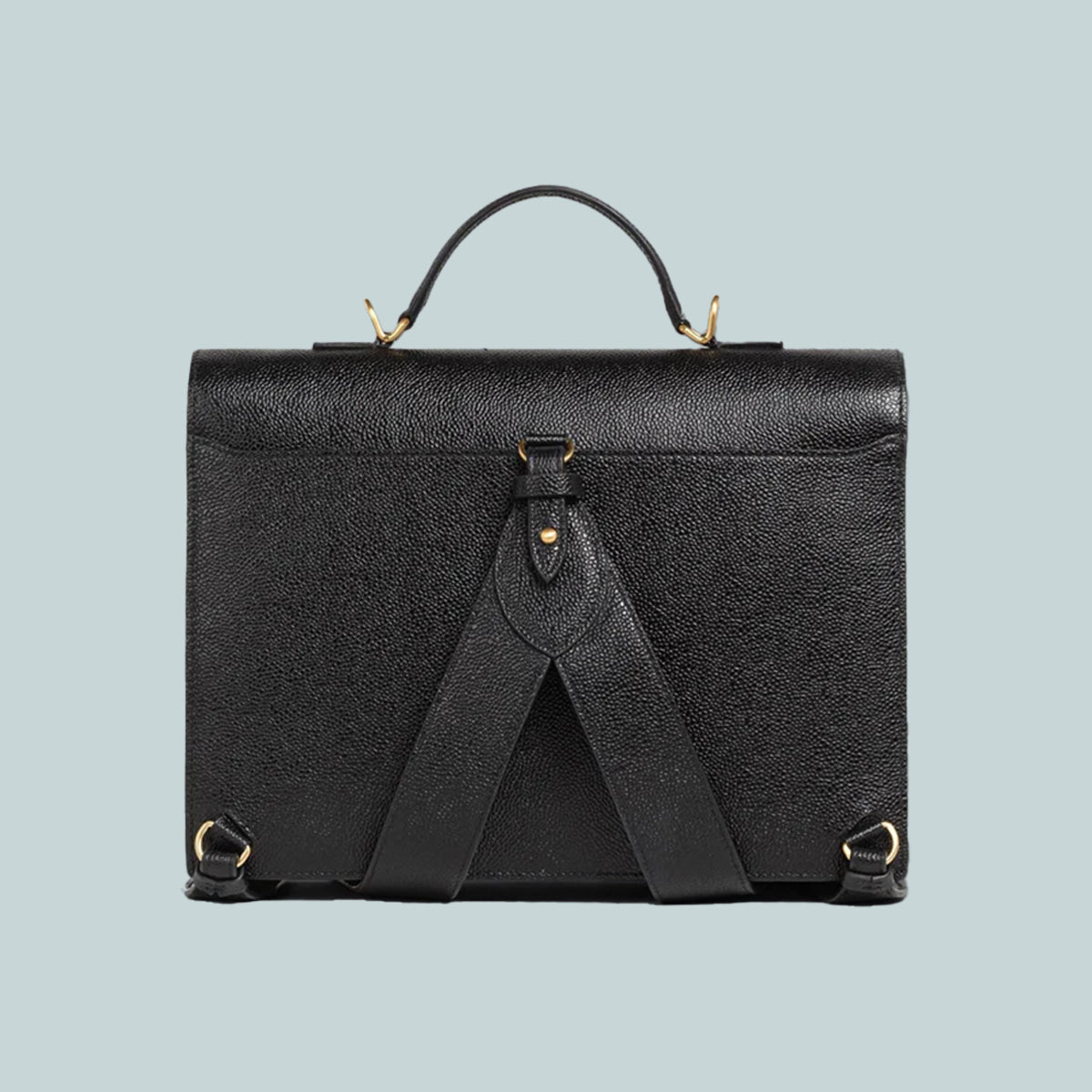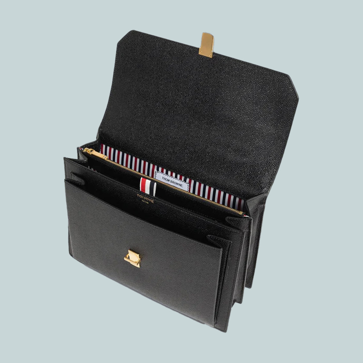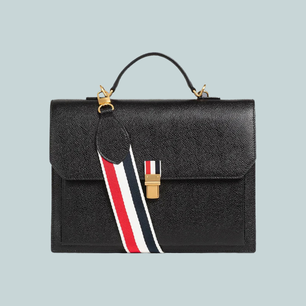 School bag in black pebble grain leather with removable striped webbing wide shoulder strap. Flap top with brass clasp. Leather top handle, leather backpack straps. Bisected interior with zip compartment and front pocket. Striped lining. Gold foil printed at interior front pocket. Brass hardware. Signature striped grosgrain loop tab at interior.