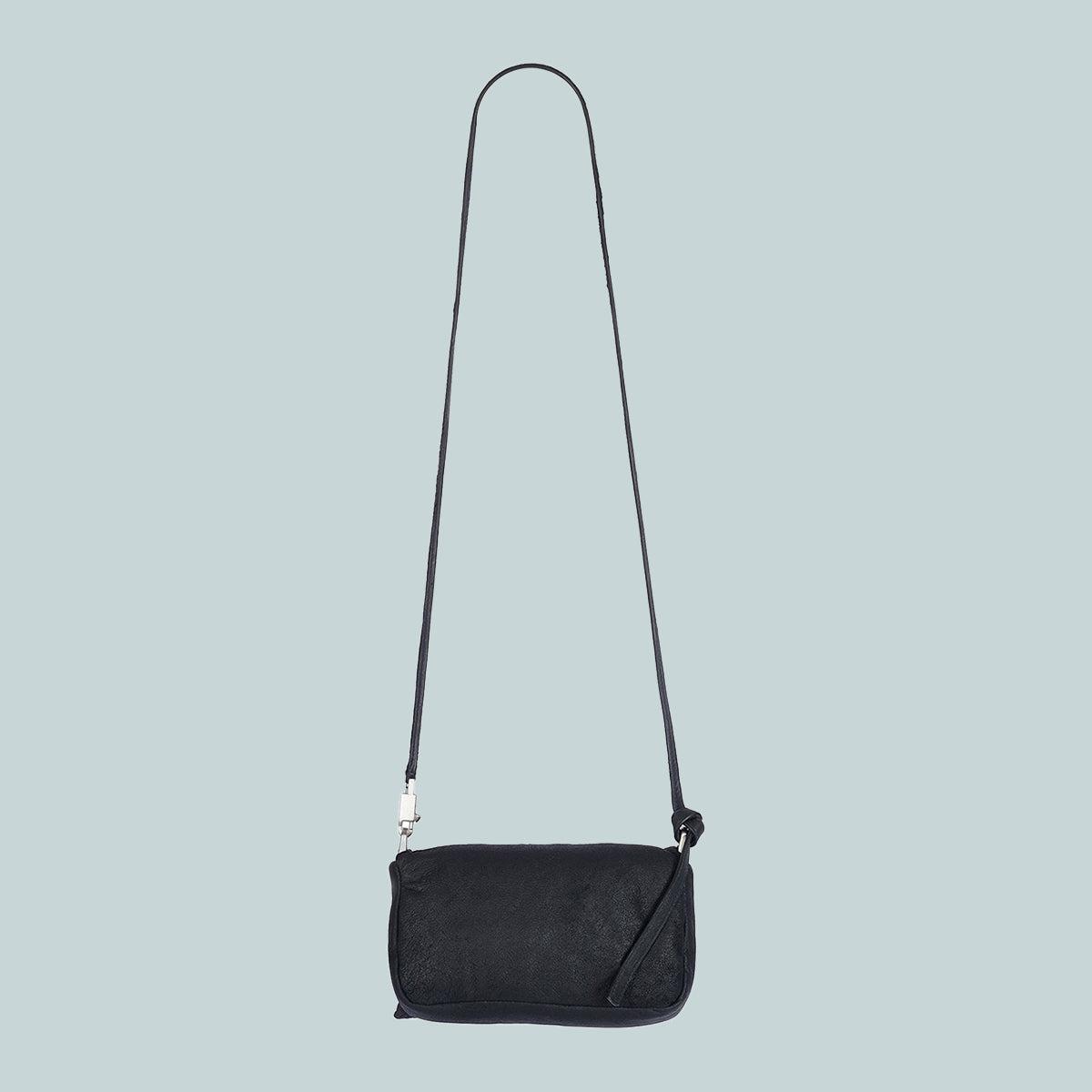 this pillow griffin is a small rectangular, soft padded bag, with a front flap, with a palladium indented easy-grip bevel and magnetic closure. it has one ponticello d-loop on front, an inner pocket with 9 card slots and a second inner zippered pocket. it features a long thin leather strap with a palladium tone brass hook which ties on one side, or can be detached to create a clutch.