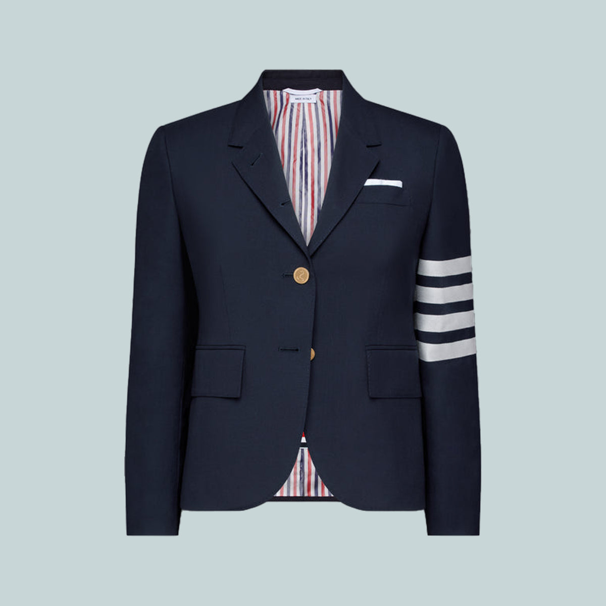Our Plain Weave Suiting Engineered 4-Bar High Armhole Sport Coat embraces a slimmer fit taken from punk influences, while remaining true to Thom Browne's classic heritage. Pair with our Plain Weave Suiting Skirts or Trousuers.