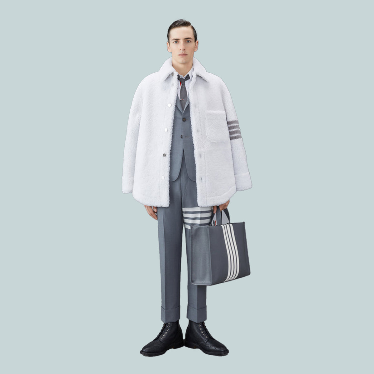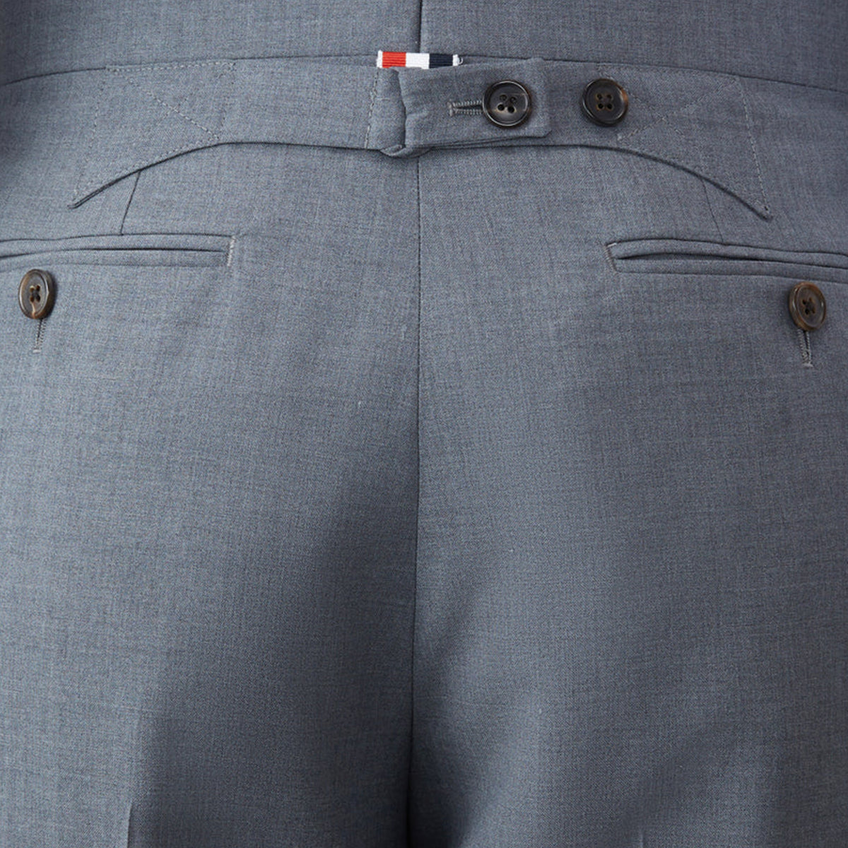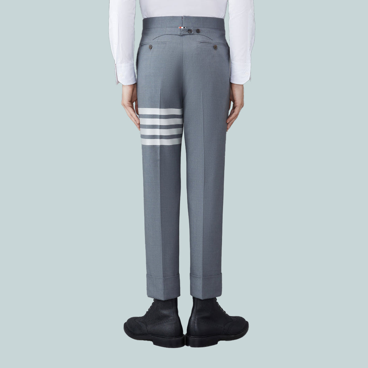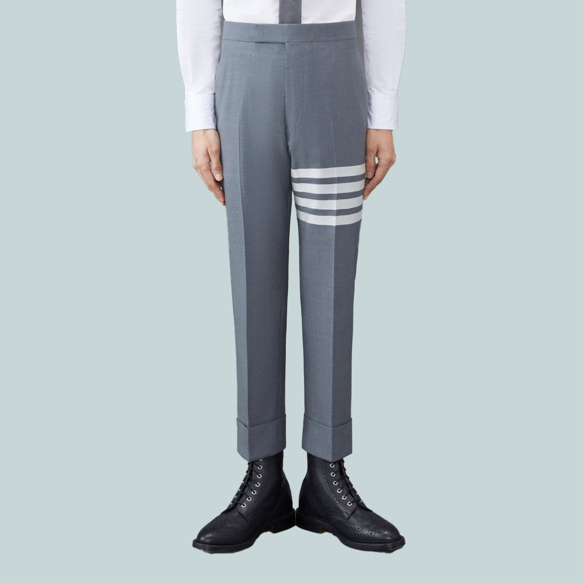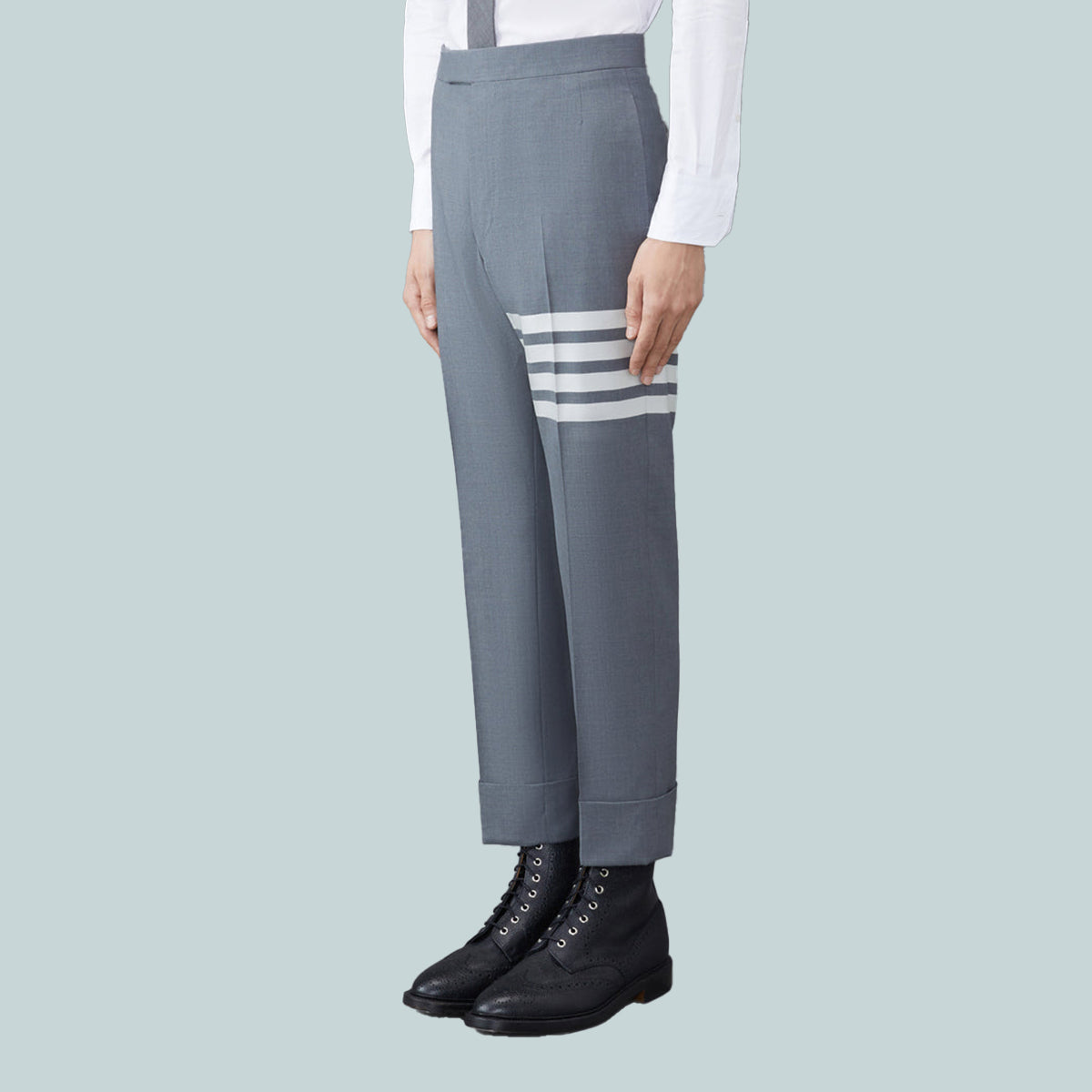 Our Plain Weave 4-Bar Backstrap Trouser. The classic shortened hem pays homage to Thom Browne's distinguished tailoring.