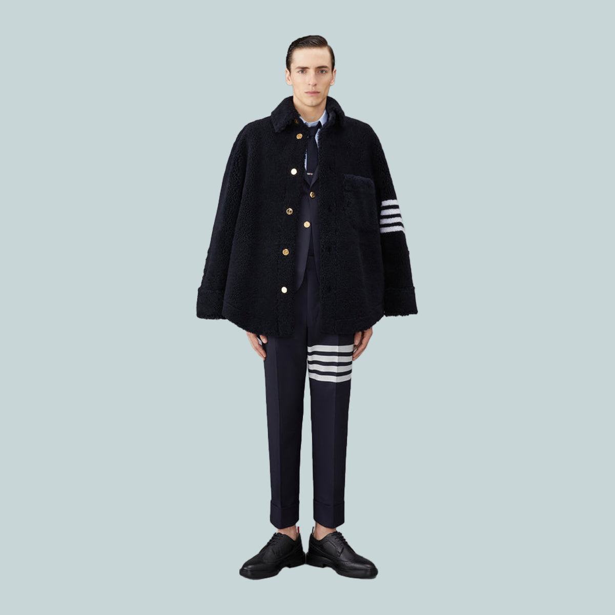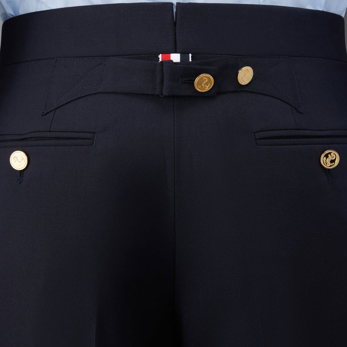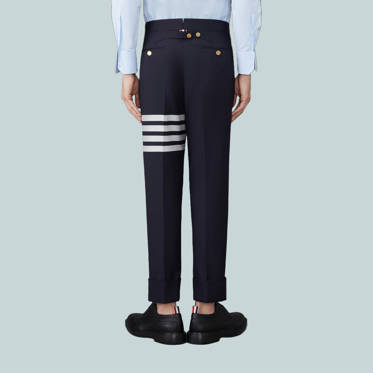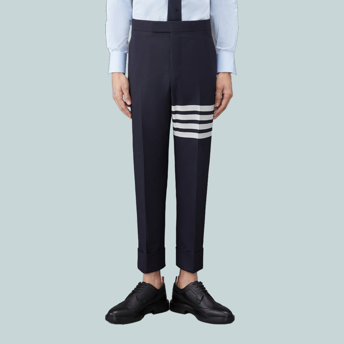 Our Plain Weave 4-Bar Backstrap Trouser. The classic shortened hem pays homage to Thom Browne's distinguished tailoring.