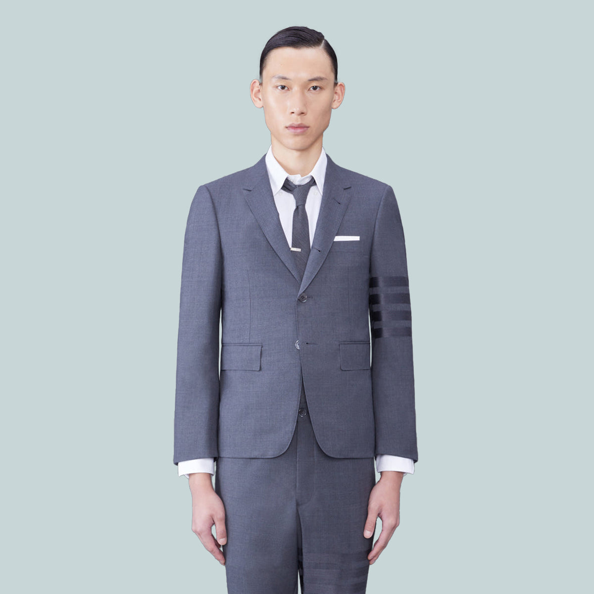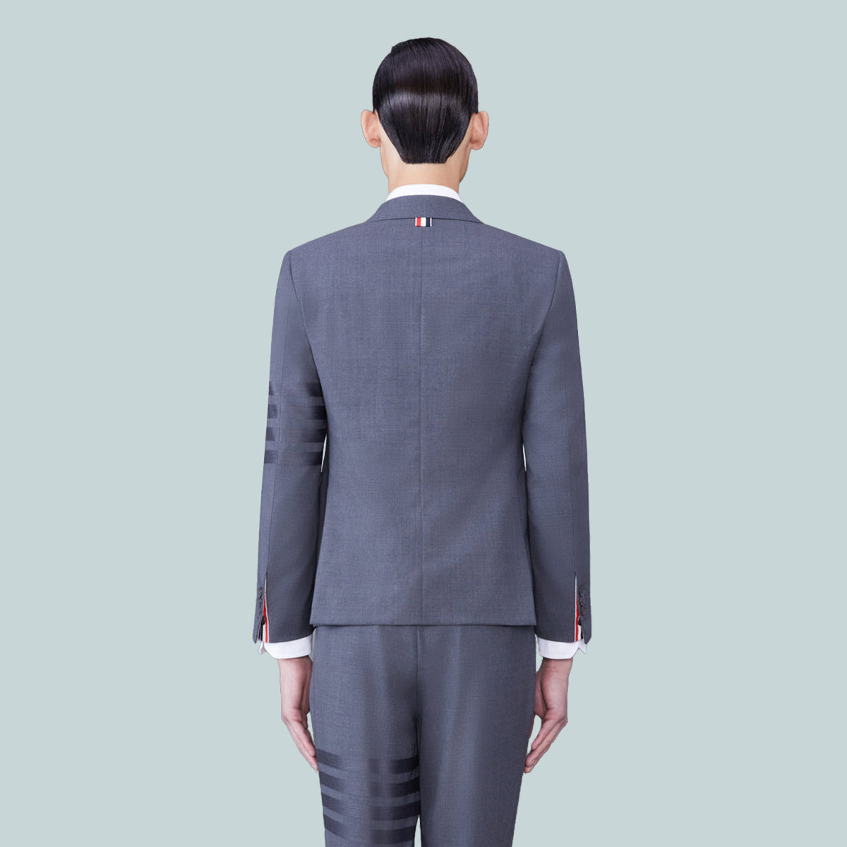 Classic sport coat in grey plain weave suiting with tonal 4-bar stripe detail at left sleeve. 2-button front closure, notched lapels, 2 flap front pockets, single chest pocket. Buttoned cuffs with signature striped grosgrain trim. Double vented back hem. Striped lining with interior pockets and name tag. Signature striped grosgrain loop tab at back of neck. Classic - Fit 1.