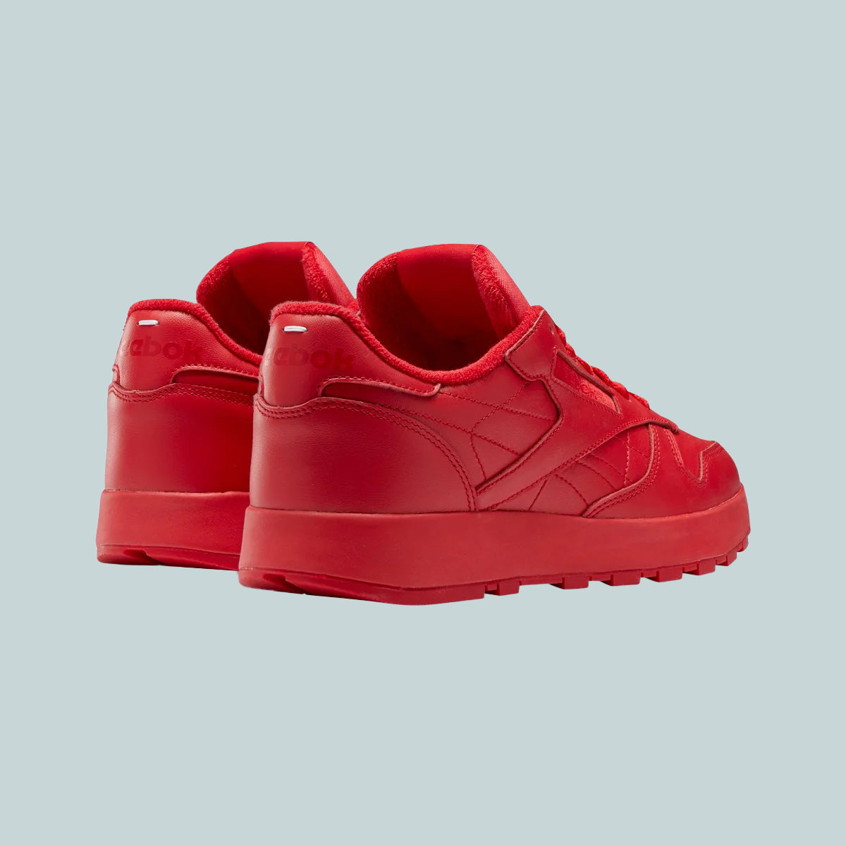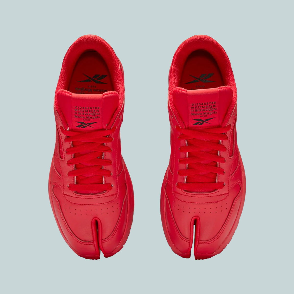 Maison Margiela's signature Tabi toe in collaboration with Reebok's Classic Leather sneakers. A low-top paneled buffed nappa leather sneaker with matching Tabi socks. Lace up closure. Textile logo patch at padded lounge. Logo patch at outer side. Flat rubber sole. Textile lining.