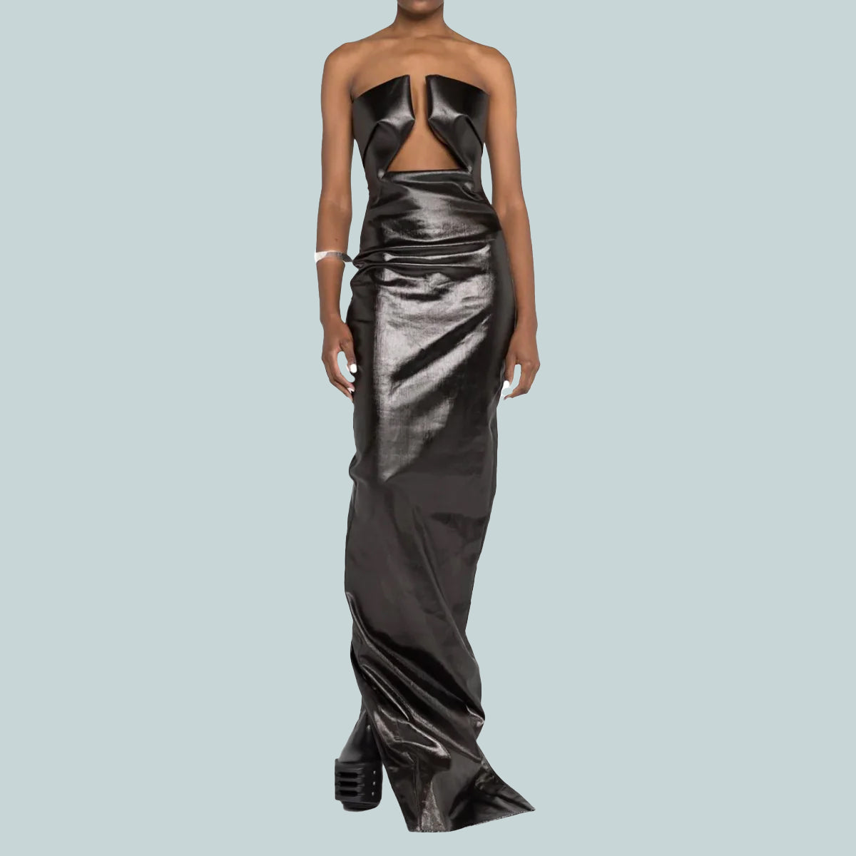this prong gown is floor length. it features a strapless structured bodice with a boned geometric cut-out front and folded bust detail. it has a tight fitting skirt that tapers slightly to the ankle, with a high centre back split, and exposed zipper closure.
