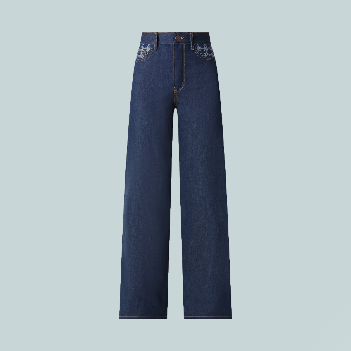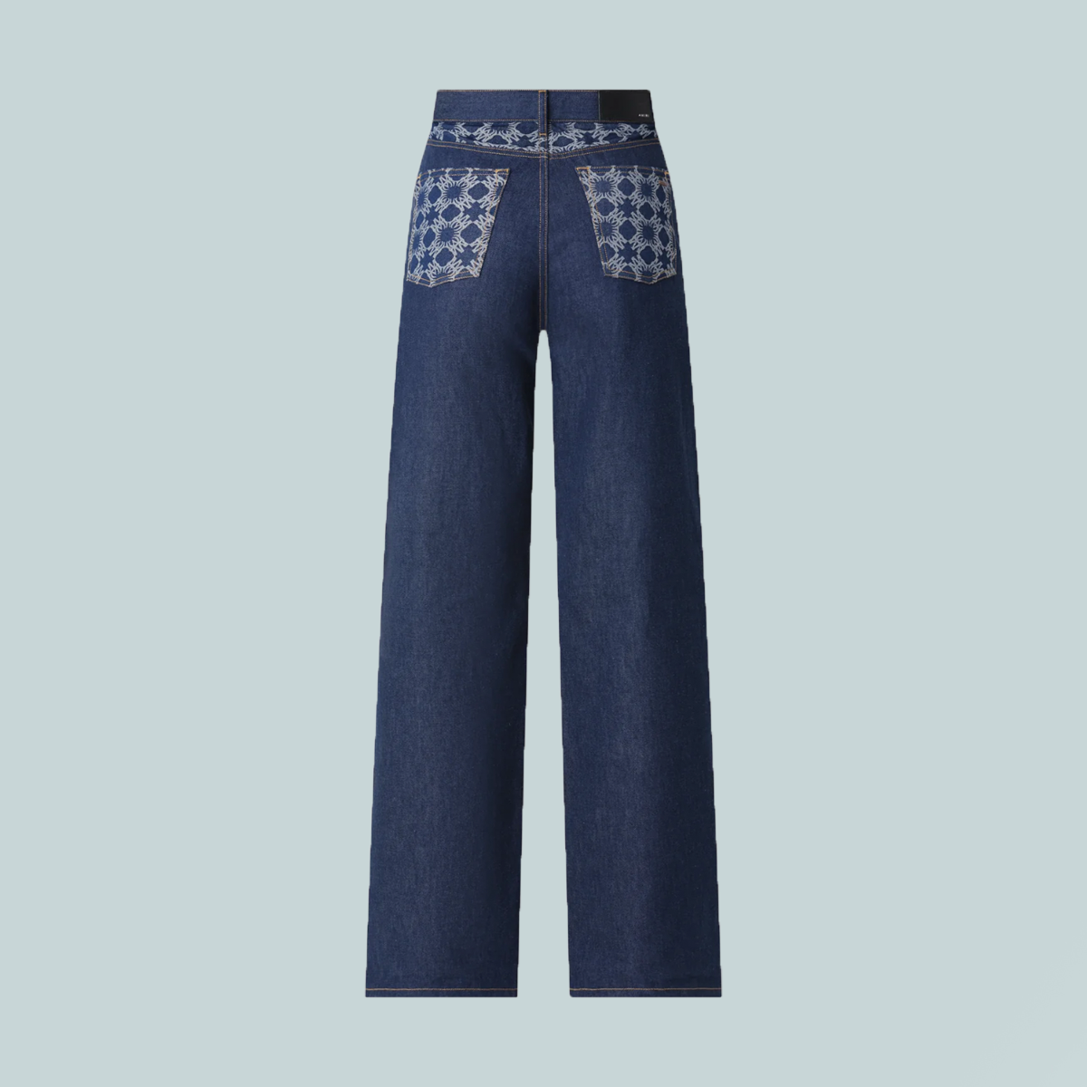 For Pre-Spring 2025, MA Quad monogram print appears in house signature denim silhouettes. The MA Quad High Rise Wide is designed with classic five-pocket construction and MA Quad monogram denim on pockets.