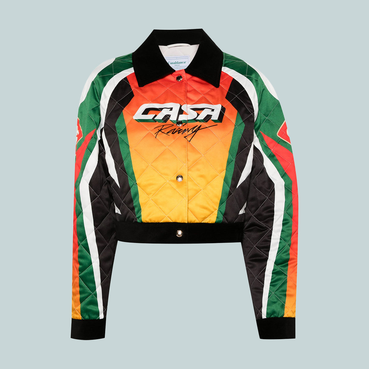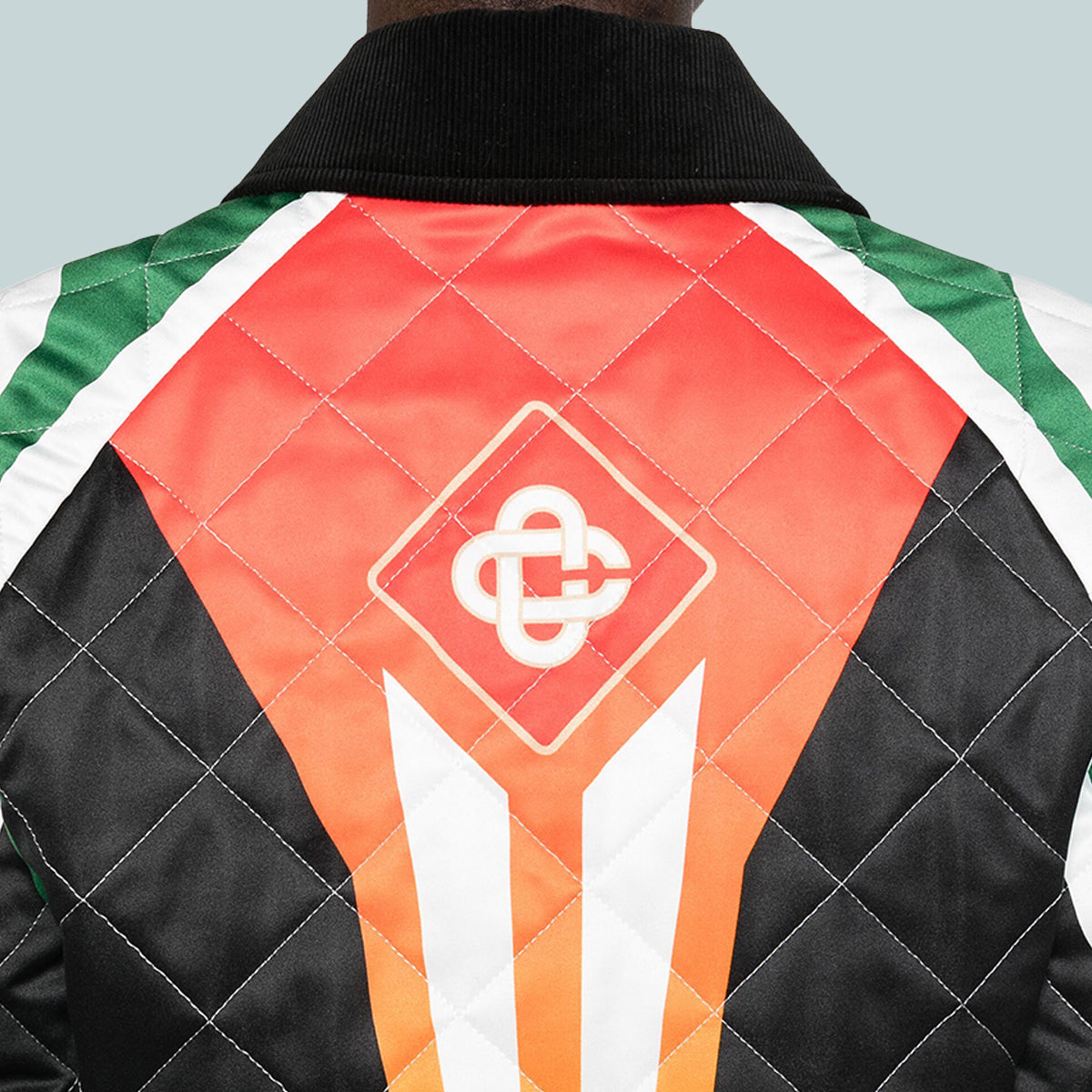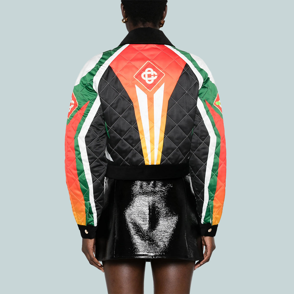 A multicolor bomber jacket by Casablanca embellished with a geometric pattern print and diamond quilting. Featuring a classic collar, slip pockets at the side, a front press-stud fastening, a straight hem, and a logo print at the front.