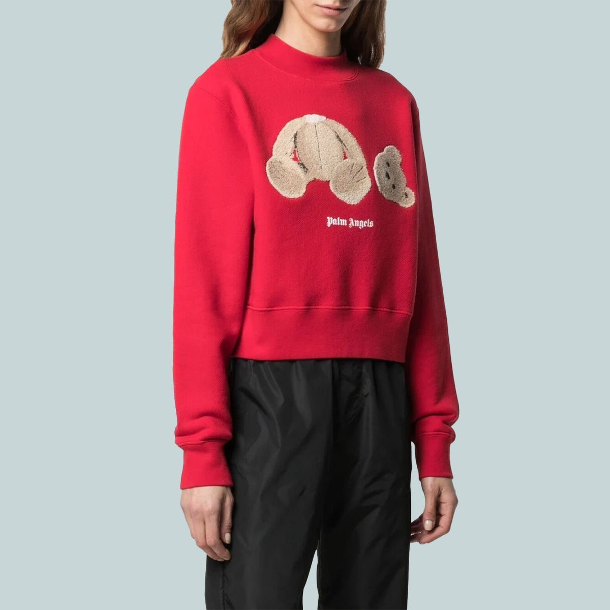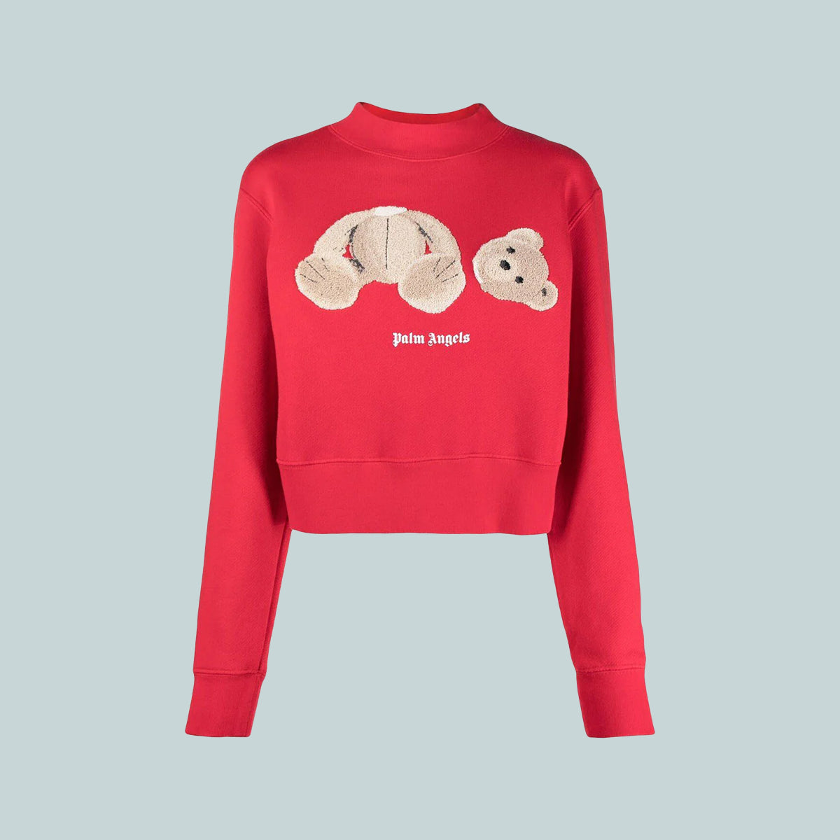 Cotton long sleeve sweatshirt in red with the Palm Angels signature bear motif embroidered at front. Rib knit cuffs and hem. Crewneck collar.