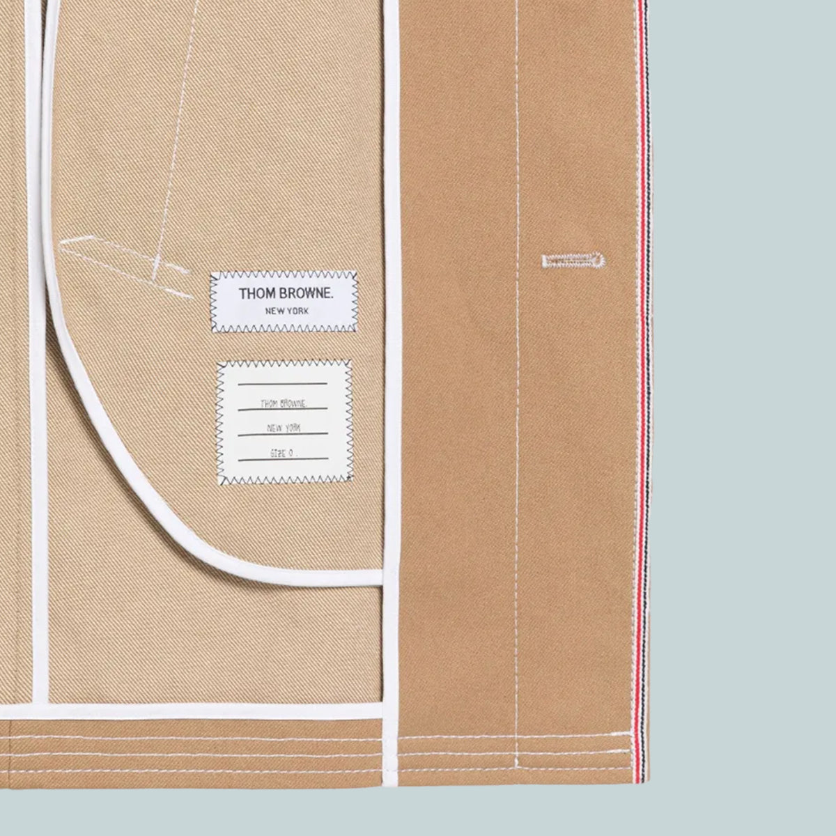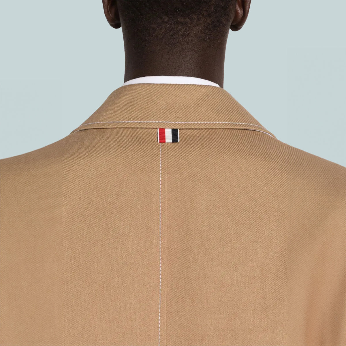 Bal collar overcoat in camel selvedge denim with white track stitching. Front button closure, slant welt side pockets, buttoned cuffs, buttoned double back vent. Unlined. Signature striped grosgrain loop tab at back of neck.