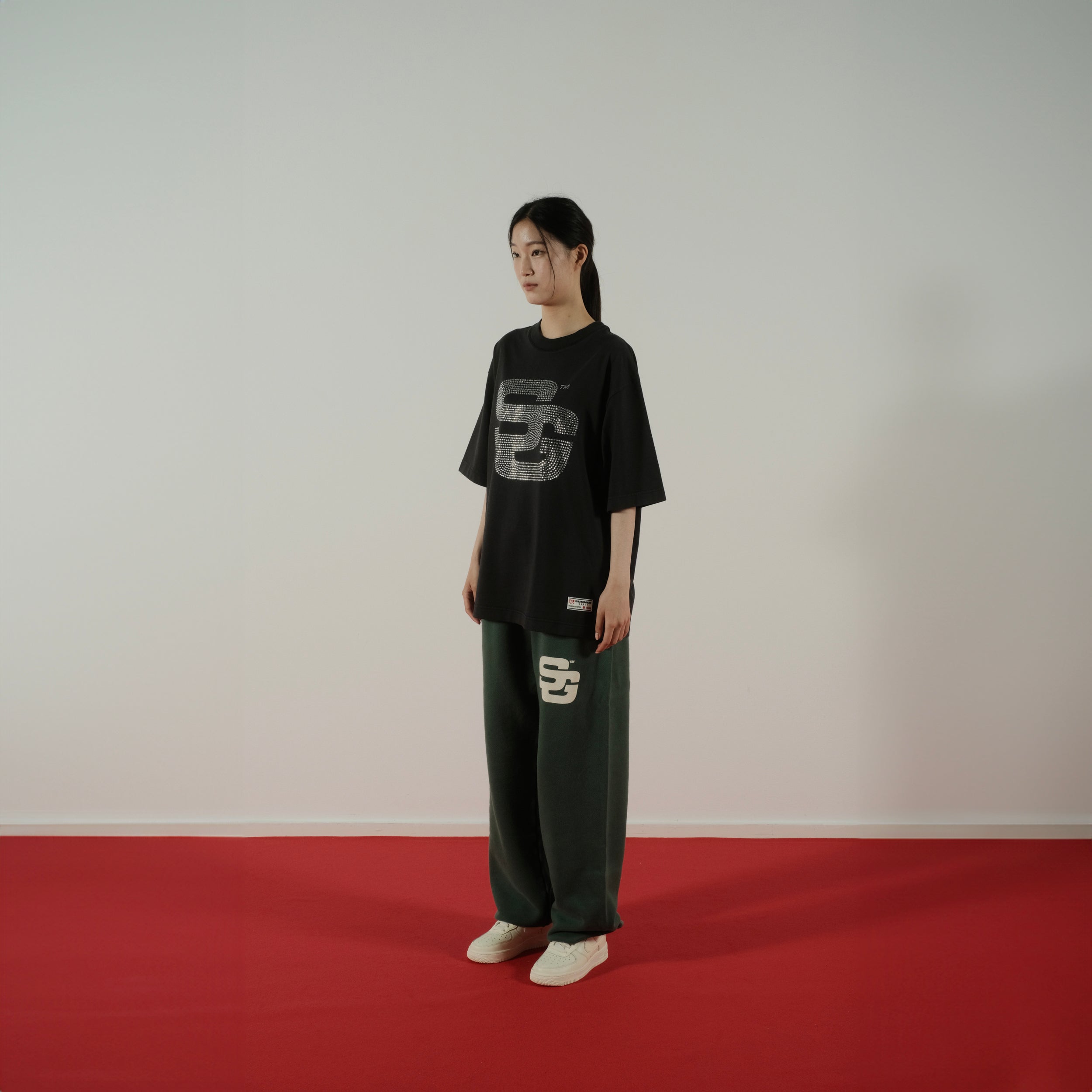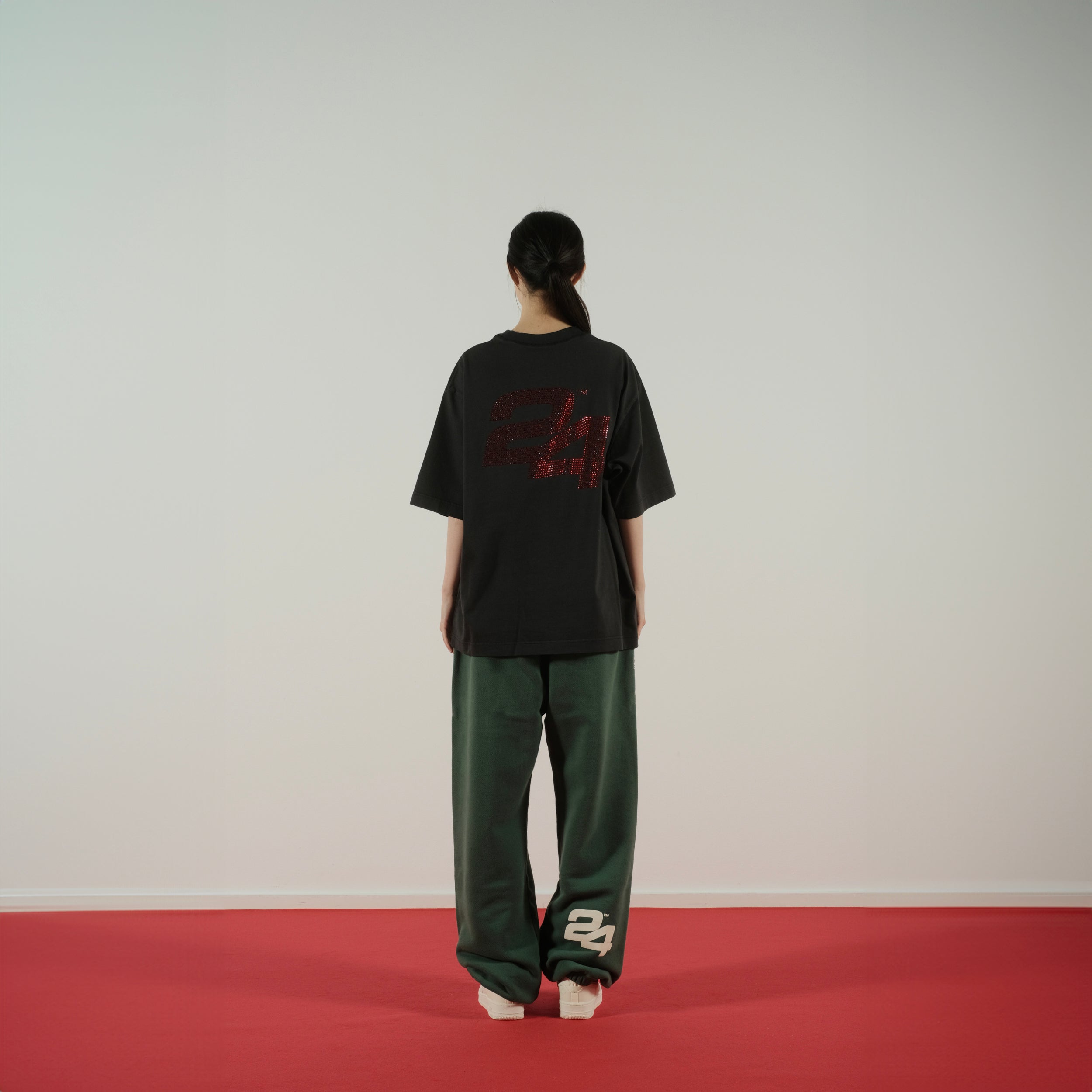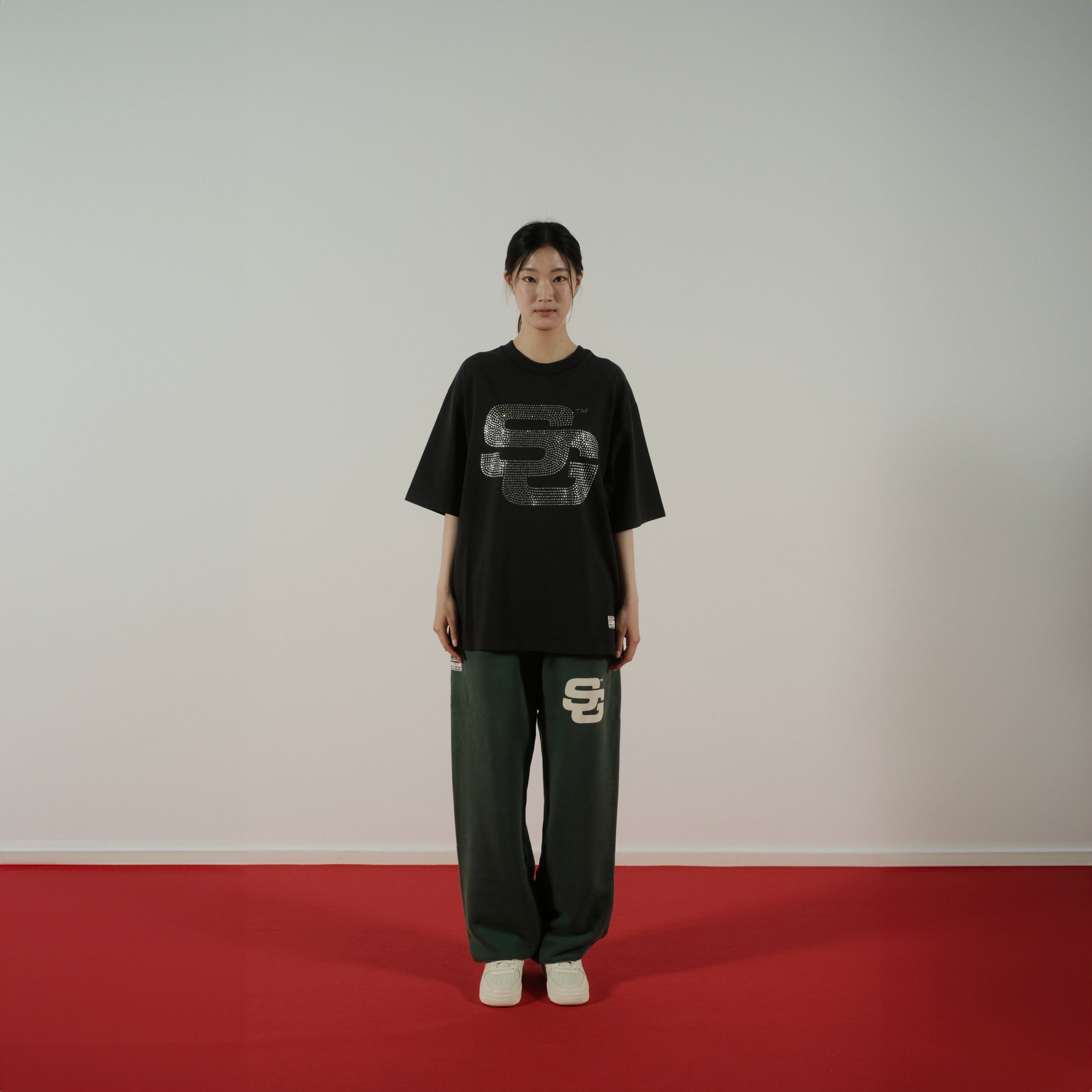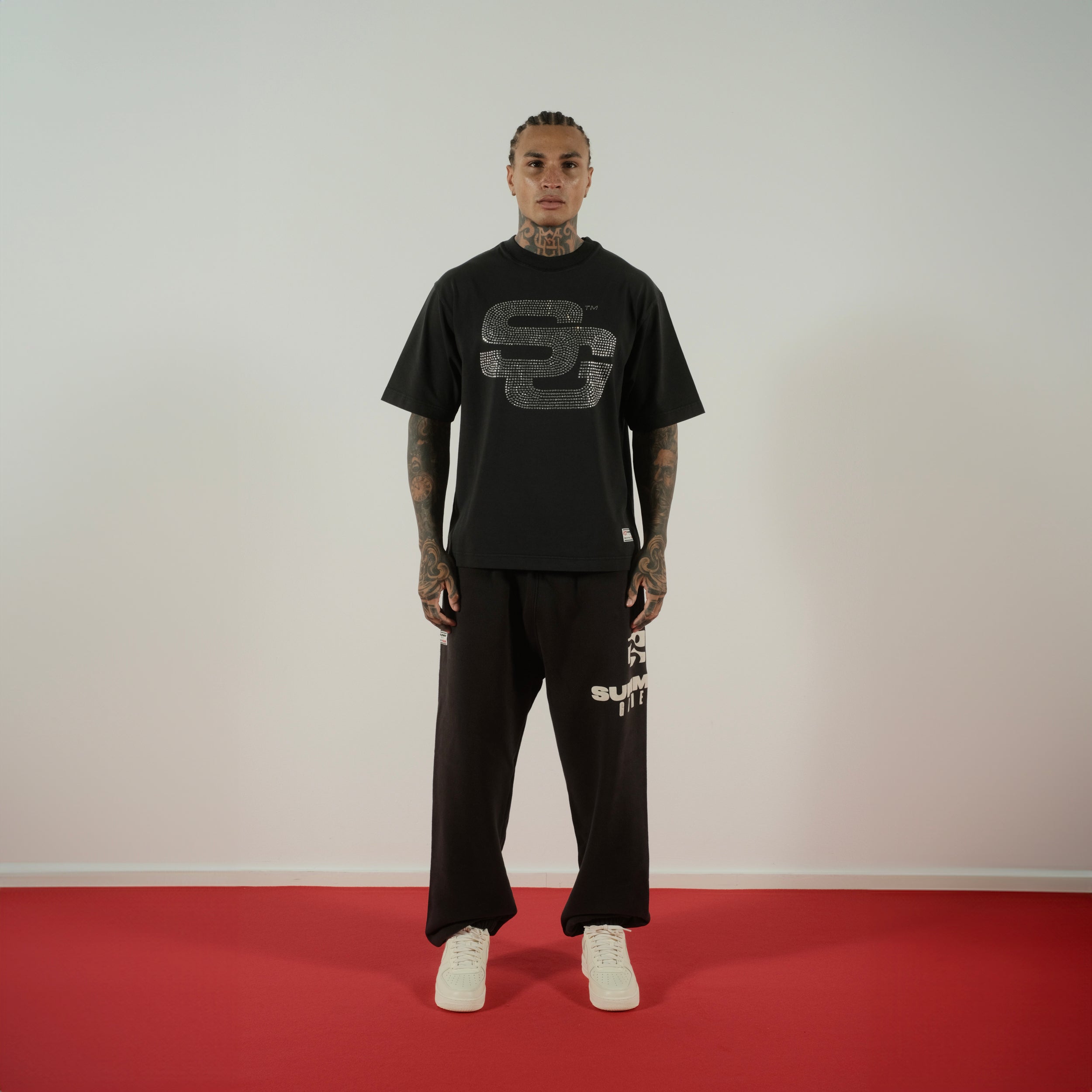 Athletic fitted tee made out of mid weight, ultra soft cotton jersey with rhinestones print and brand tag.