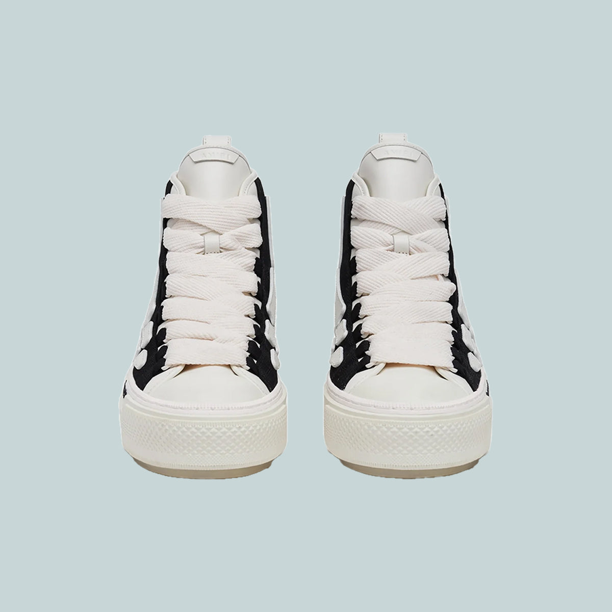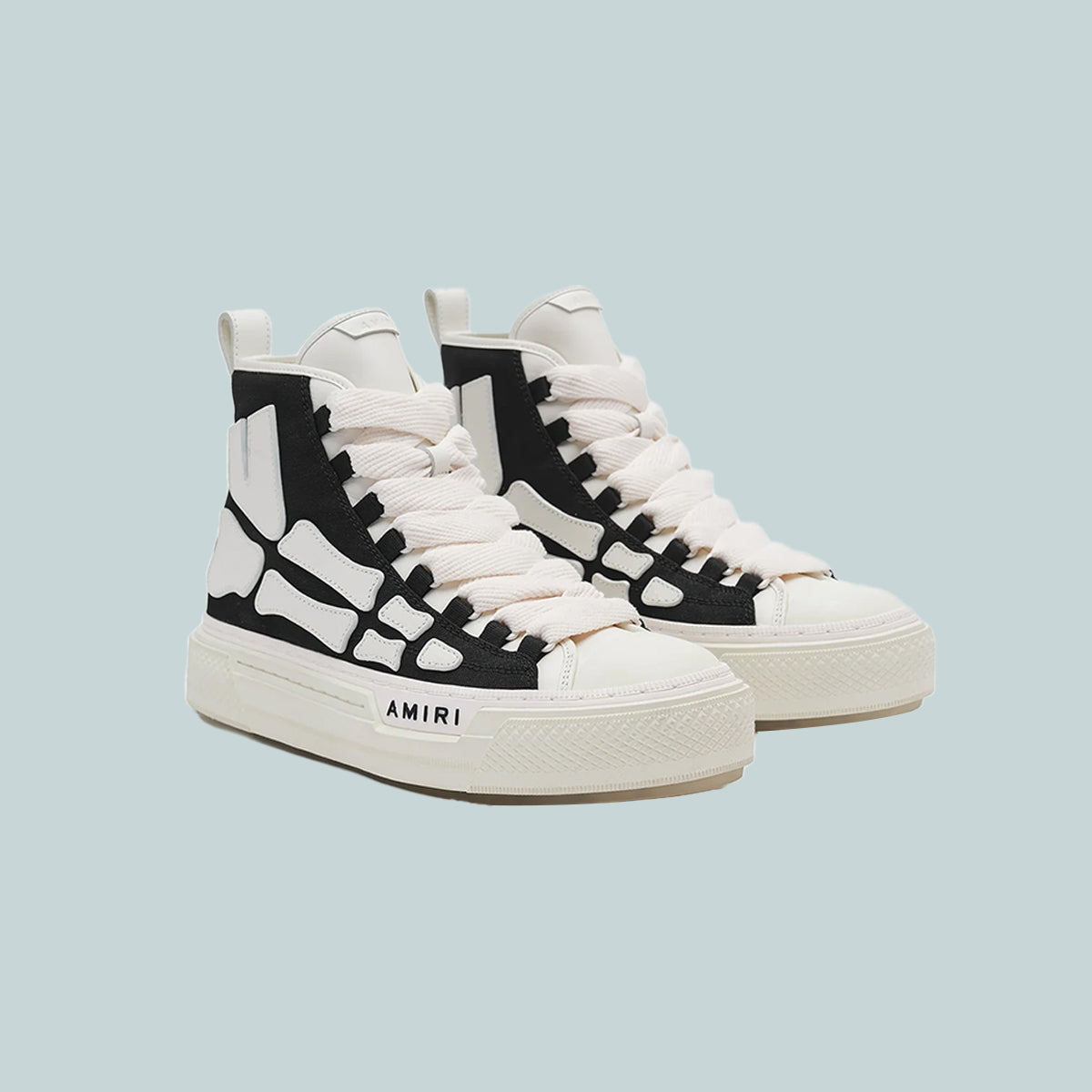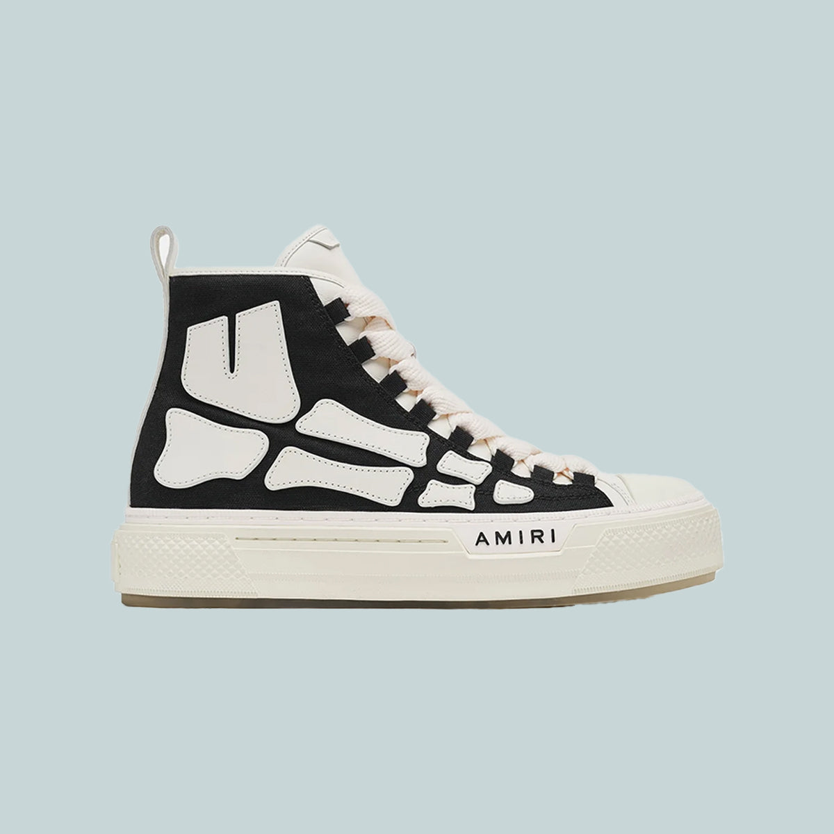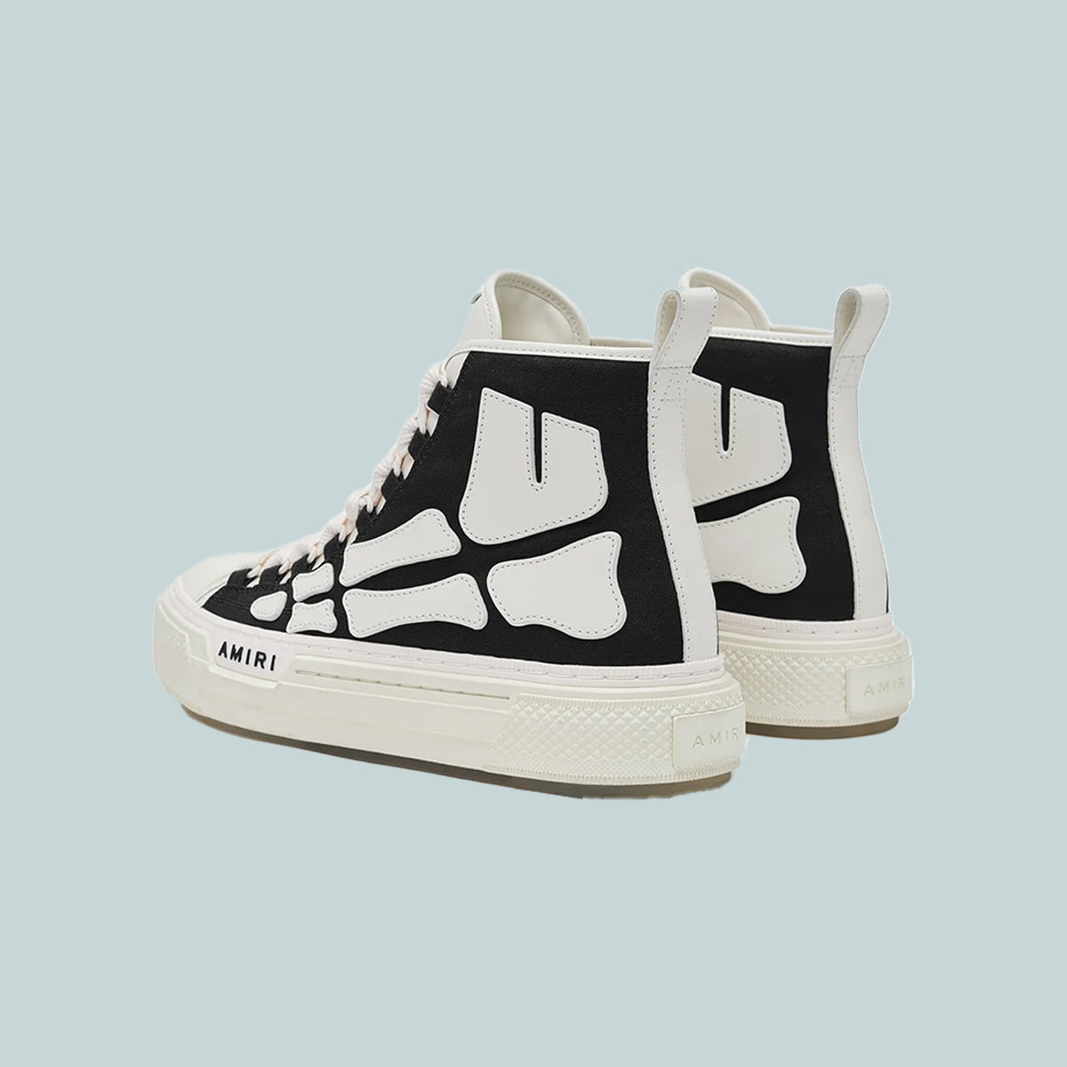 For Pre-Fall 2025, the house's signature bones motif enhances the retro-inspired Court silhouette. The Skel Court Hi sneaker is set on a molded rubber outsole with a canvas upper and leather bone appliqués.