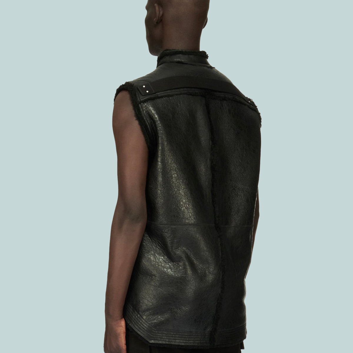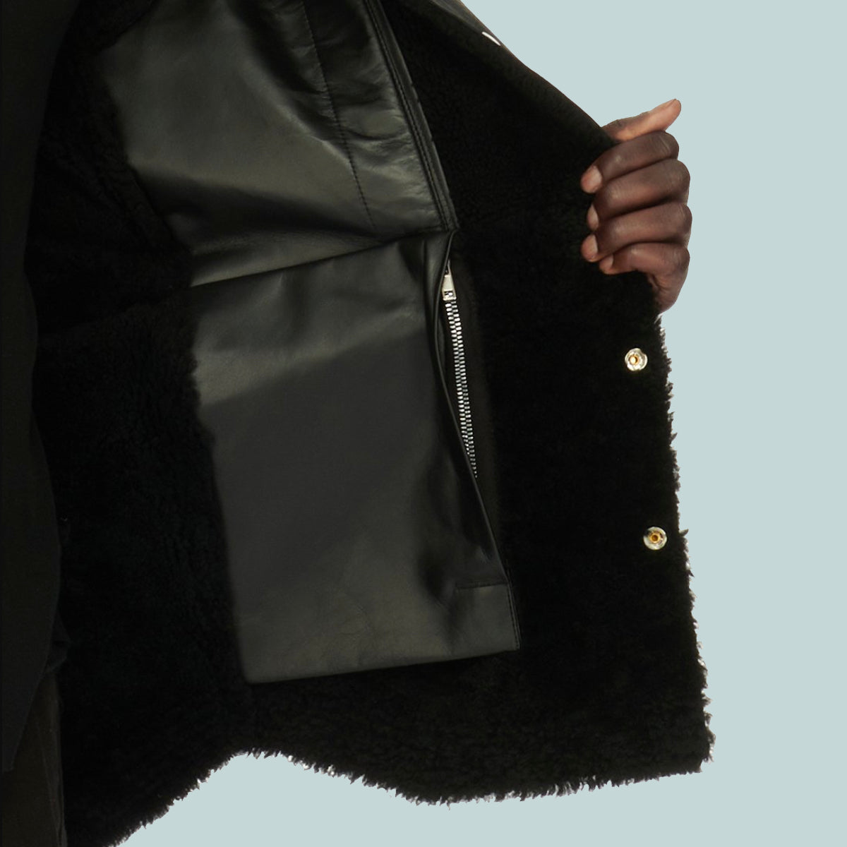 This version is made of shearling with the fur facing outwards, it has raw cut sleeves and its hem is edged with rows of signature stitching lines.