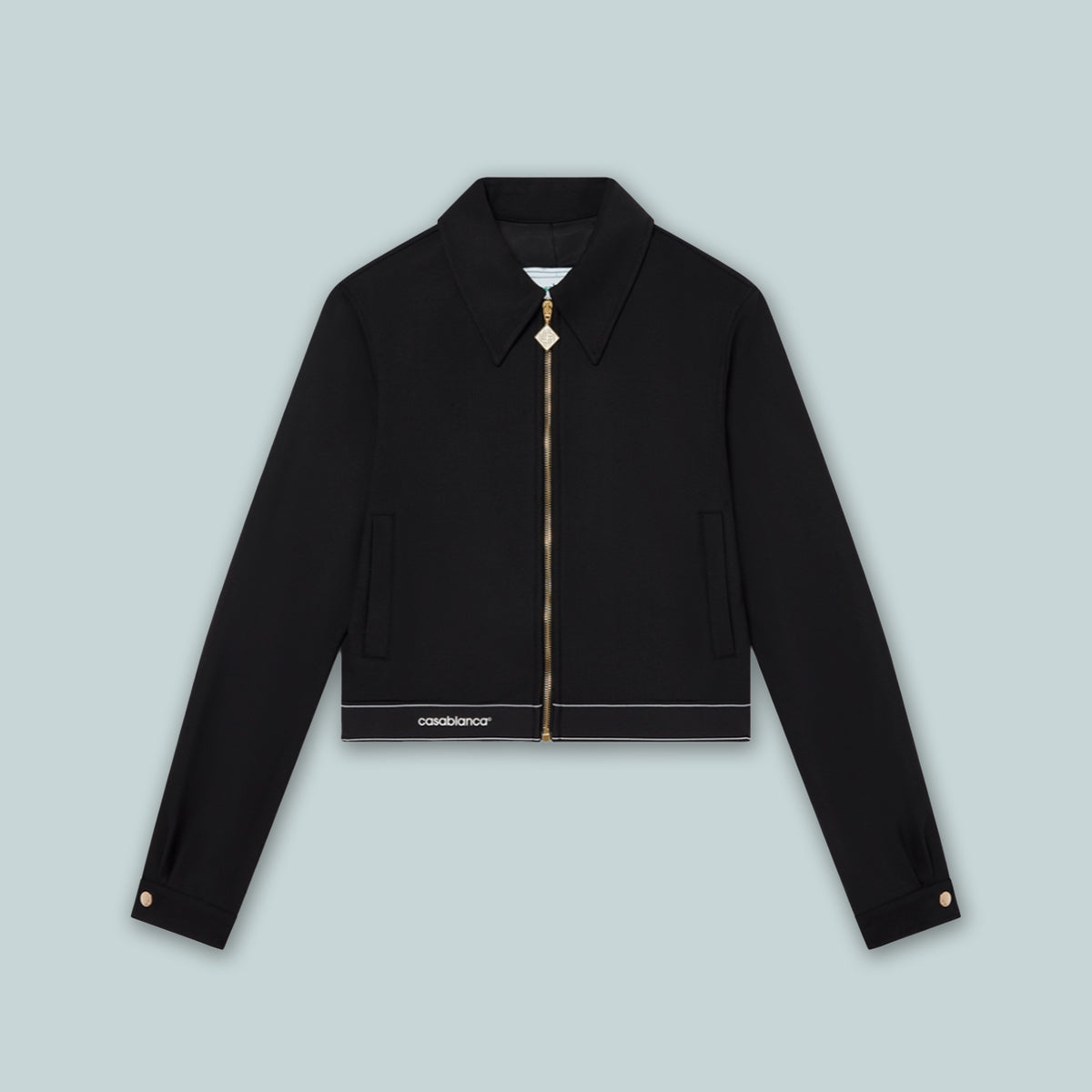 The sports tailoring jacket is a short design crafted from a wool-blend fabric. Completed with a point collar, an elasticated tape hem featuring the Casablanca logo and white stripe detail - designed to be worn with its matching trousers.