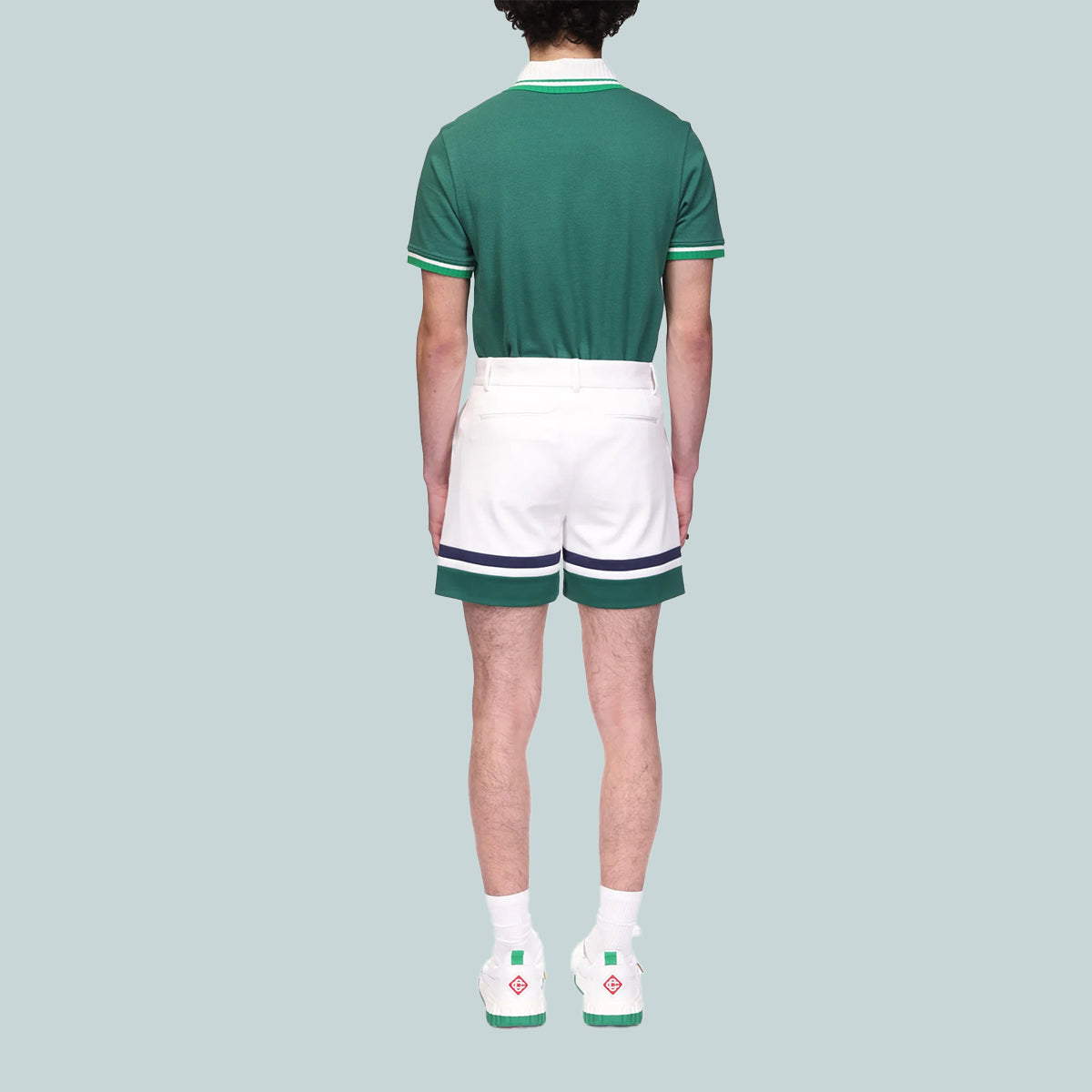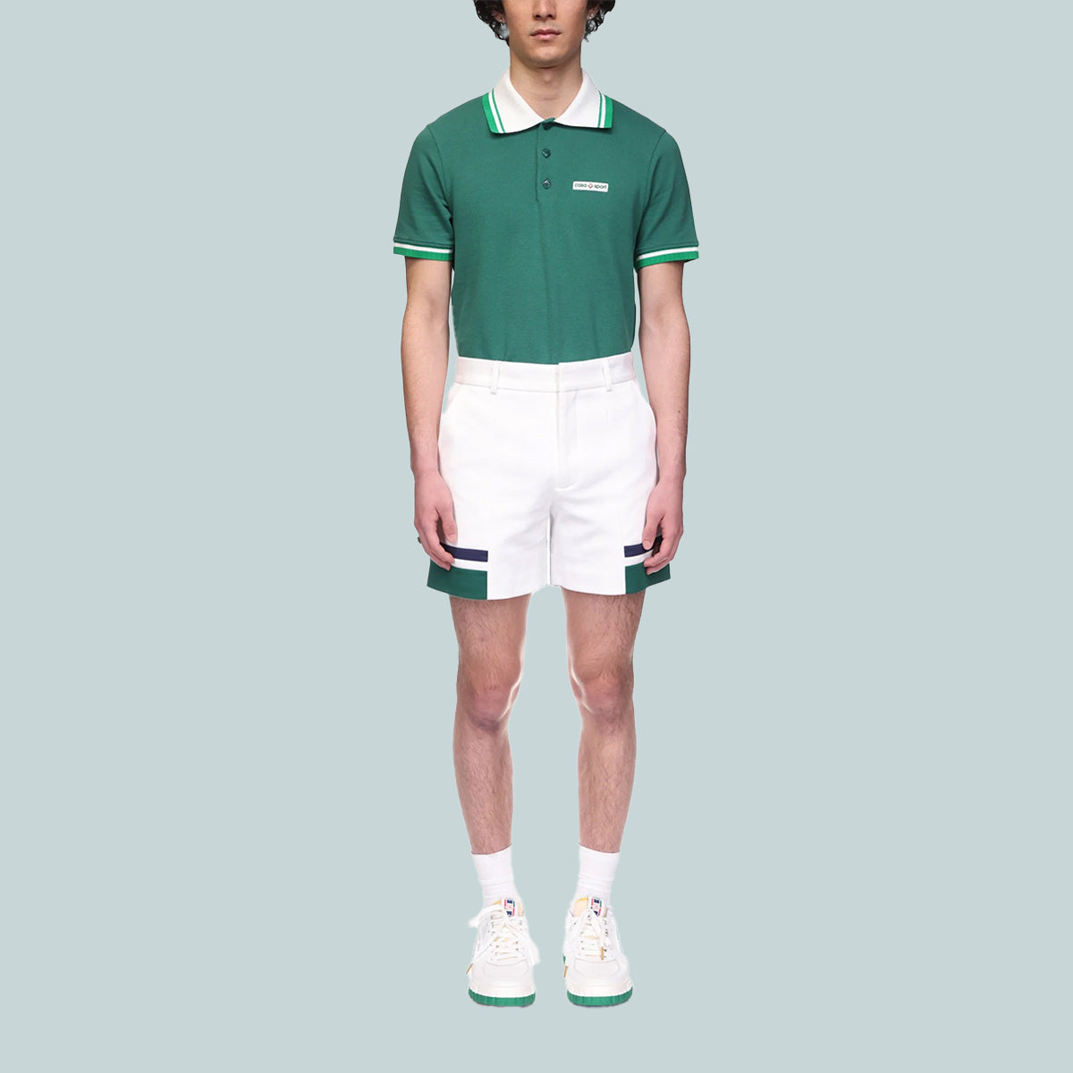 The sports tailoring shorts are crafted from a cotton blend fabric and feature the house's signature diamond logo. Finished with slanted front pockets, lining, welted back pockets, belt loops, zip closure and contrast blue, white and green panels on the hem.