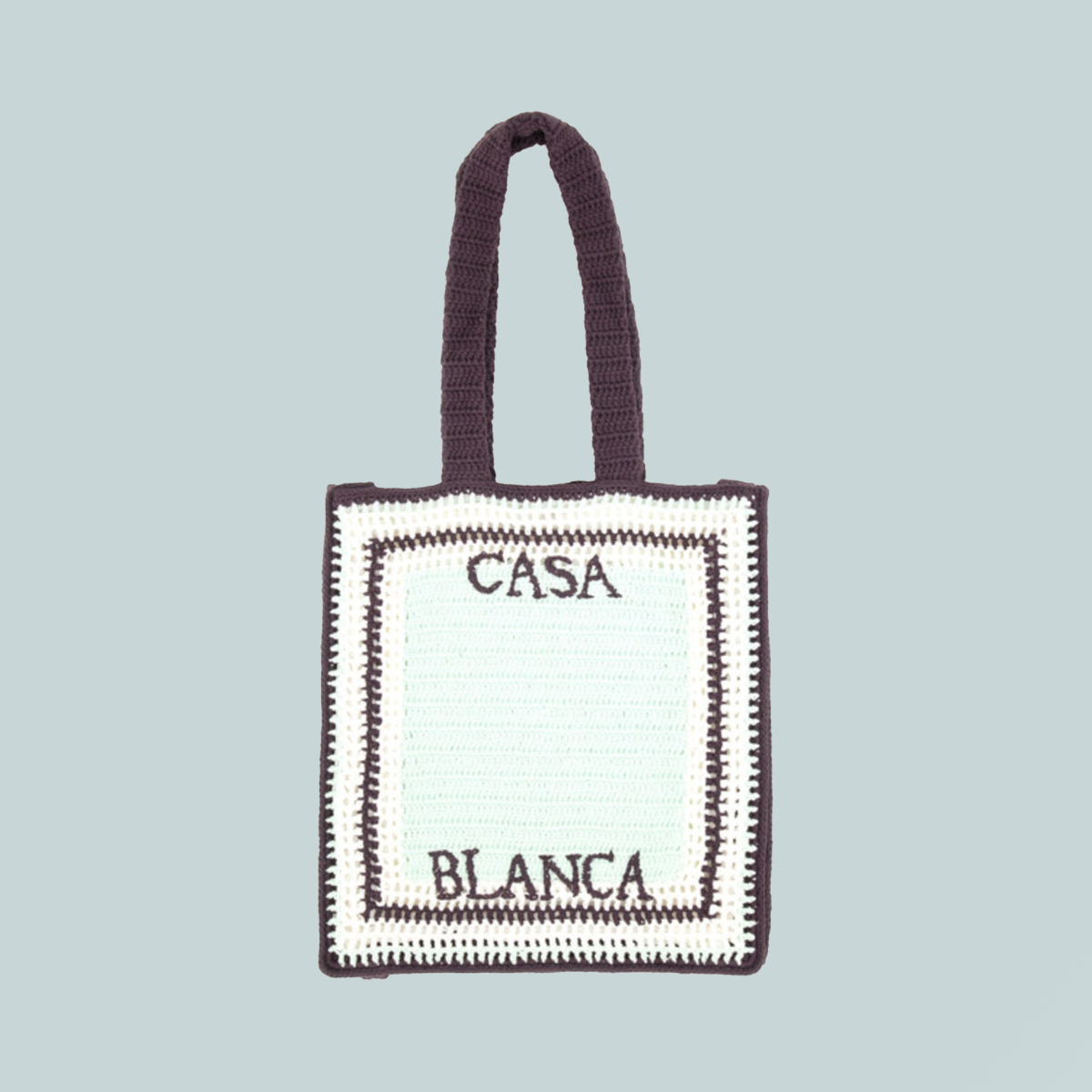 The stripe crochet bag is a knitted style crafted from crochet cotton fabric, and features a slouchy silhouette. Completed with an embroidered stacked logo and straps that allow the tote style to be worn over the shoulder or in the hand.
