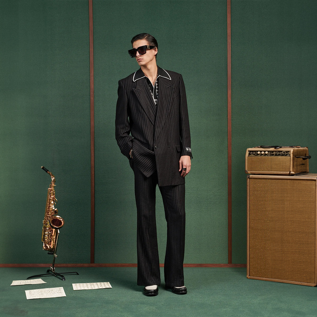 Woven stripes illuminate men's suiting for Spring-Summer 2025. The Striped Creased Flare is designed in the house's signature flare silhouette with side seam pockets and concealed hook-and-zip tab closure.