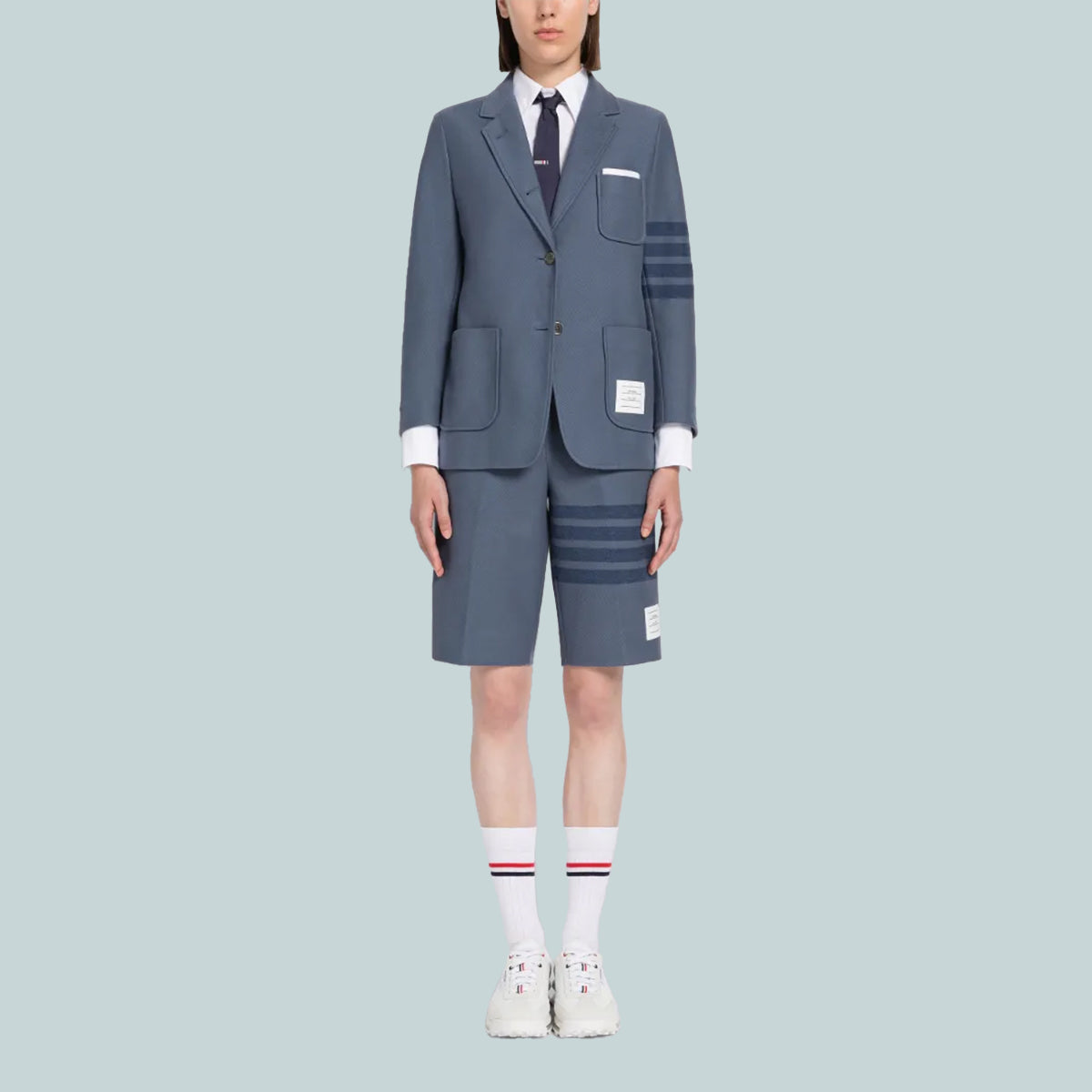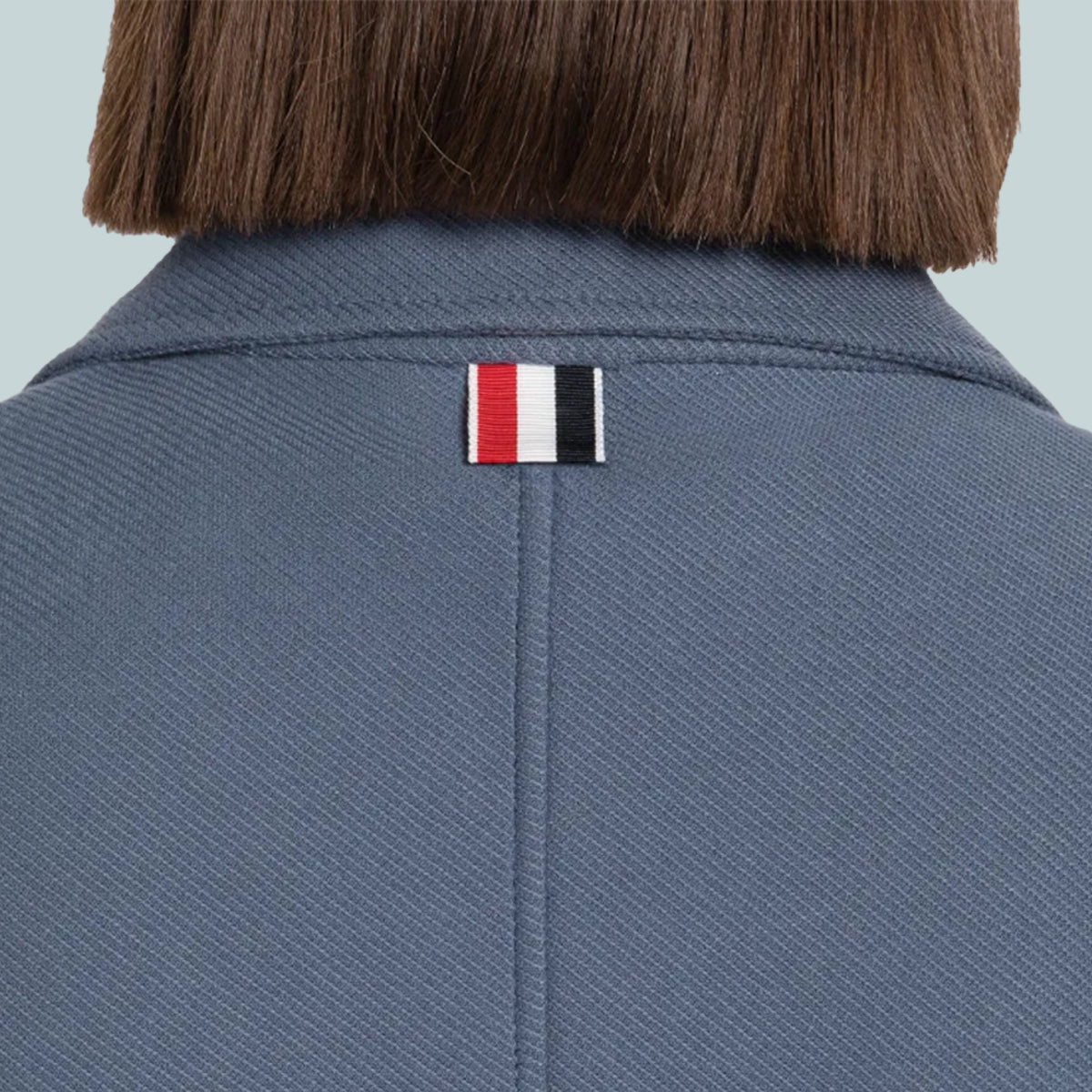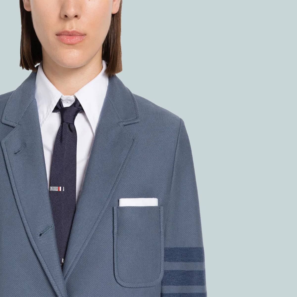 Striped-sleeve cotton blazer from Thom Browne featuring blue, cotton, stripe detailing, logo patch to the front, signature grosgrain loop tab, notched lapels, front button fastening, three front patch pockets, long sleeves, central rear vent and straight hem.