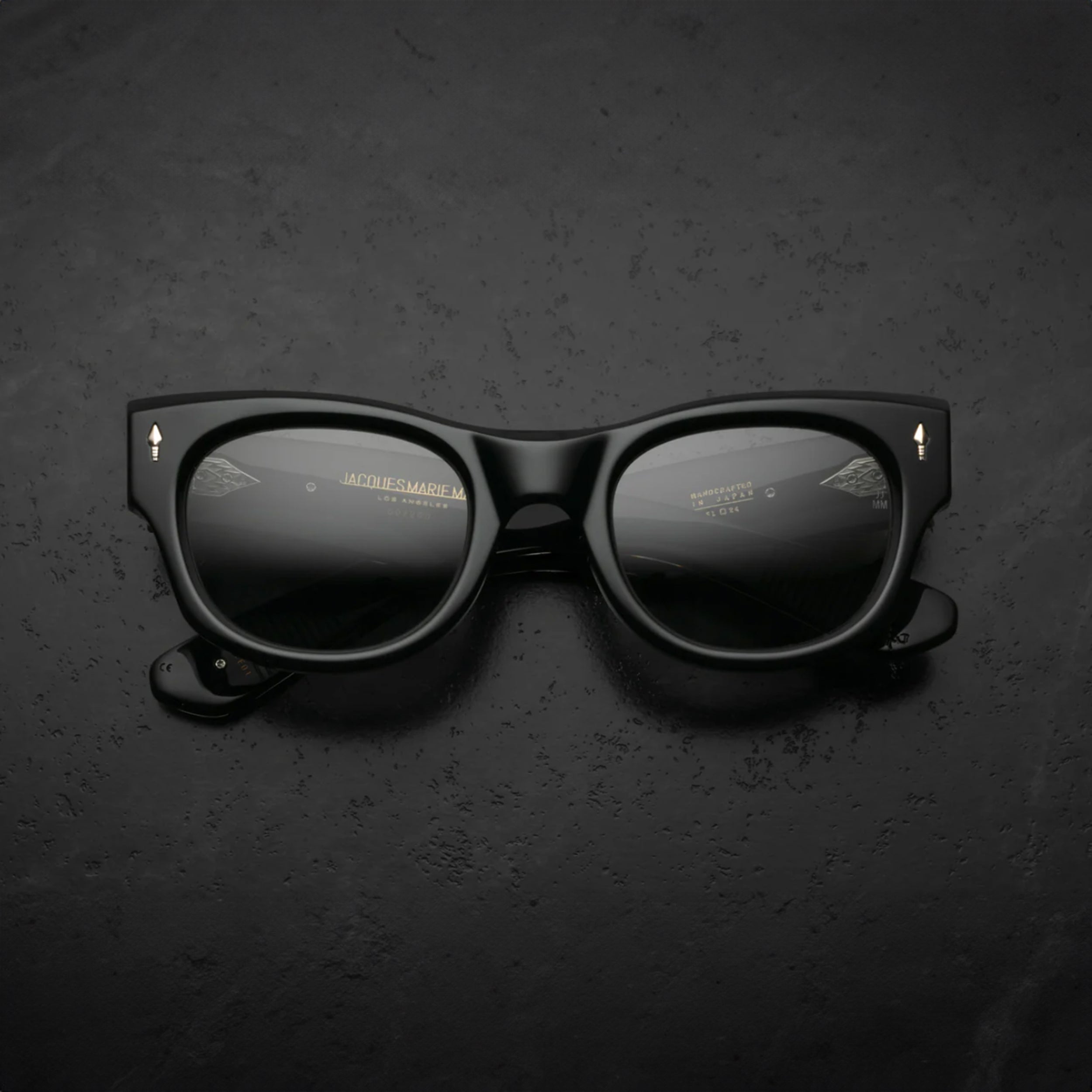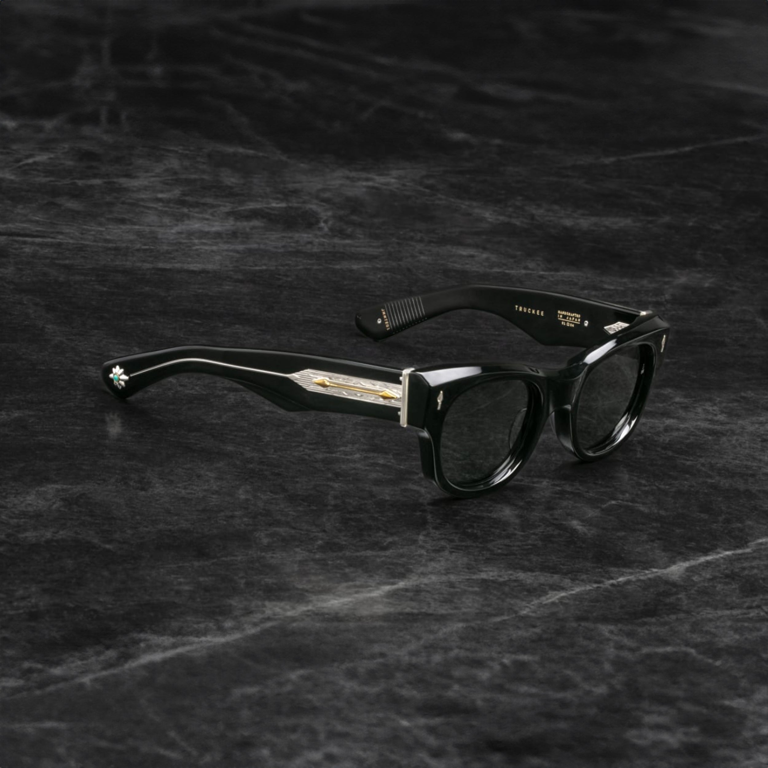 - Black 10mm cured cellulose acetate frame with custom double laminated acetate temples featuring precious metal hardware and grey lenses
