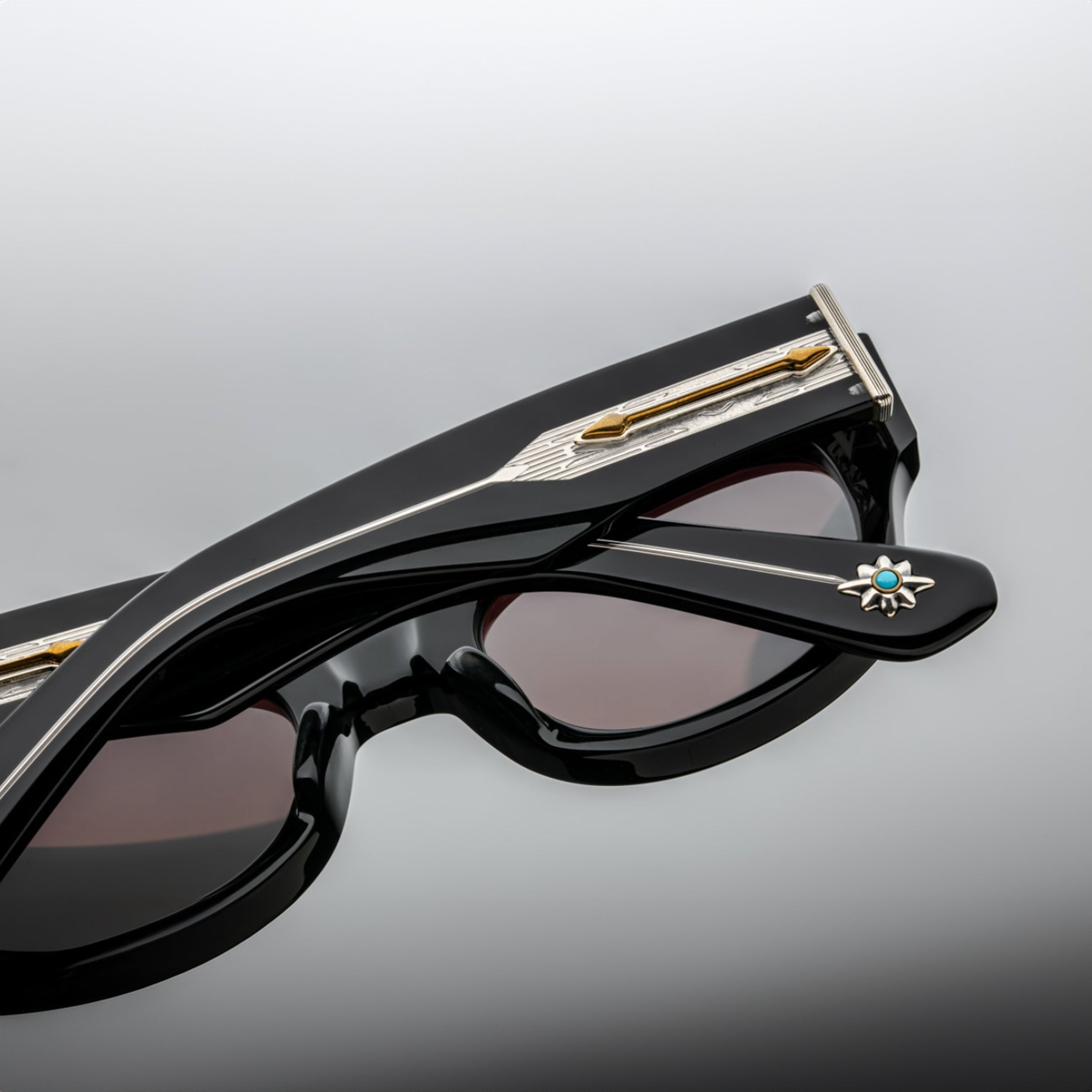 Late-‘50s-inspired glasses with subtle cat-eye and soft lens shape, featuring ornate double-arrowhead temple motif and “blue flower” cameo with turquoise inlay at the temple tip.