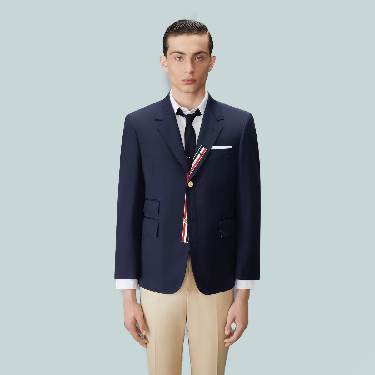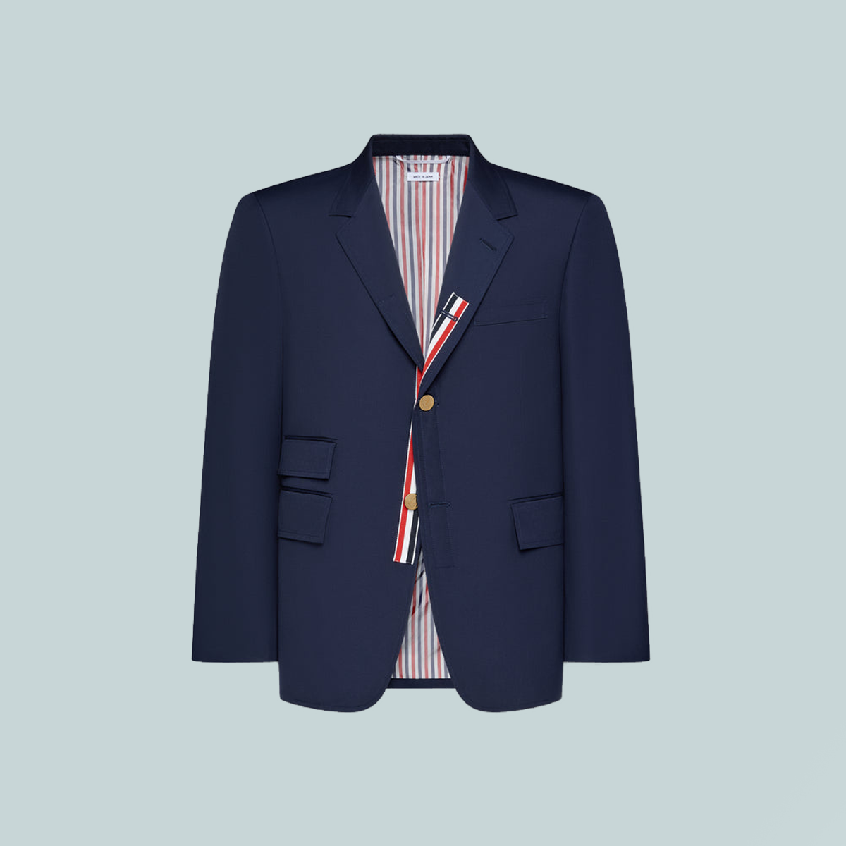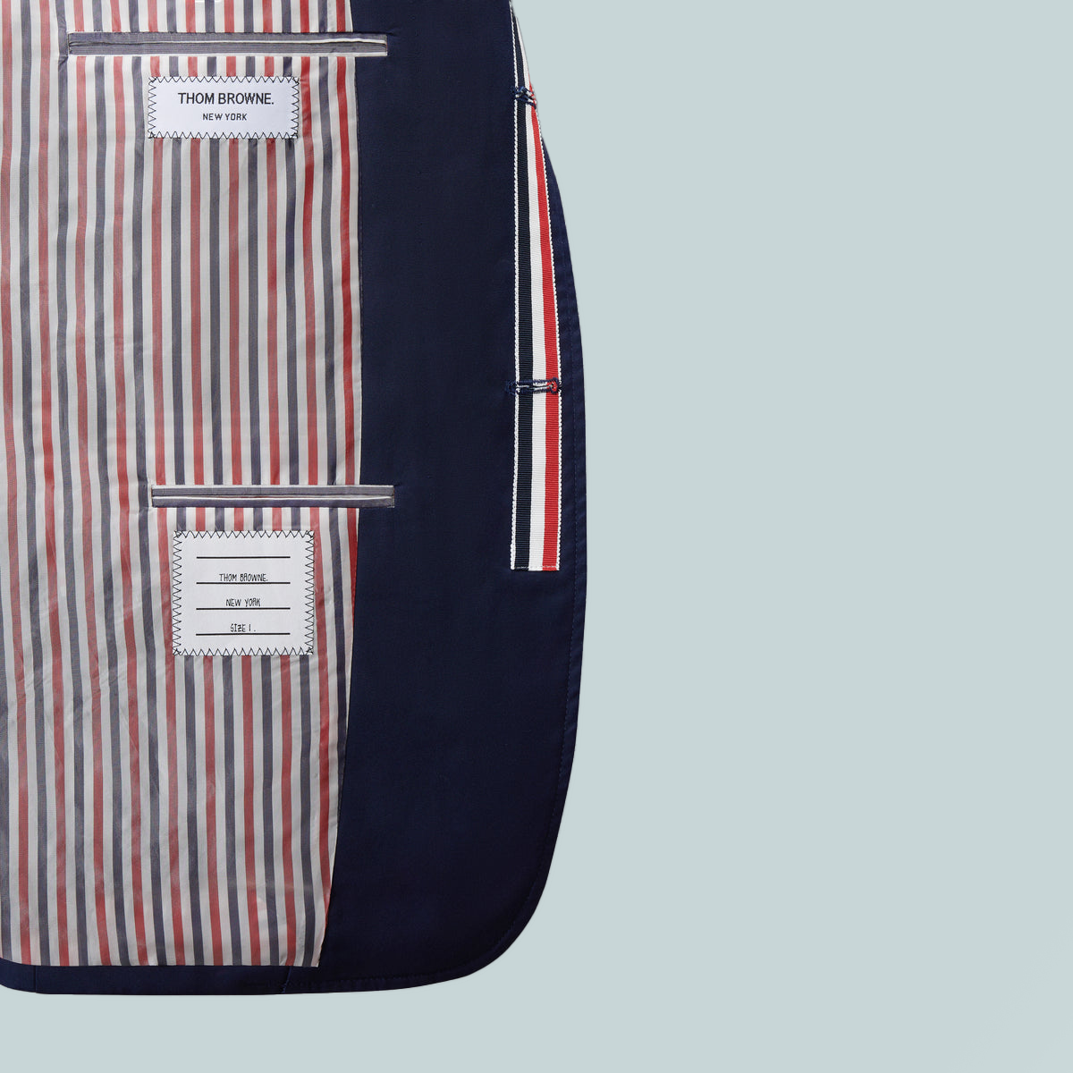 Single breasted sport coat in navy typewriter cloth with grosgrain-trimmed button placket. 2-button front closure, notched lapels, 3 flap front pockets, single chest pocket. Buttoned cuffs with signature striped grosgrain trim. Striped lining with interior pocket and name tag. Signature striped grosgrain loop tab at back of neck.