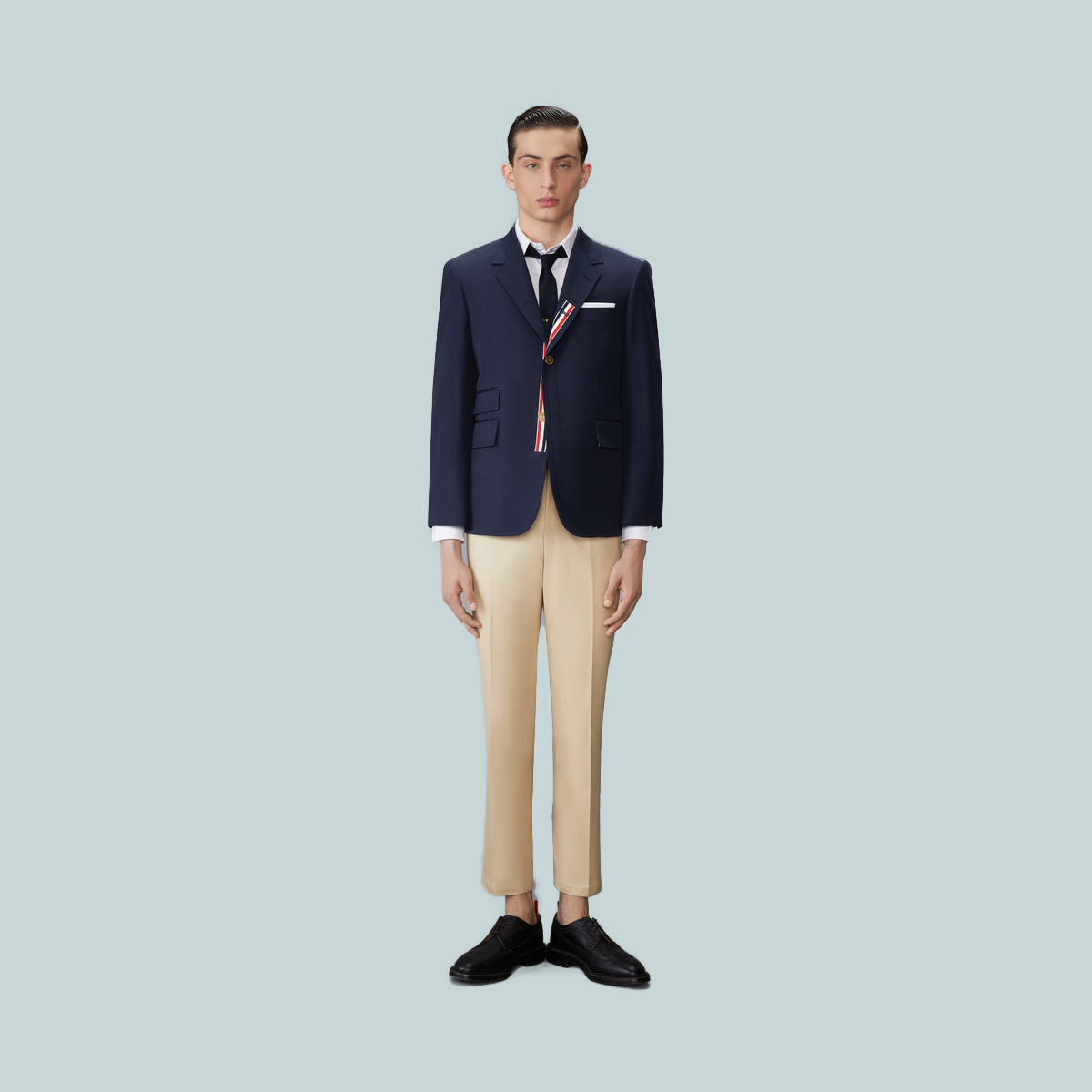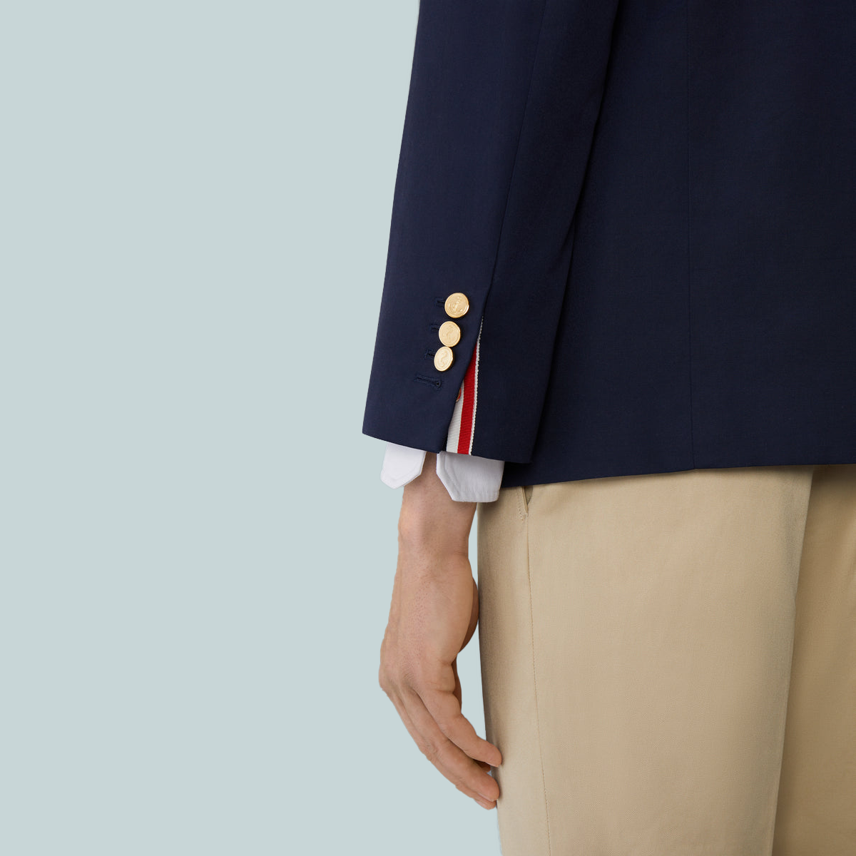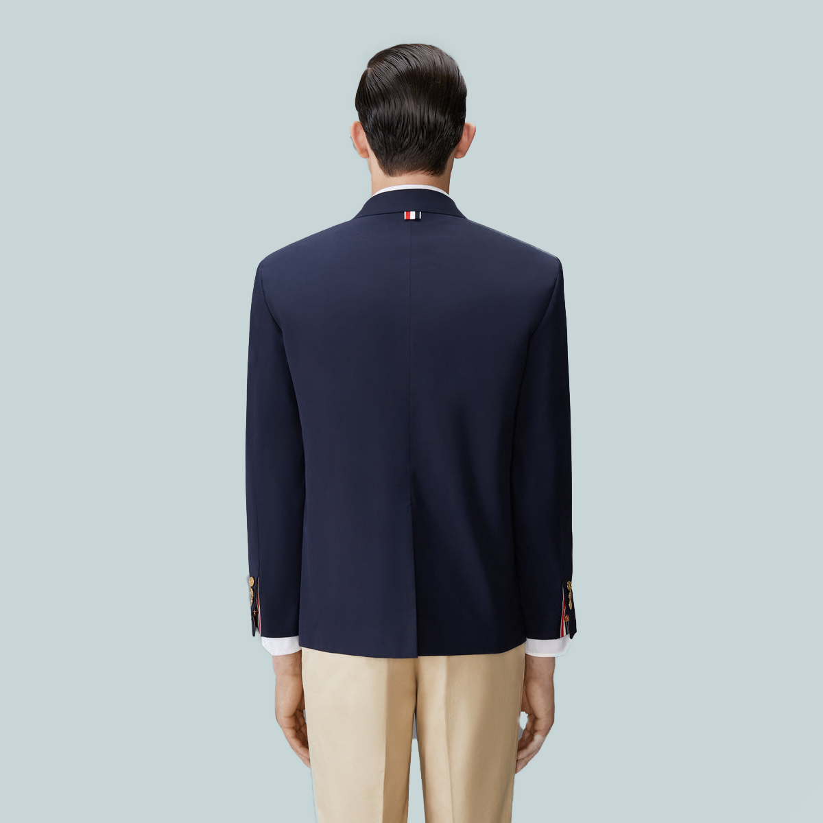 Single breasted sport coat in navy typewriter cloth with grosgrain-trimmed button placket. 2-button front closure, notched lapels, 3 flap front pockets, single chest pocket. Buttoned cuffs with signature striped grosgrain trim. Striped lining with interior pocket and name tag. Signature striped grosgrain loop tab at back of neck.