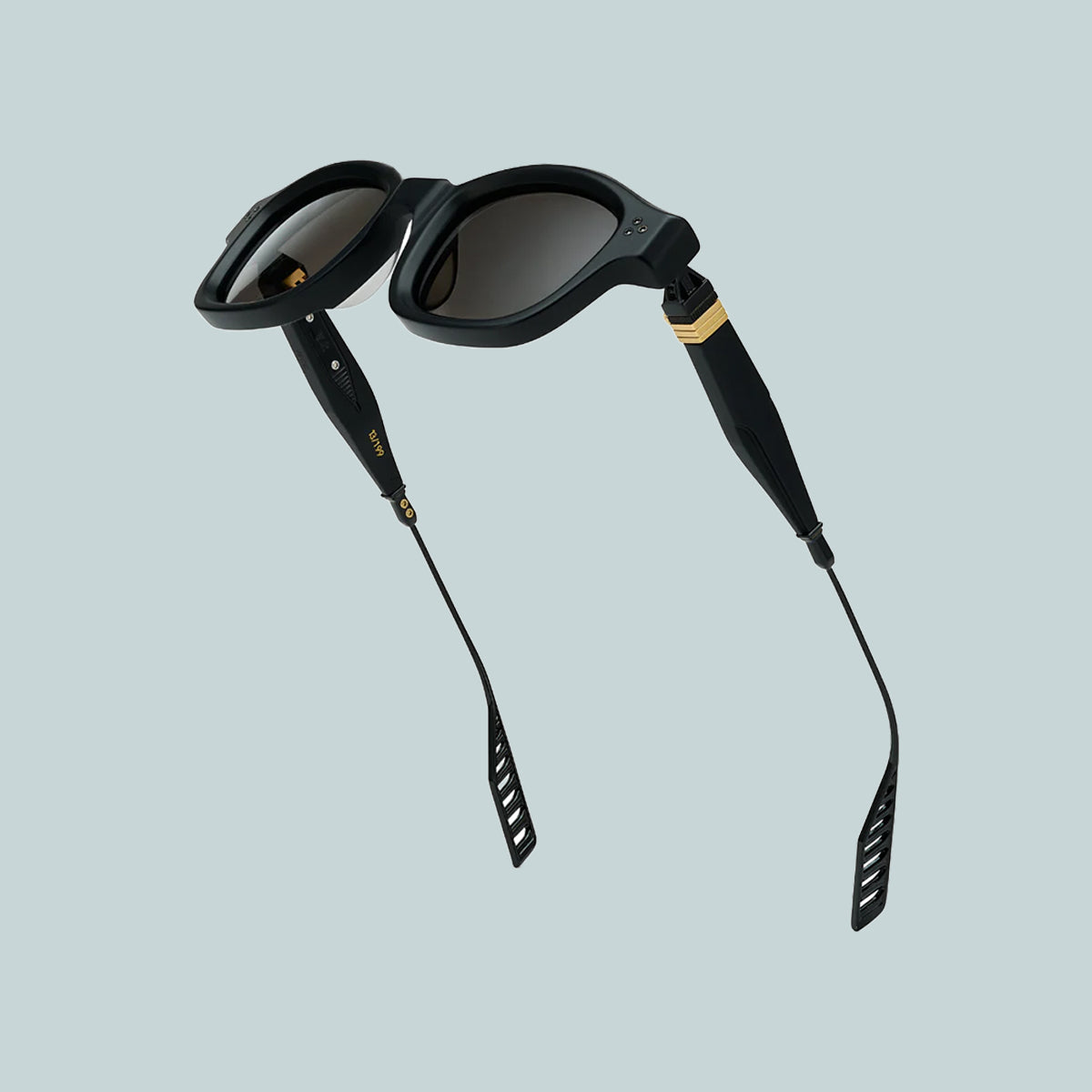 Voluminous 7mm combination temples with titanium ventilated end tips. Powered by a 5-barrel hinge with an oversized hinge plate anchored with custom torx screws.