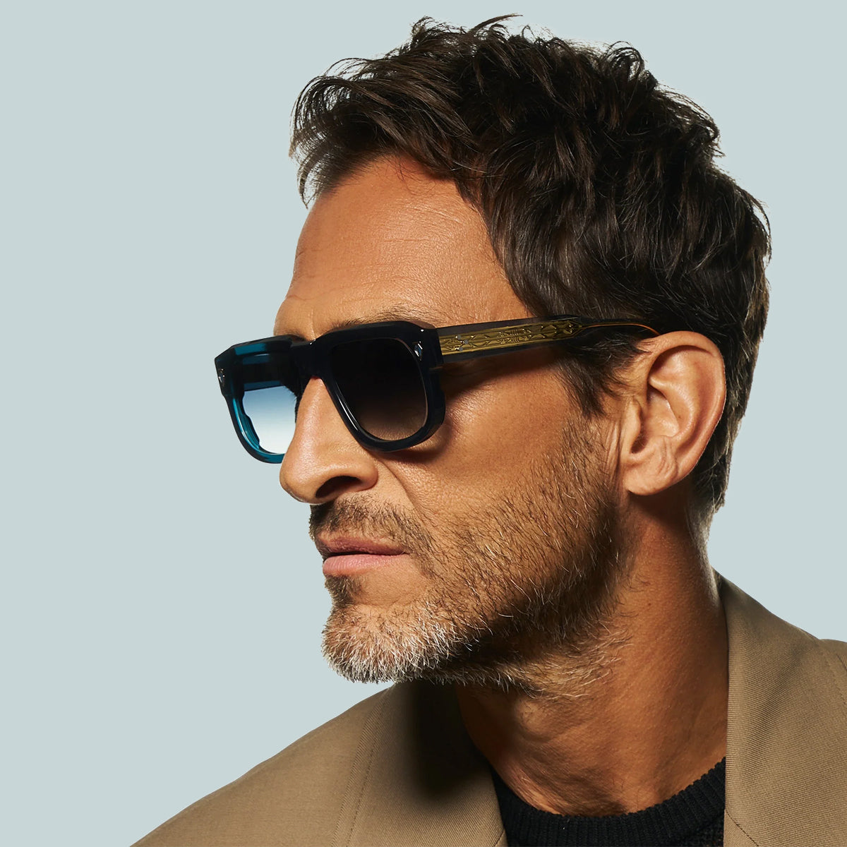 Sterling silver front decors with two-tone enamel detail. Voluminous 5mm temples with clear crystal lamination construction showcasing our intricate piston core-wire system. Powered by a German-engineered 7-barrel hinge