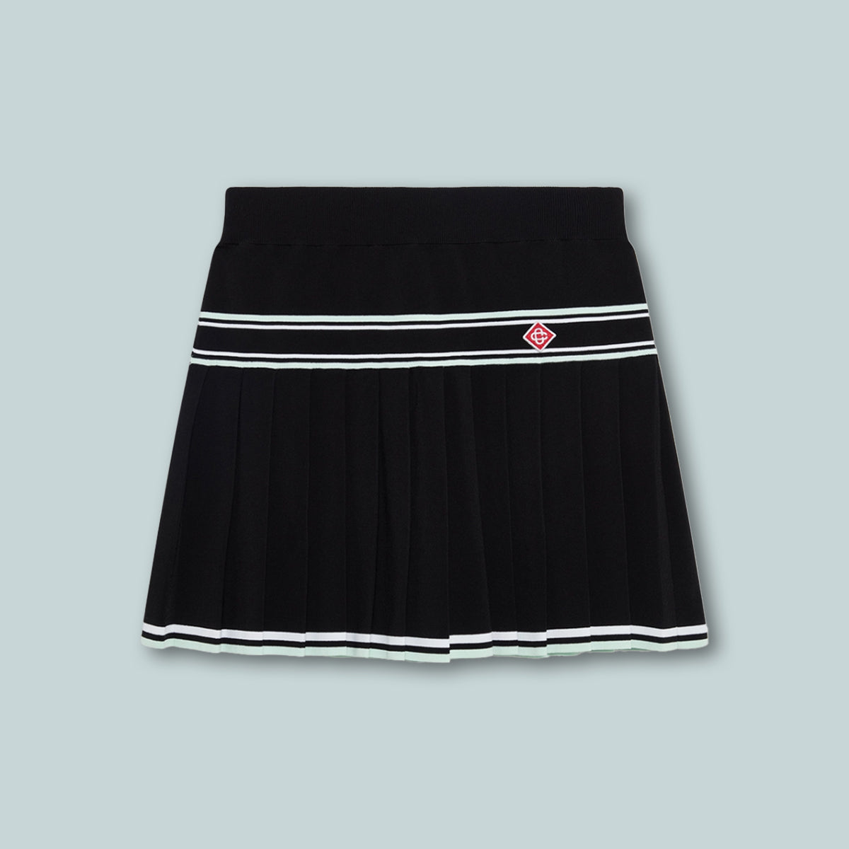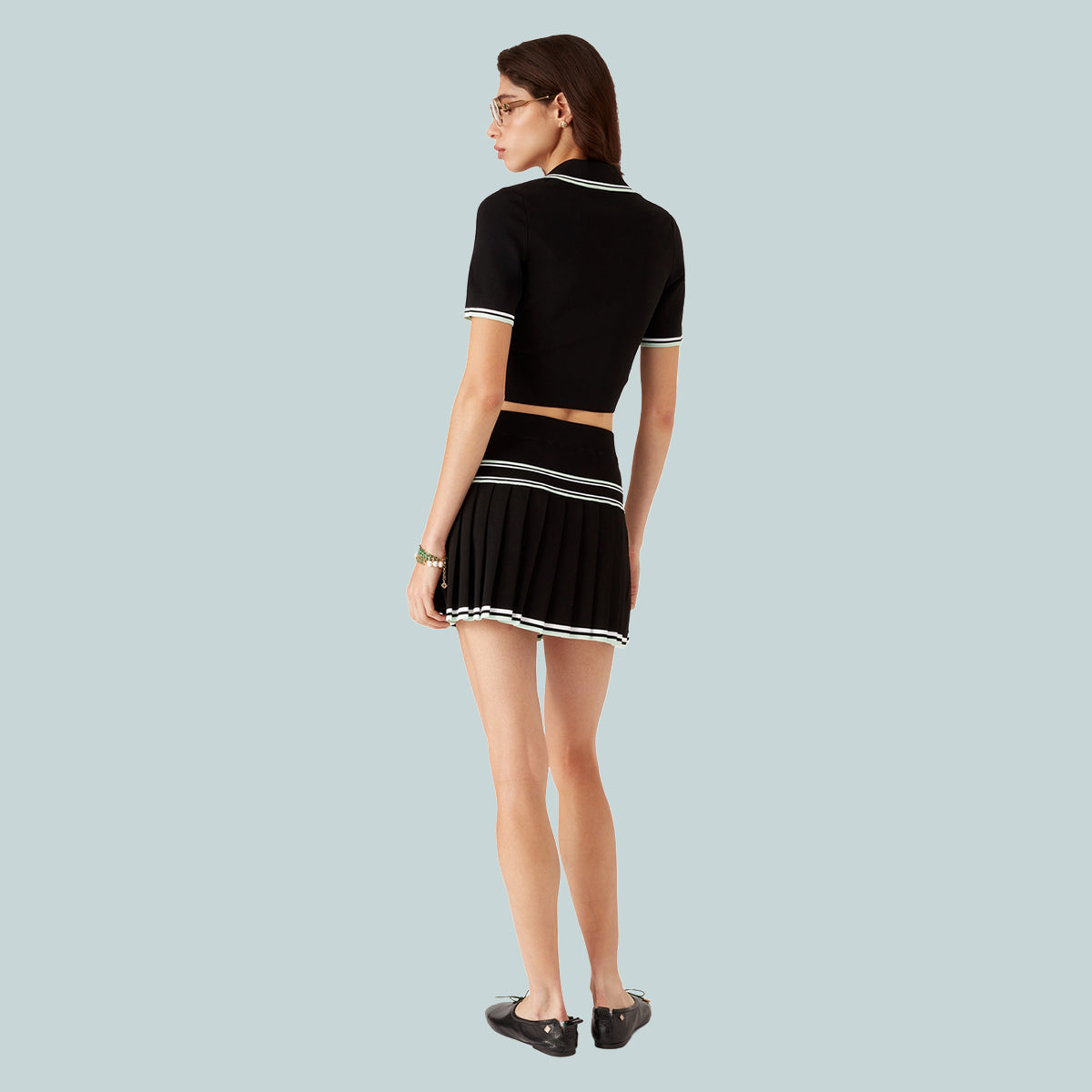 The viscose pleated mini skirt is a short design crafted from viscose fabric. Completed with a yoke featuring stripe detail, a pleated panel with horizontal stripe hem detail.