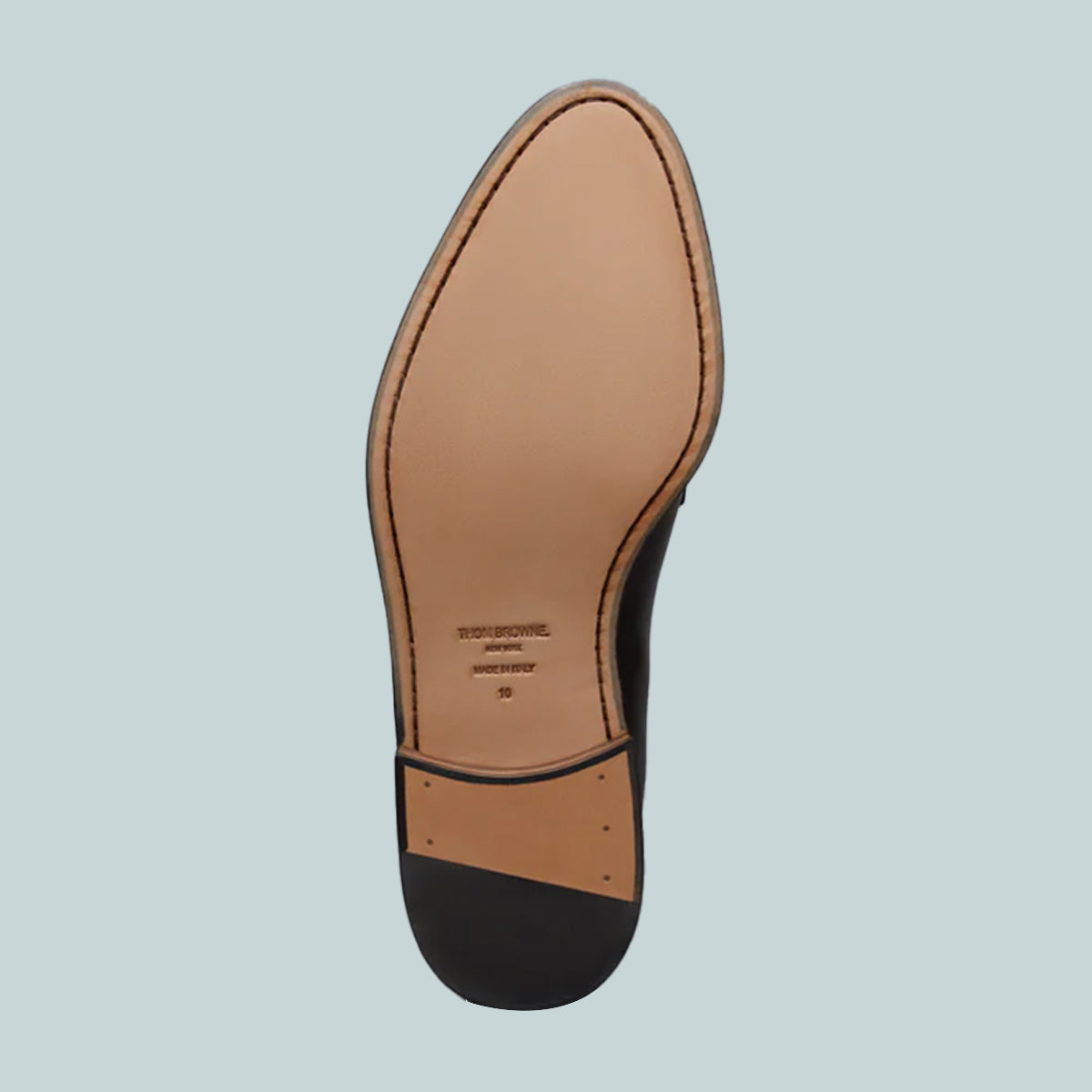 Varsity penny loafer in dark brown vitello calf leather. Penny strap at vamp, apron toe with flexible leather sole for comfort. Signature striped grosgrain loop tab at heels.