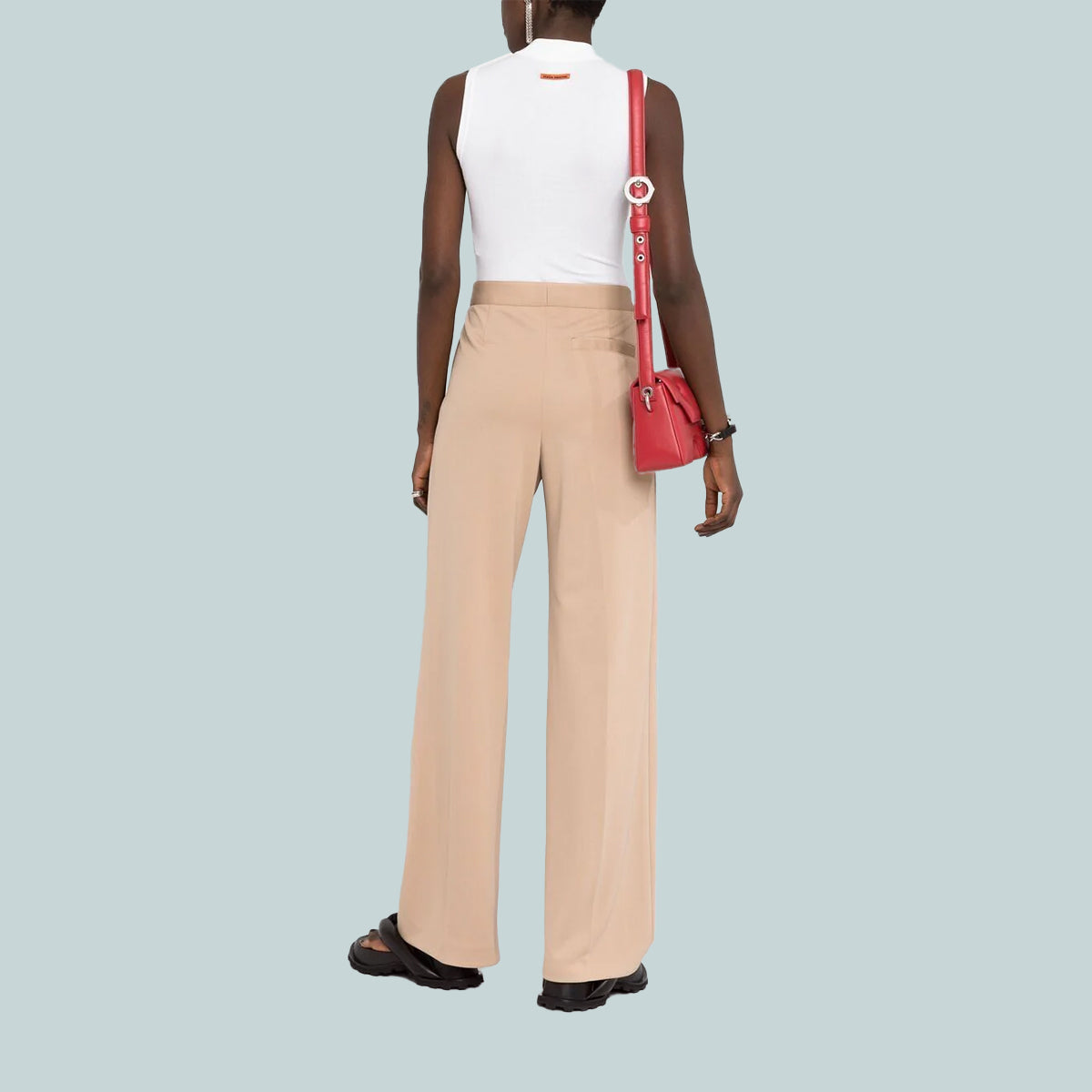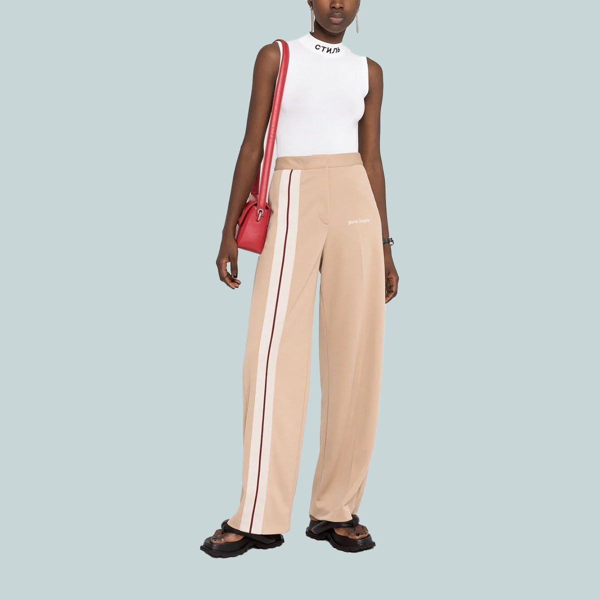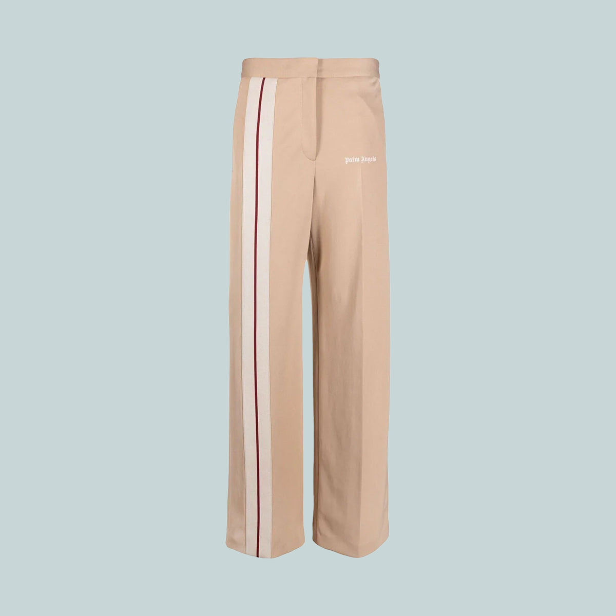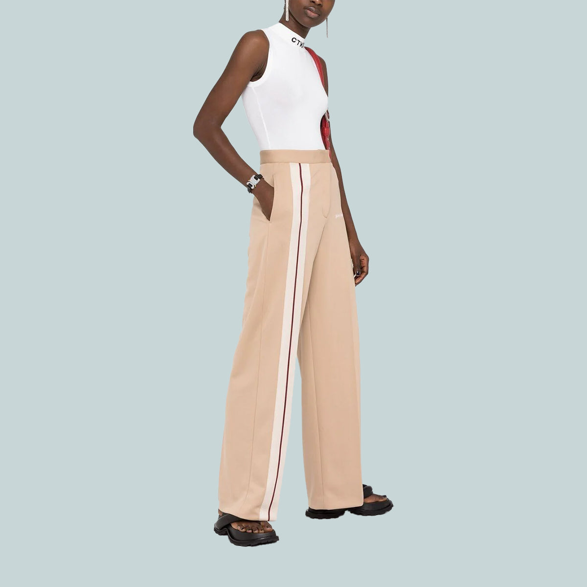 Wide leg trousers with sporty stripe down a single leg. High waisted. Side slit pockets. Zip fastening.