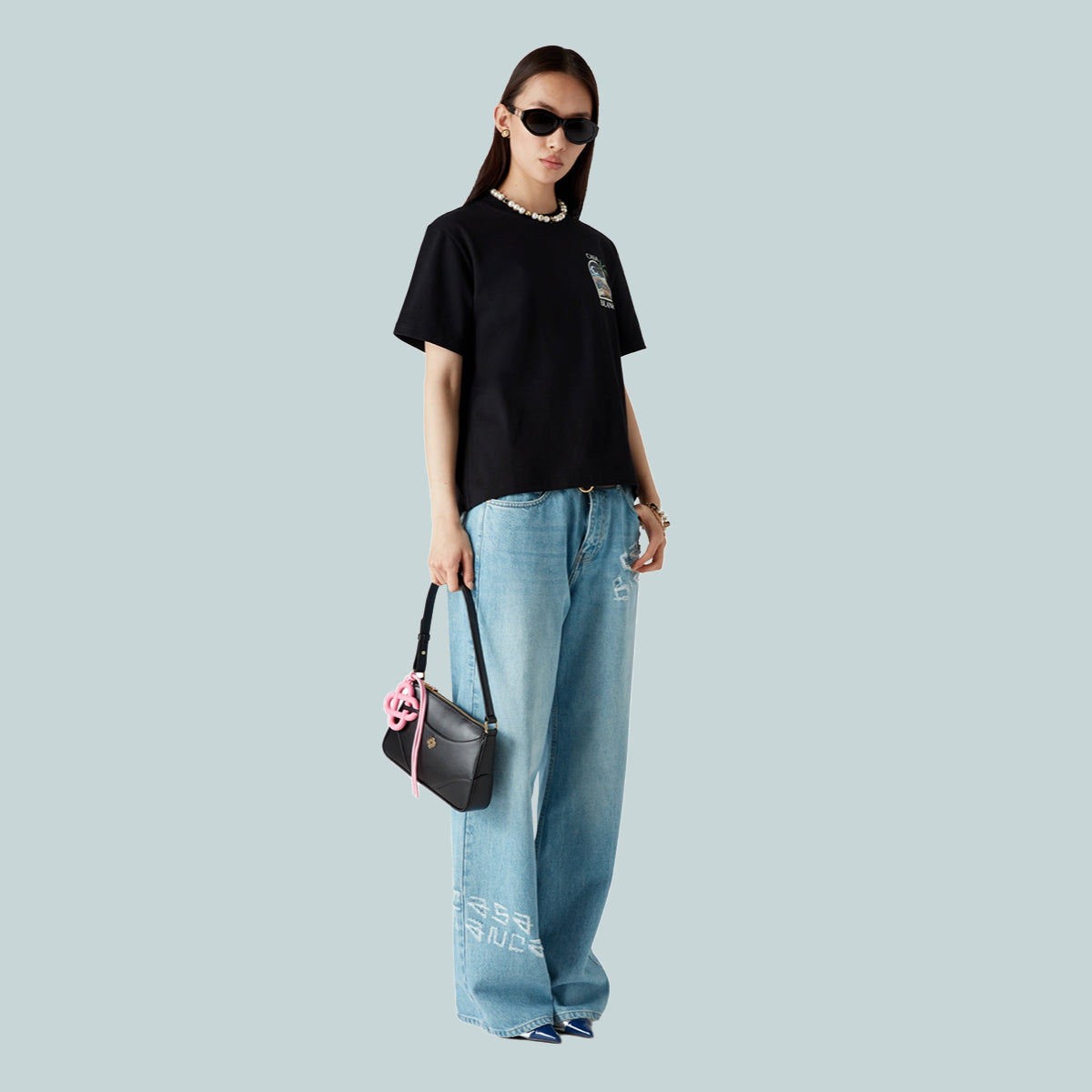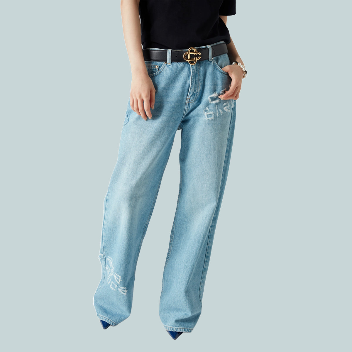 The graffiti distressed denim jeans are a straight-leg design crafted from cotton fabric and feature the signature stacked logo in a graffiti-style text etched into the fabric. Completed with gold-plated hardware, belt loops, front and back pockets, a branded leather patch and zip closure.