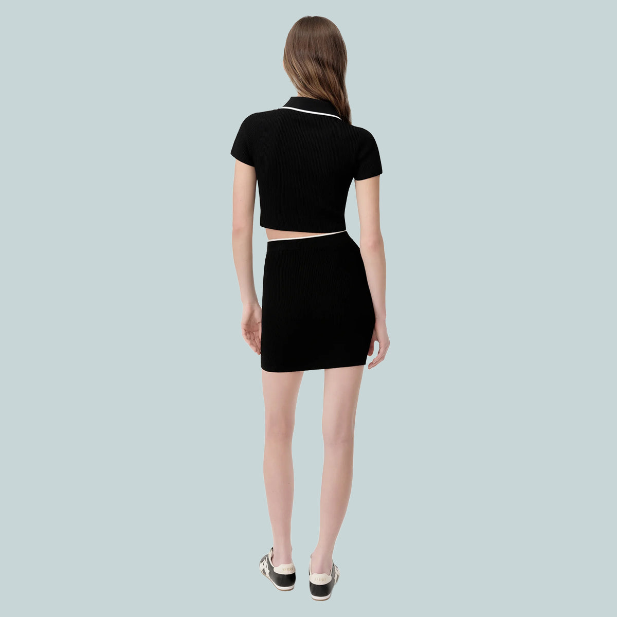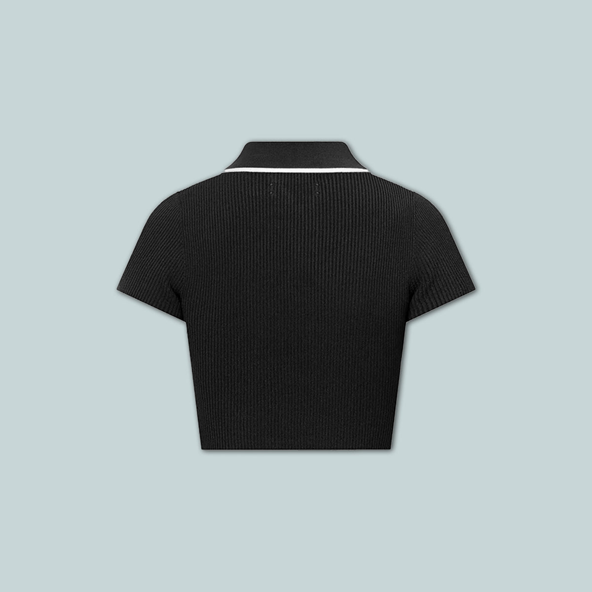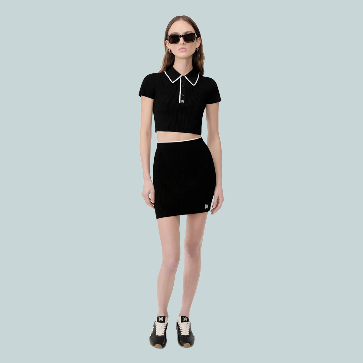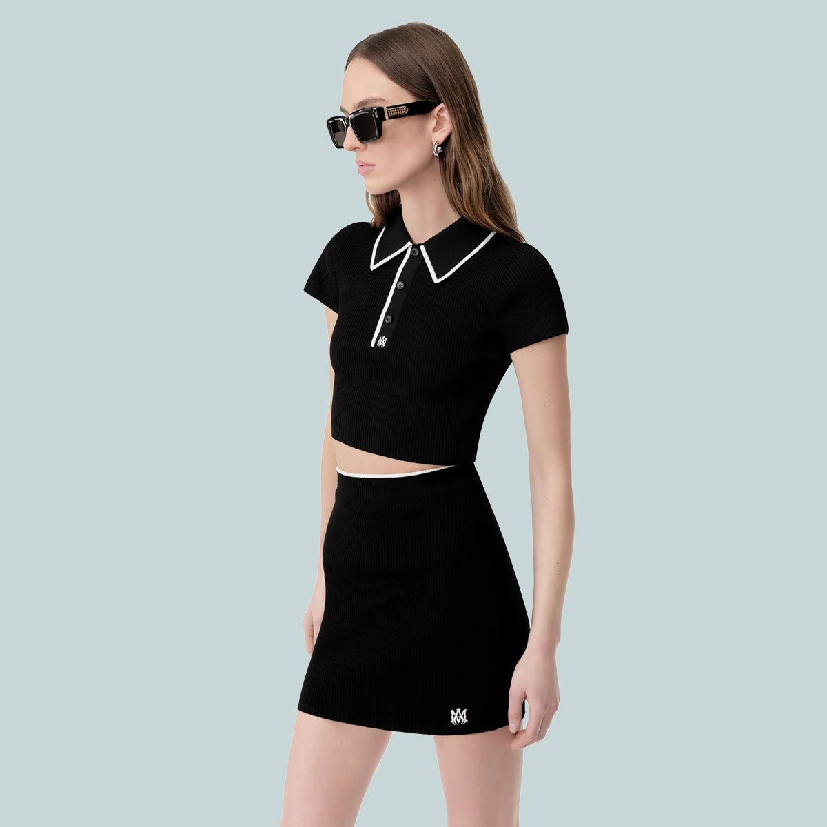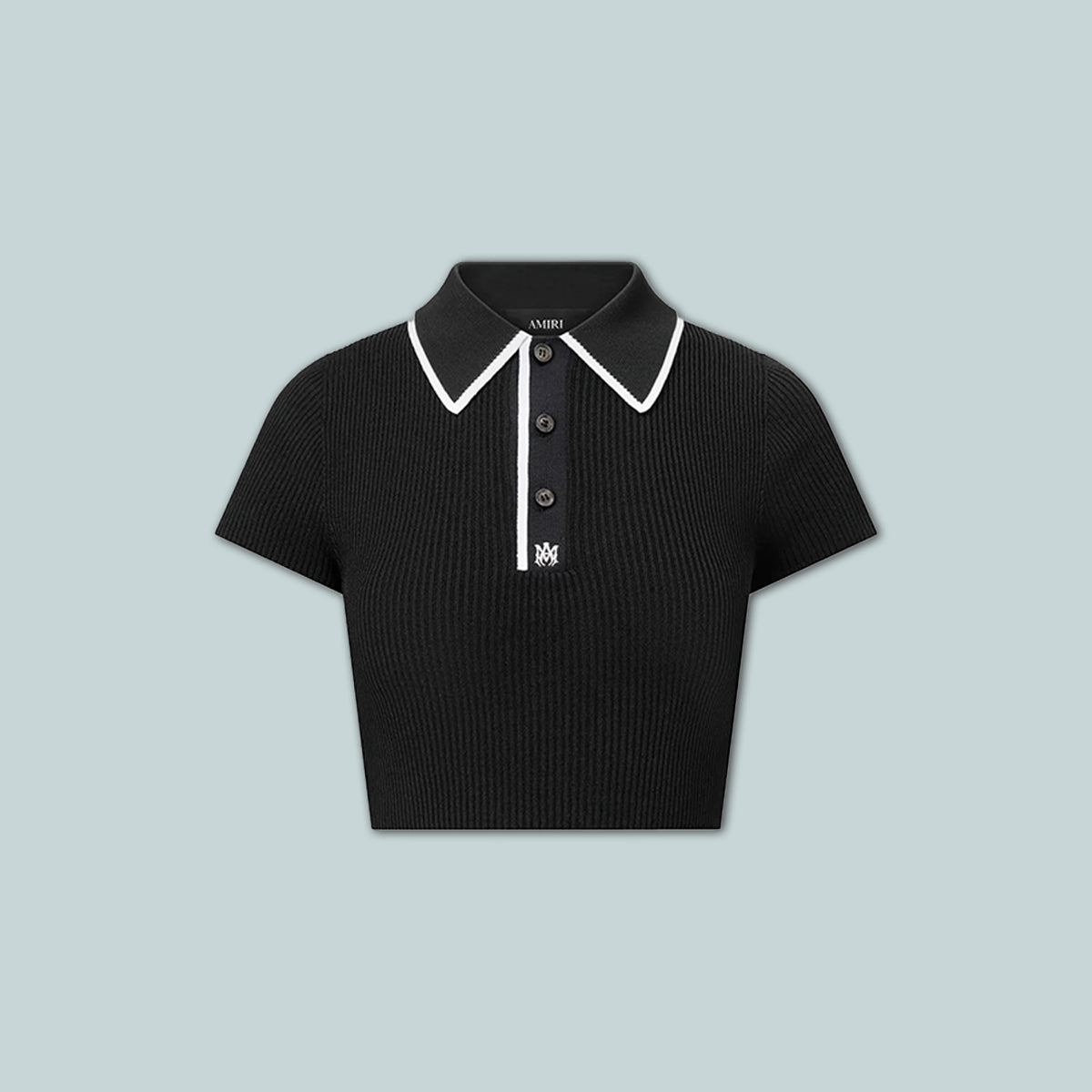 Pre-Fall 2025 womenswear continues to explore house signature motifs in novel interpretations. The MA Polo is designed in a rib knit and finished with three-button closure, MA icon embroidery, and contrast tipping at the collar.