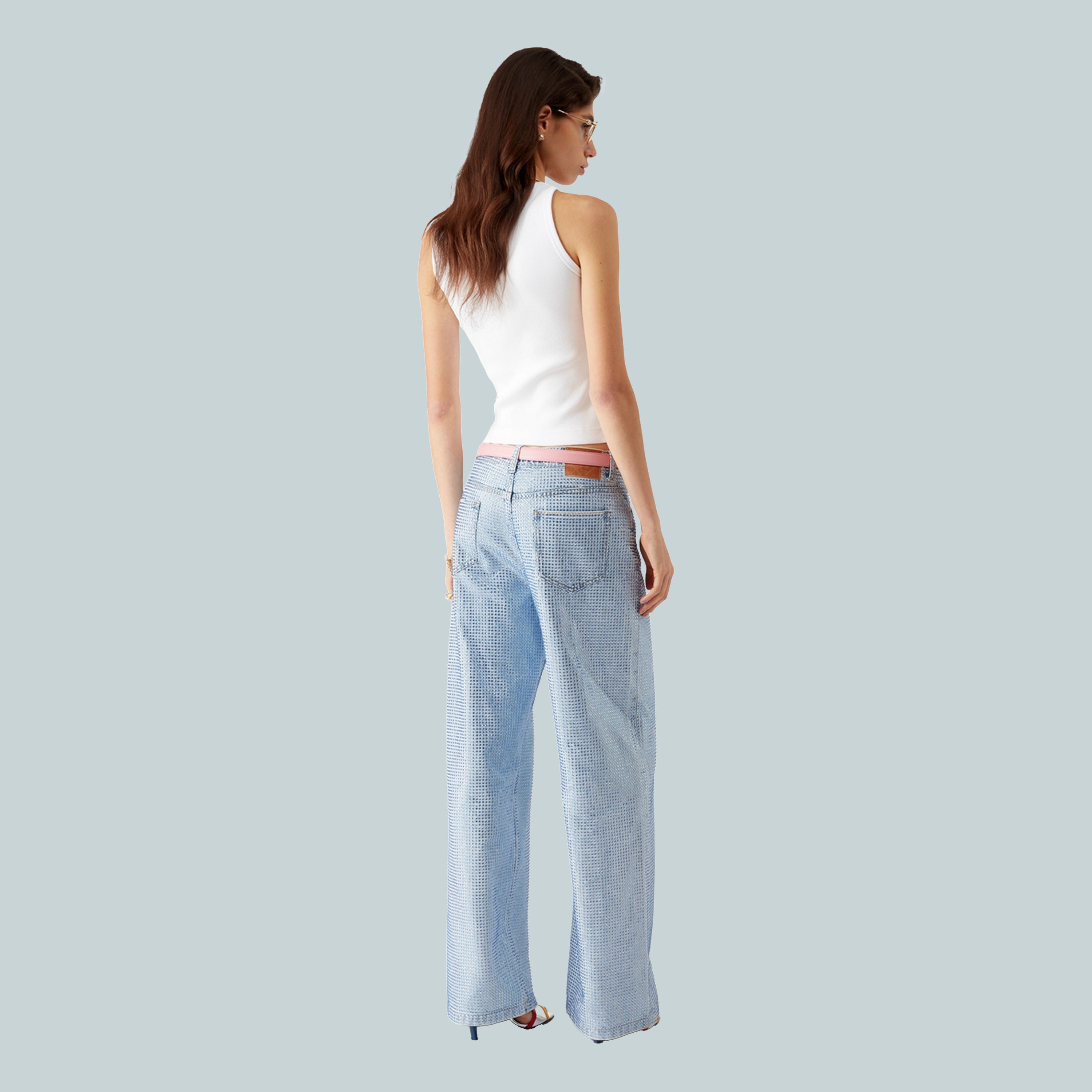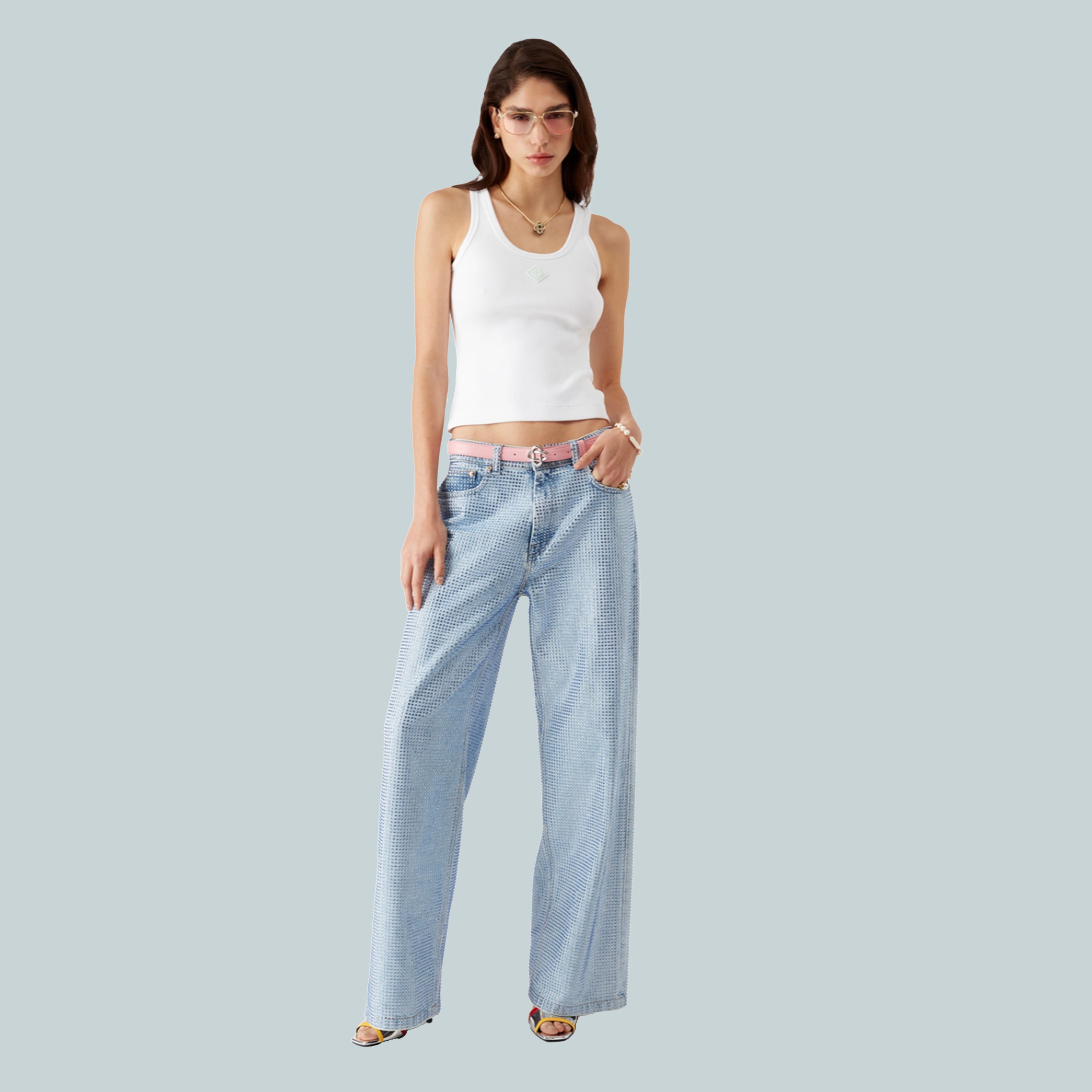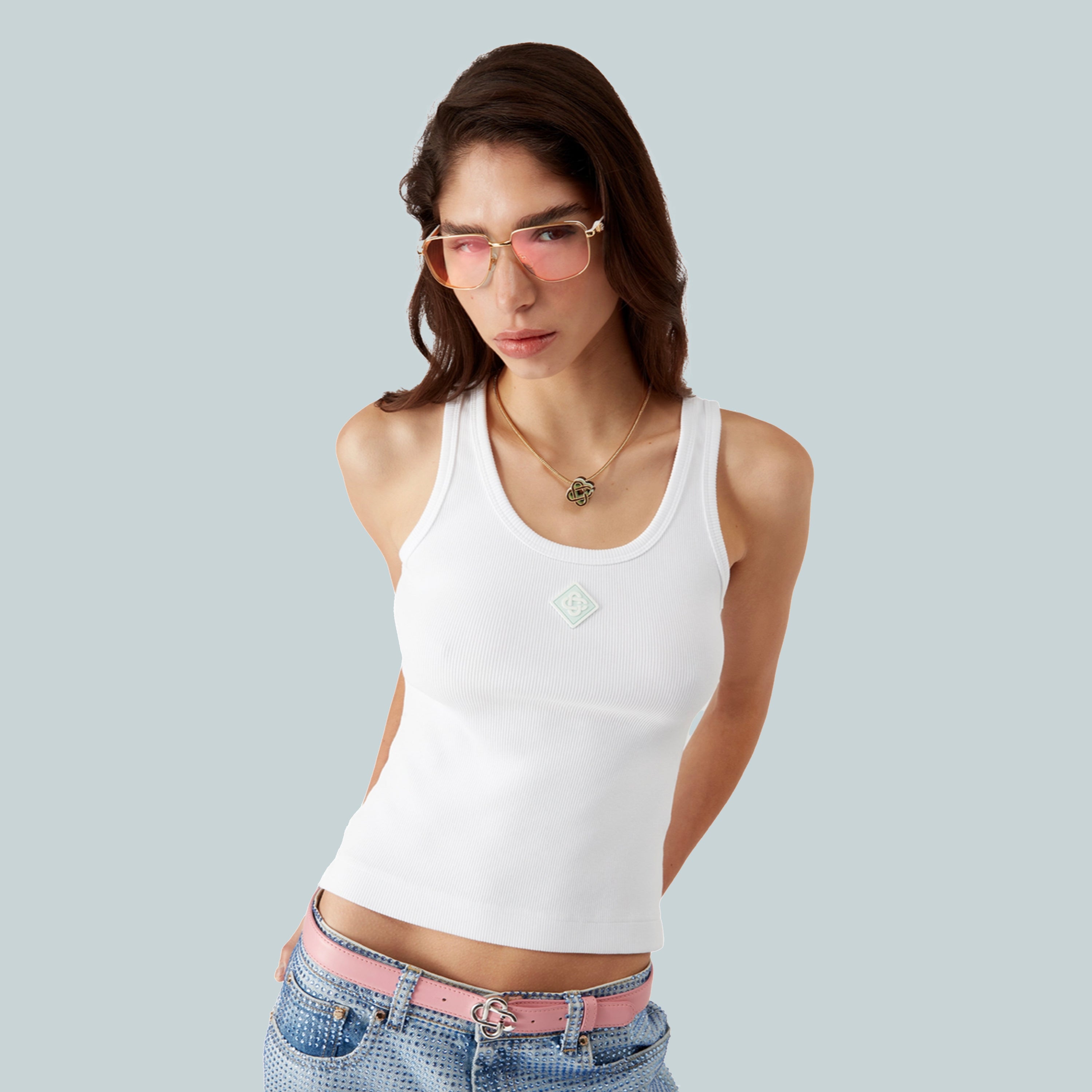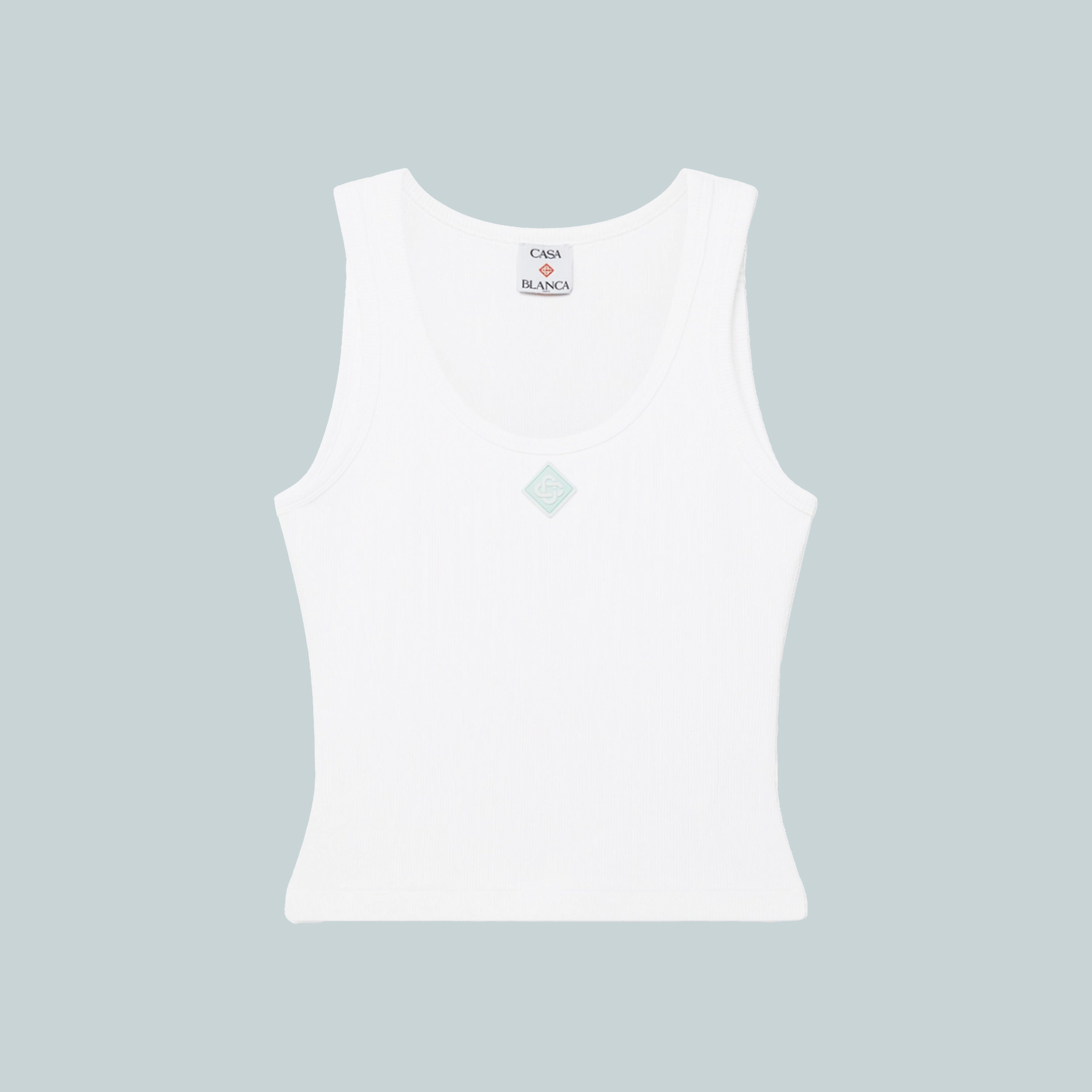 The ribbed jersey tank top is a sleeveless fitted short-style, crafted from ribbed jersey fabric. Completed with a silicon interlocking CC logo patch, a scoop neck, and white contrast wave pattern detail edges around the neck and armholes.