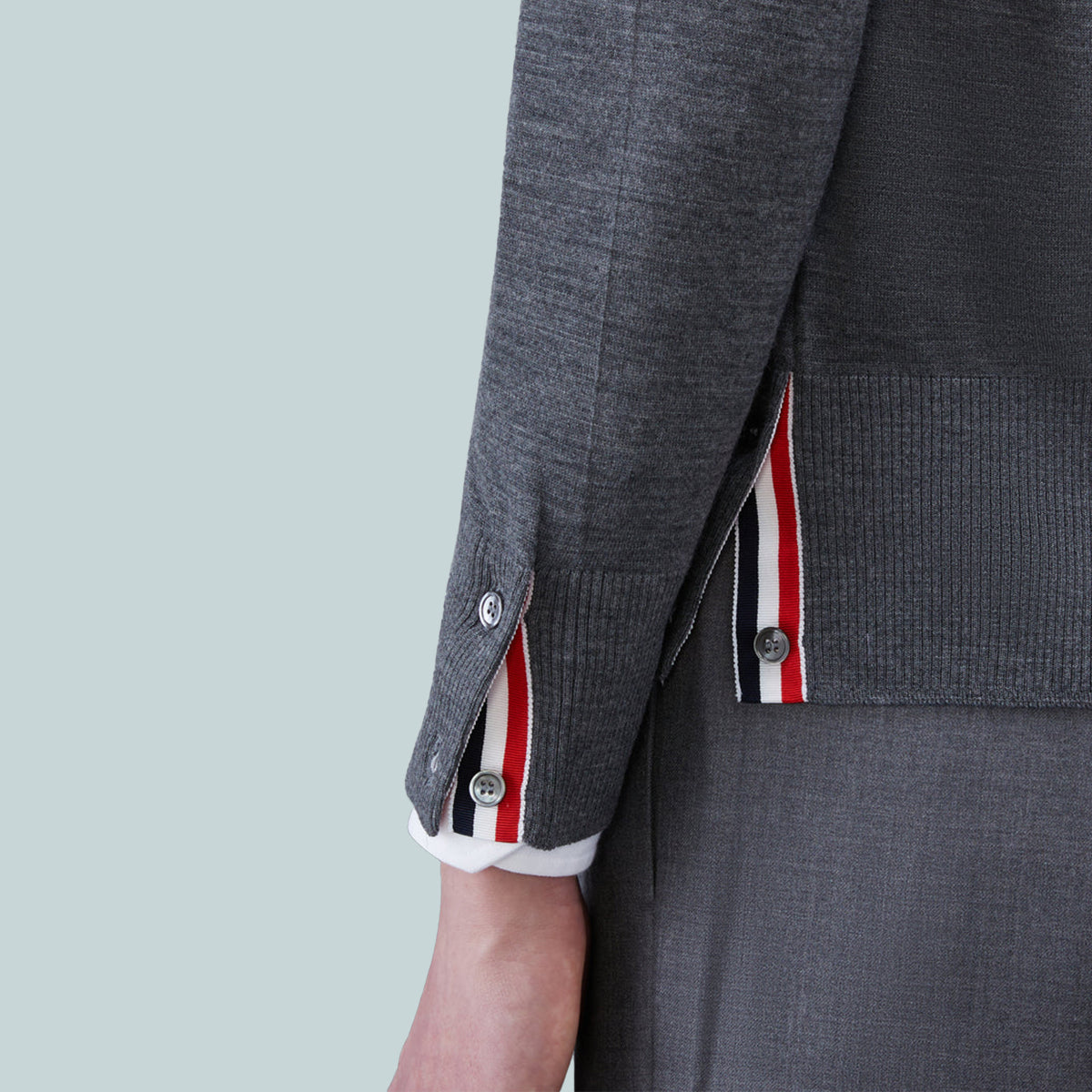 Buttoned side vents and cuffs with signature striped grosgrain trim