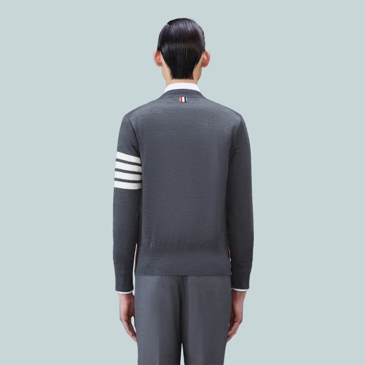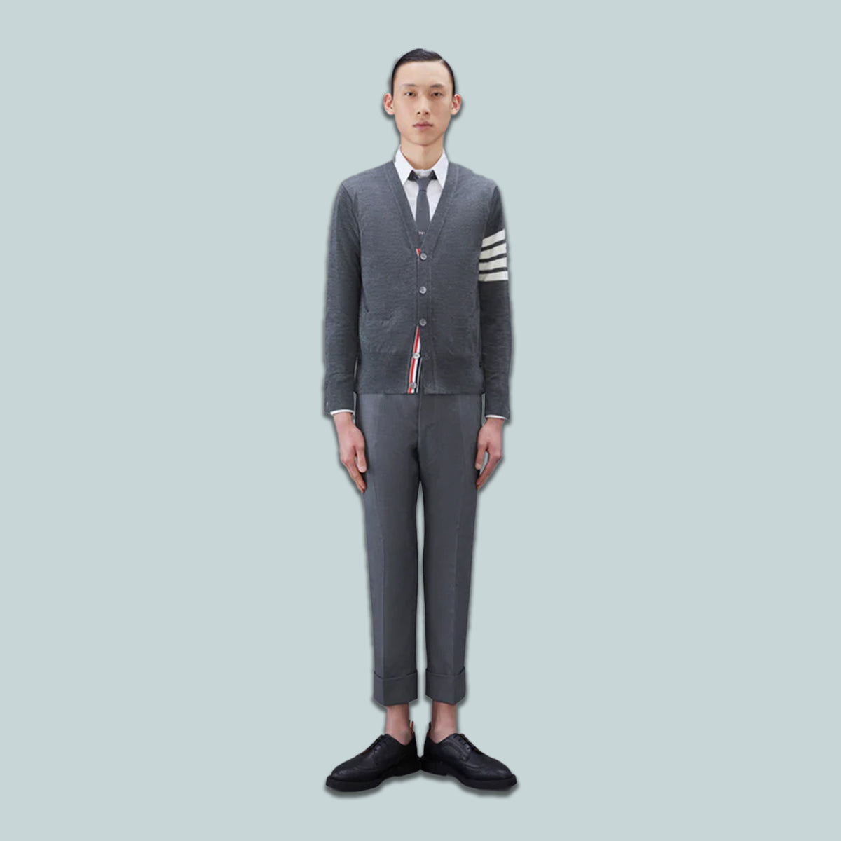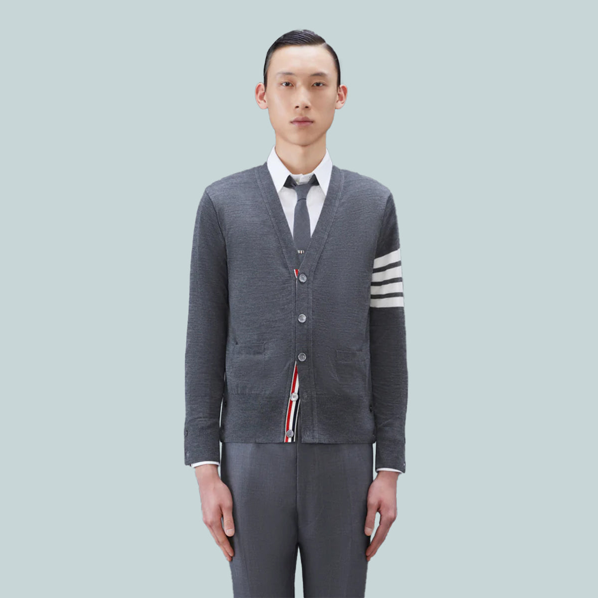 A Thom Browne emblem defines our Wool Classic V-neck Cardigan. 4-Bar stripes. Presented in fine merino wool fabric, this cardigan is a classic that stands the test of time.