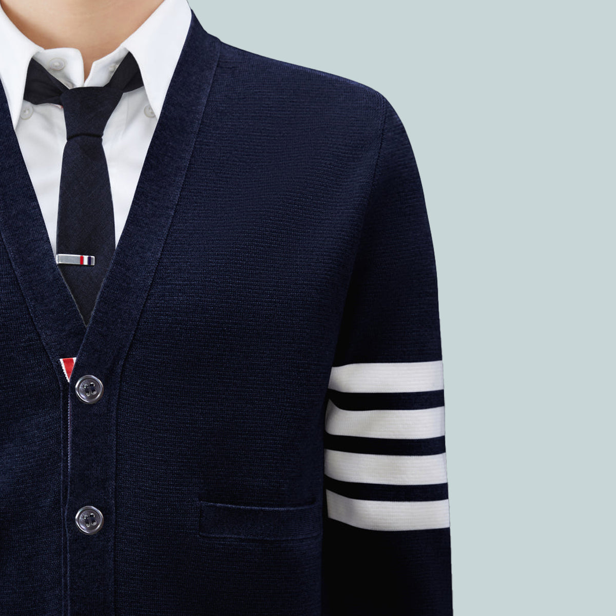 A Thom Browne emblem defines our Wool Classic V-neck Cardigan. 4-Bar stripes. Presented in fine merino wool fabric, this cardigan is a classic that stands the test of time.