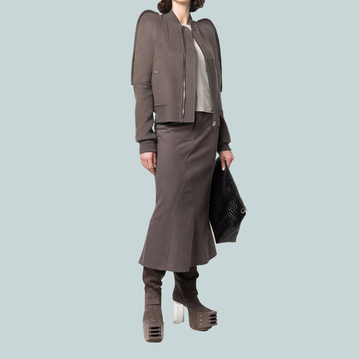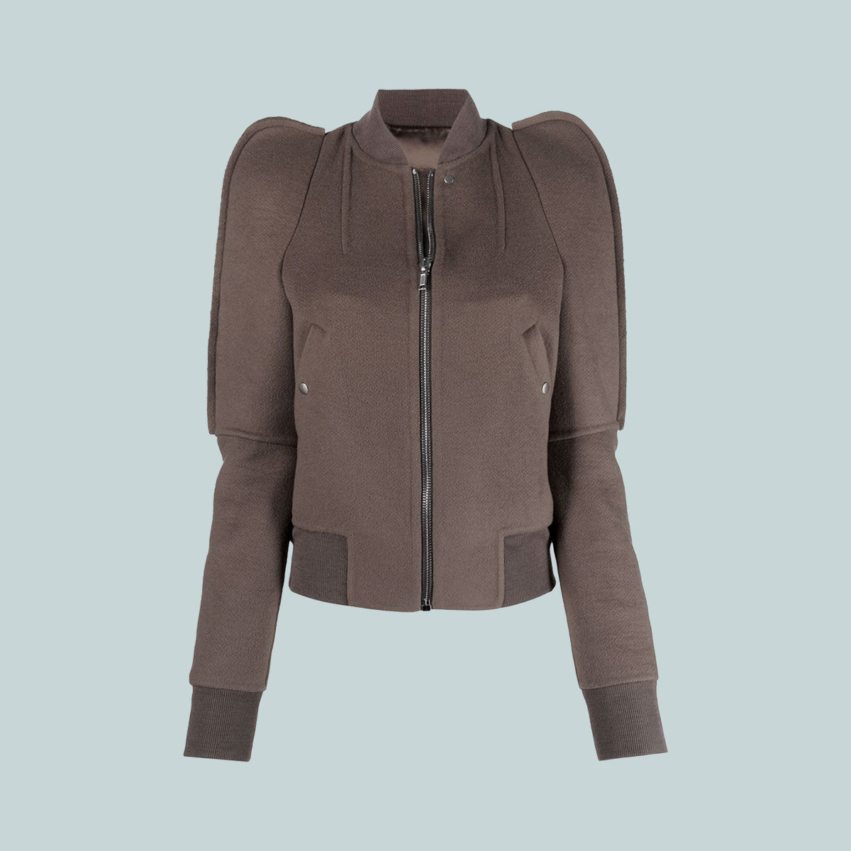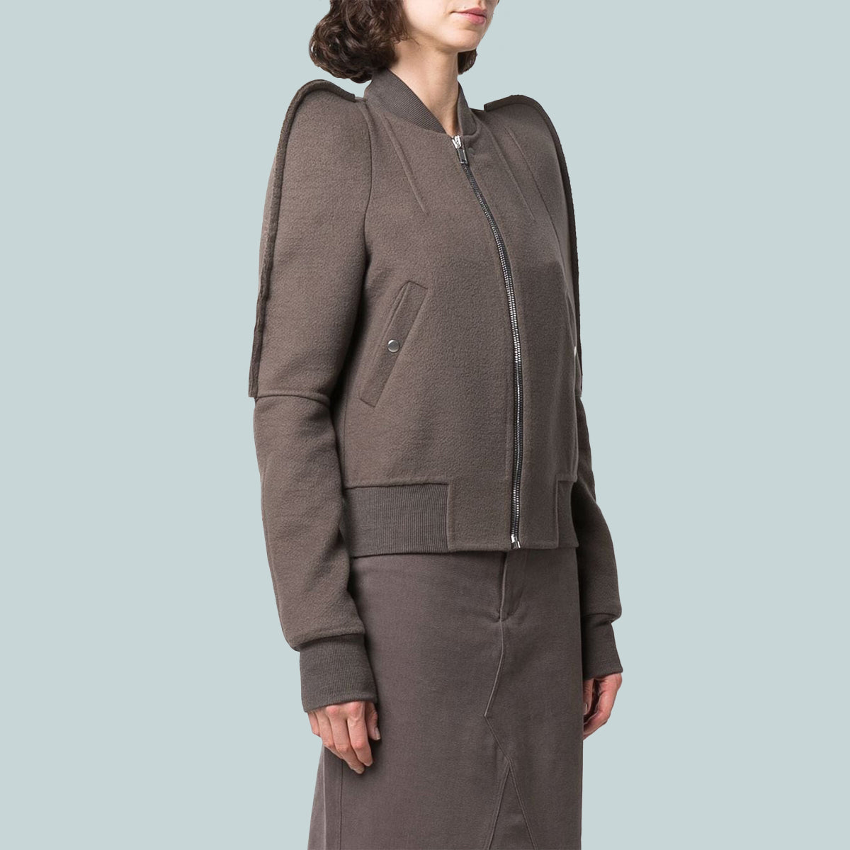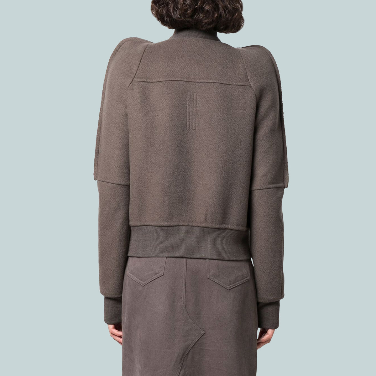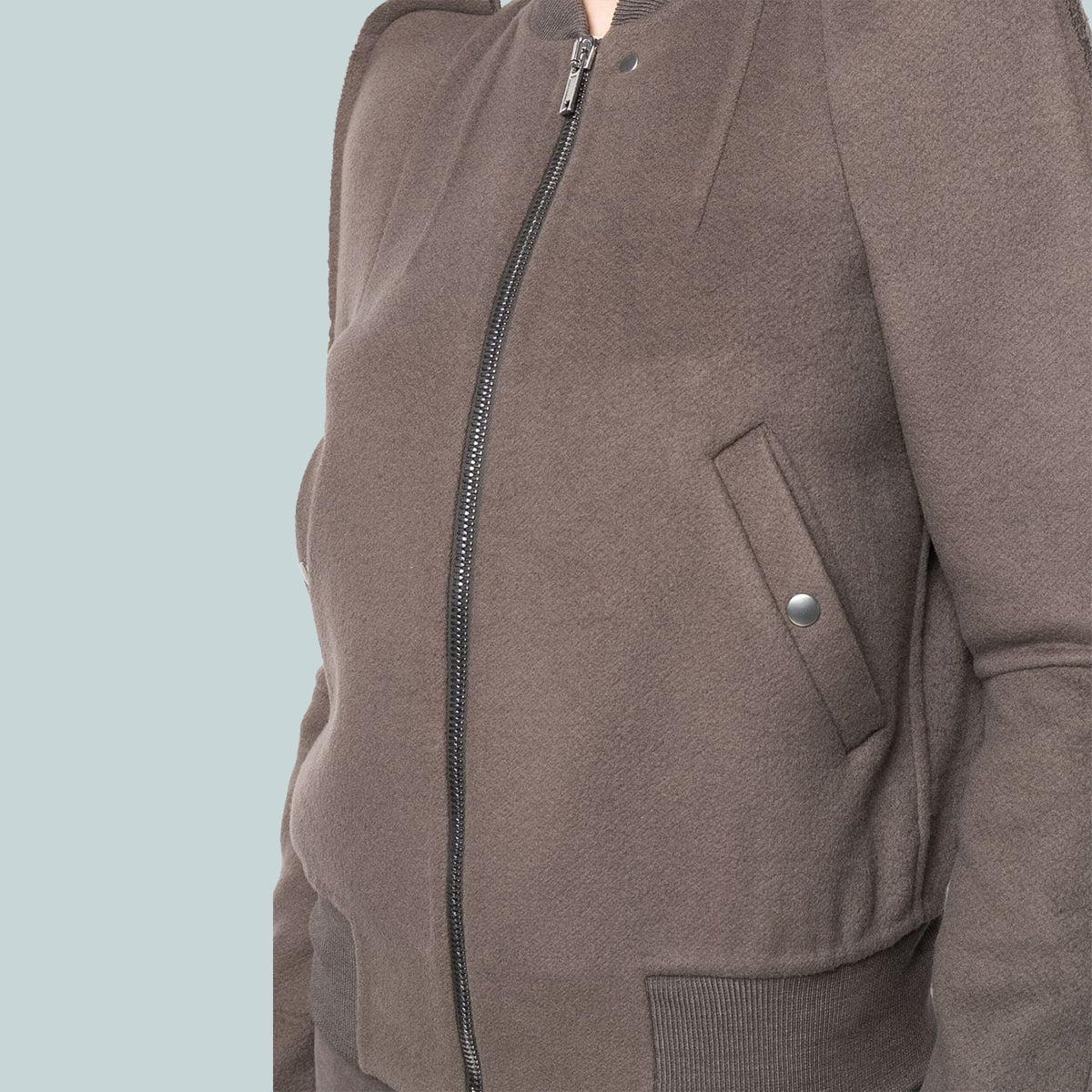 Ric Owens FW22 Strobe Zionic bomber in dust grey double cashmere. Below the waist in length with an off-centre zipper and V-neck. Rounded shoulders. Side snap pockets and ribbed waistband.