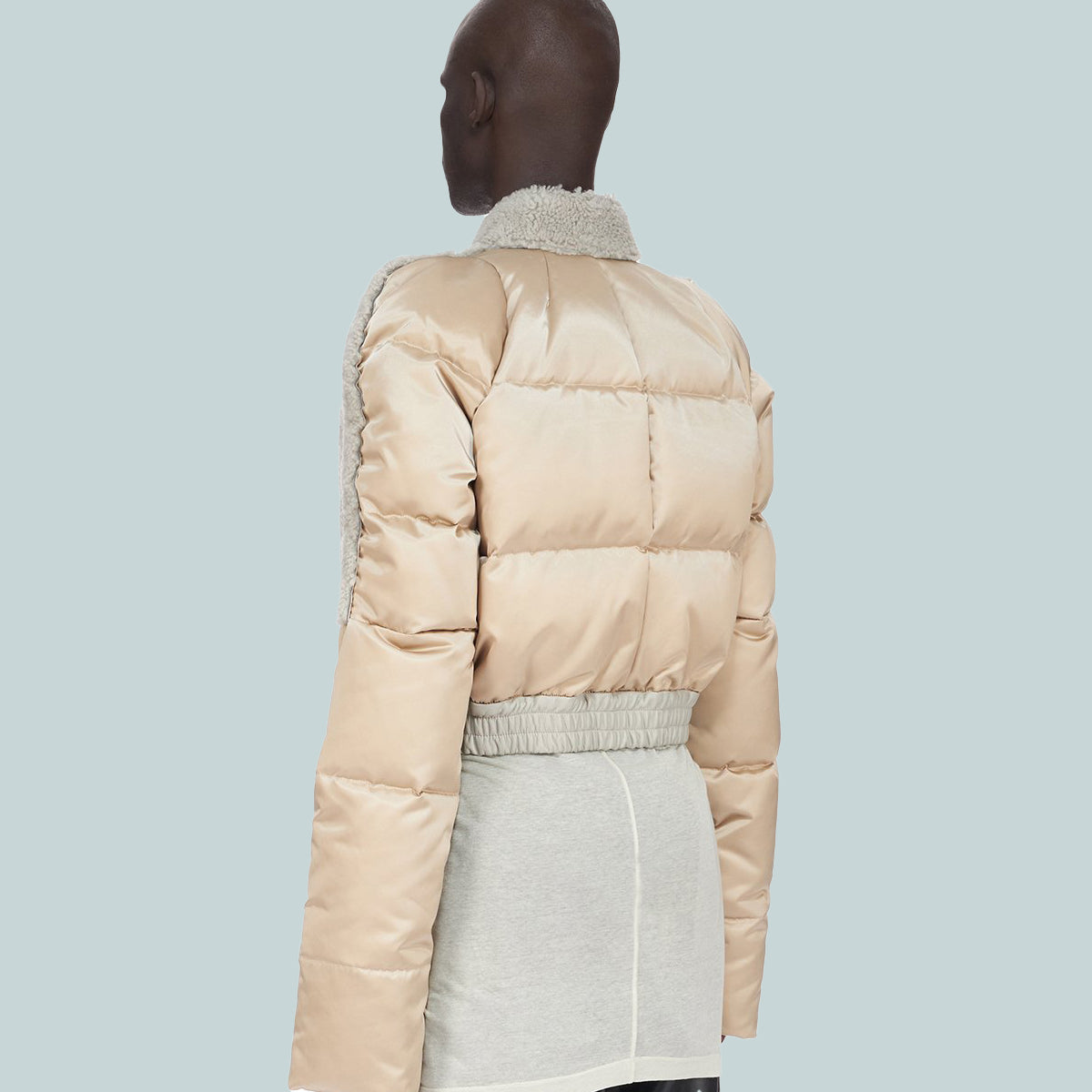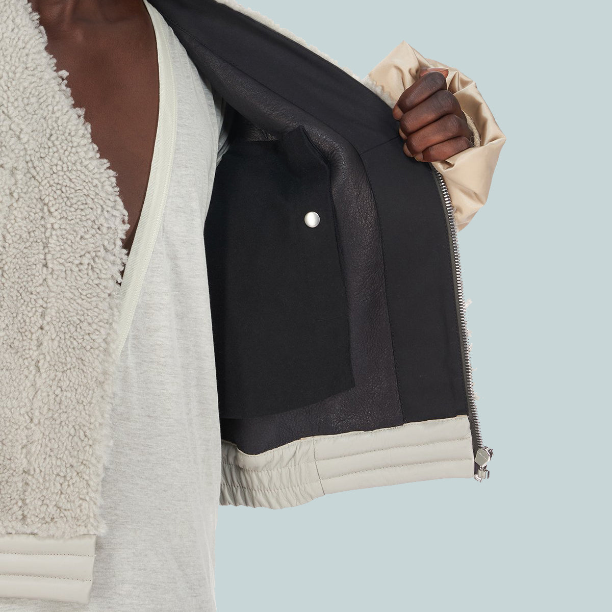 This is a combination of recycled bomber satin and palinoro lamb shearling.